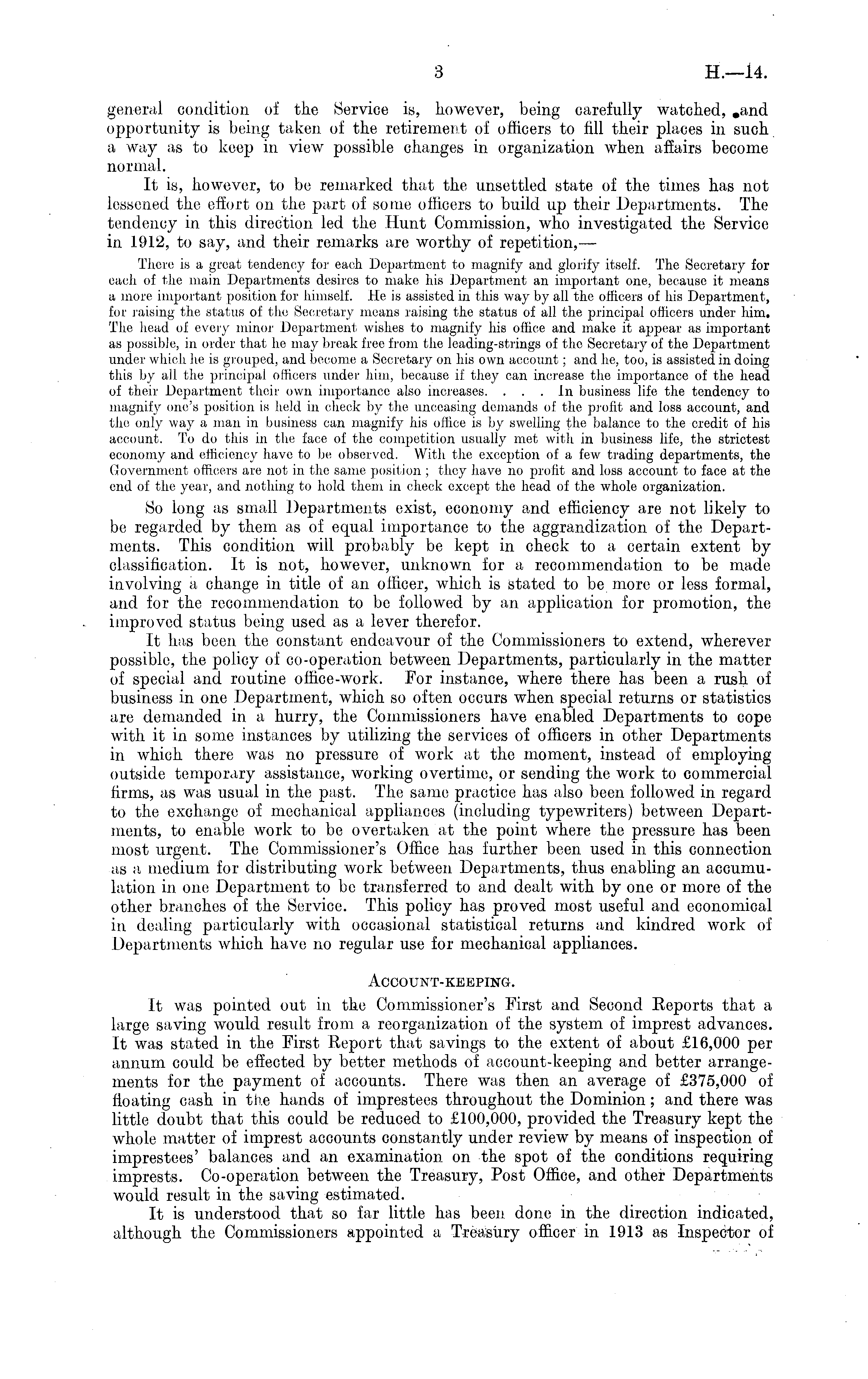 general condition of the Service is, however, being carefully watched, .and opportunity is being taken of the retirement of officers to fill their places in such a way as to keep in view possible changes in organization when affairs become normal. It is, however, to be remarked that the unsettled state of the times has not lessened the effort on the part of some officers to build up their Departments. The tendency in this direction led the Hunt Commission, who investigated the Service in 1912, to say, and their remarks are worthy of repetition,— There is a great tendency for each Department to magnify and glorify itself. The Secretary for each of the main Departments desires to make his Department an important one, because it means a more important position for himself. He is assisted in this way by all the officers of his Department, for raising the status of the Secretary means raising the status of all the principal officers under him. The head of every minor Department wishes to magnify his office and make it appear as important as possible, in order that he may break free from the leading-strings of the Secretary of the Department under which he is grouped, and become a Secretary on his own account; and he, too, is assisted in doing this by all the principal officers under him, because if they can increase the importance of the head of their Department their own importance also increases. ... In business life the tendency to magnify one's position is held in check by the unceasing demands of the profit and loss account, and the only way a man in business can magnify his office is by swelling the balance to the credit of his account. To do this in the face of the competition usually met with in business life, the strictest economy and efficiency have to be observed. With the exception of a few trading departments, the Government officers are not in the same position ; they have no profit and loss account to face at the end of the year, and nothing to hold them in check except the head of the whole organization. So long as small Departments exist, economy and efficiency are not likely to be regarded by them as of equal importance to the aggrandization of the Departments. This condition will probably be kept in check to a certain extent by classification. It is not, however, unknown for a recommendation to be made involving a change in title of an officer, which is Stated to be more or less formal, and for the recommendation to be followed by an application for promotion, the improved status being used as a lever therefor. It has been the constant endeavour of the Commissioners to extend, wherever possible, the policy of co-operation between Departments, particularly in the matter of special and routine office-work. For instance, where there has been a rush of business in one Department, which so often occurs when special returns or statistics are demanded in a hurry, the Commissioners have enabled Departments to cope with it in some instances by utilizing the services of officers in other Departments in which there was no pressure of work at the moment, instead of employing outside temporary assistance, working overtime, or sending the work to commercial firms, as was usual in the past. The same practice has also been followed in regard to the exchange of mechanical appliances (including typewriters) between Departments, to enable work to be overtaken at the point where the pressure has been most urgent. The Commissioner's Office has further been used in this connection as a medium for distributing work between Departments, thus enabling an accumulation in one Department to be transferred to and dealt with by one or more of the other branches of the Service. This policy has proved most useful and economical in dealing particularly with occasional statistical returns and kindred work of Departments which have no regular use for mechanical appliances. Account-keeping. It was pointed out in the Commissioner's First and Second Reports that a large saving would result from a reorganization of the system of imprest advances. It was stated in the First Report that savings to the extent of about £16,000 per annum could be effected by better methods of account-keeping and better arrangements for the payment of accounts. There was then an average of £375,000 of floating cash in the hands of imprestees throughout the Dominion; and there was little doubt that this could be reduced to £100,000, provided the Treasury kept the whole matter of imprest accounts constantly under review by means of inspection of imprestees' balances and an examination on the spot of the conditions requiring imprests. Co-operation between the Treasury, Post Office, and other Departments would result in the saving estimated. It is understood that so far little has been done in the direction indicated, although the Commissioners appointed a Treasury officer in 1913 m Inspector of