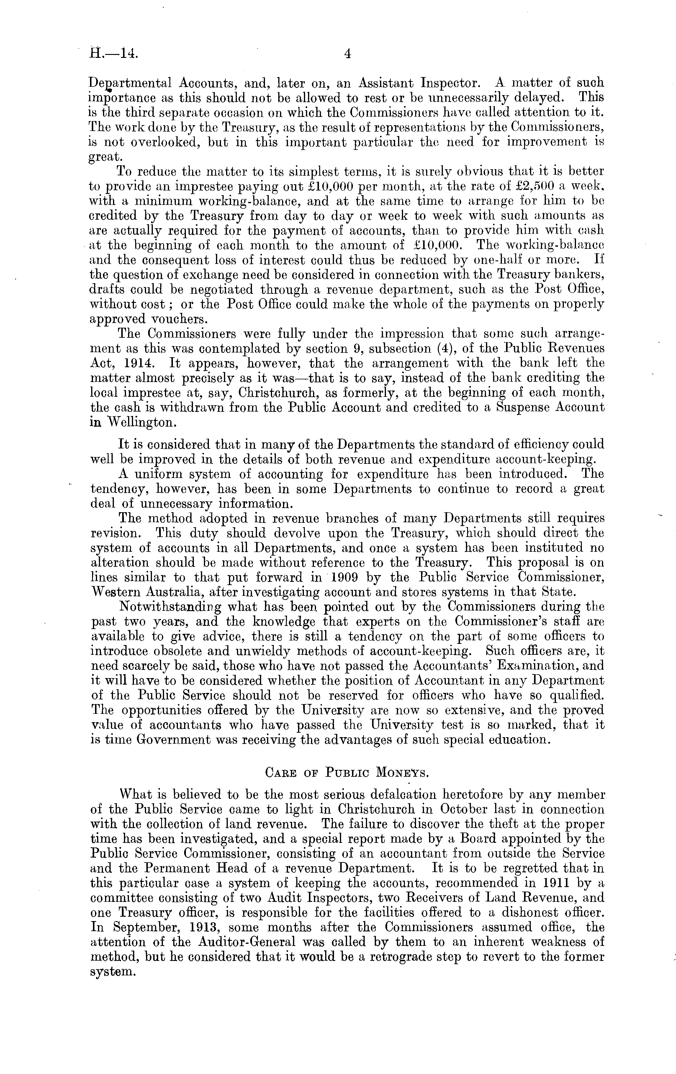 Departmental Accounts, and, later on, an Assistant Inspector. A matter of such importance as this should not be allowed to rest or be unnecessarily delayed. This is the third separate occasion on which the Commissioners have called attention to it. The work done by the Treasury, as the result of representations by the Commissioners, is not overlooked, but in this important particular the need for improvement is great. To reduce the matter to its simplest terms, it is surely obvious that it is better to provide an imprestee paying out £10,000 per month, at the rate of £2,500 a week, with a minimum working-balance, and at the same time to arrange for him to be credited by the Treasury from day to day or week to week with such amounts as are actually required for the payment of accounts, than to provide him with cash at the beginning of each month to the amount of £10,000. The working-balance and the consequent loss of interest could thus be reduced by one-half or more. If the question of exchange need be considered in connection with the Treasury bankers, drafts could be negotiated through a revenue department, such as the Post Office, without cost; or the Post Office could make the whole of the payments on properly approved vouchers. The Commissioners were fully under the impression that some such arrangement as this was contemplated by section 9, subsection (4), of the Public Revenues Act, 1914. It appears, however, that the arrangement with the bank left the matter almost precisely as it was—that is to say, instead of the bank crediting the local imprestee at, say, Christchurch, as formerly, at the beginning of each month, the cash is withdrawn from the Public Account and credited to a Suspense Account in Wellington. It is considered that in many of the Departments the standard of efficiency could well be improved in the details of both revenue and expenditure account-keeping. A uniform system of accounting for expenditure has been introduced. The tendency, however, has been in some Departments to continue to record a great deal of unnecessary information. The method adopted in revenue branches of many Departments still requires revision. This duty should devolve upon the Treasury, which should direct the system of accounts in all Departments, and once a system has been instituted no alteration should be made without reference to the Treasury. This proposal is on lines similar to that put forward in 1909 by the Public Service Commissioner, Western Australia, after investigating account and stores systems in that State. Notwithstanding what has been, pointed out by the Commissioners during the past two years, and the knowledge that experts on the Commissioner's staff are available to give advice, there is still a tendency on the part of some officers to introduce obsolete and unwieldy methods of account-keeping. Such officers are, it need scarcely be said, those who have not passed the Accountants' Examination, and it will have to be considered whether the position of Accountant in any Department of the Public Service should not be reserved for officers who have so qualified. The opportunities offered by the University are now so extensive, and the proved value of accountants who have passed the University test is so marked, that it is time Government was receiving the advantages of such special education. Care of Public Moneys. What is believed to be the most serious defalcation heretofore by any member of the Public Service came to light in Christchurch in October last in connection with the collection of land revenue. The failure to discover the theft at the proper time has been investigated, and a special report made by a Board appointed by the Public Service Commissioner, consisting of an accountant from outside the Service and the Permanent Head of a revenue Department. It is to be regretted that in this particular case a system of keeping the accounts, recommended in 1911 by a committee consisting of two Audit Inspectors, two Receivers of Land Revenue, and one Treasury officer, is responsible for the facilities offered to a dishonest officer. In September, 1913, some months after the Commissioners assumed office, the attention of the Auditor-General was called by them to an inherent Weakness of method, but he considered that it would be a retrograde step to revert to the former system.