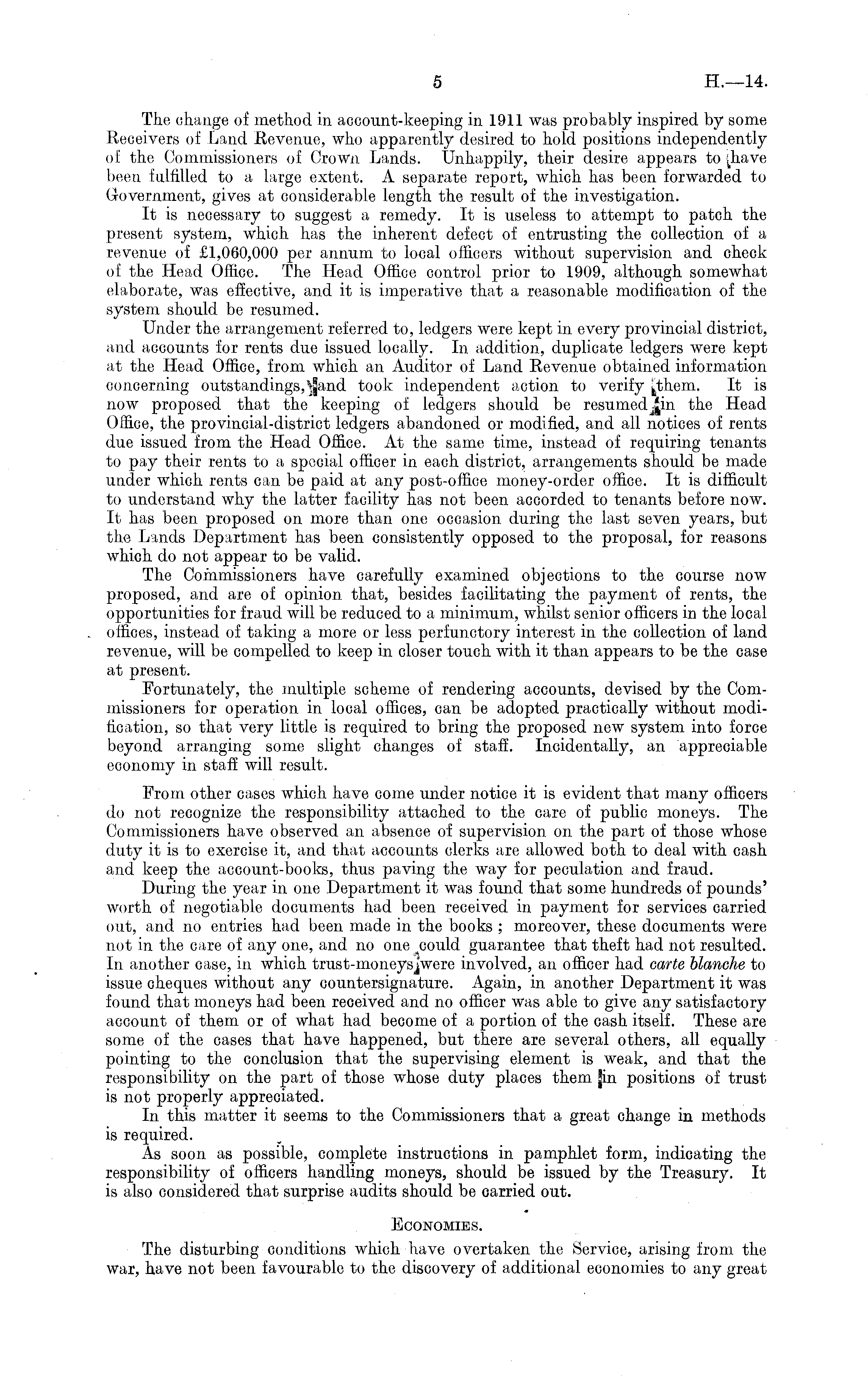 The change of method in account-keeping in 1911 was probably inspired by some Receivers of Land Revenue, who apparently desired to hold positions independently of the Commissioners of Crown Lands. Unhappily, their desire appears to jhave been fulfilled to a large extent. A separate report, which has been forwarded to Government, gives at considerable length the result of the investigation. It is necessary to suggest a remedy. It is useless to attempt to patch the present system, which has the inherent defect of entrusting the collection of a revenue of £1,060,000 per annum to local officers without supervision and check of the Head Office. The Head Office control prior to 1909, although somewhat elaborate, was effective, and it is imperative that a reasonable modification of the system should be resumed. Under the arrangement referred to, ledgers were kept in every provincial district, and accounts for rents due issued locally. In addition, duplicate ledgers were kept at the Head Office, from which an Auditor of Land Revenue obtained information concerning outstandings,*]|and took independent action to verify It is now proposed that the keeping of ledgers should be resumedjiin the Head Office, the provincial-district ledgers abandoned or modified, and all notices of rents due issued from the Head Office. At the same time, instead of requiring tenants to pay their rents to a special officer in each district, arrangements should be made under which rents can be paid at any post-office money-order office. It is difficult to understand why the latter facility has not been accorded to tenants before now. It has been proposed on more than one occasion during the last seven years, but the Lands Department has been consistently opposed to the proposal, for reasons which do not appear to be valid. The Commissioners have carefully examined objections to the course now proposed, and are of opinion that, besides facilitating the payment of rents, the opportunities for fraud will be reduced to a minimum, whilst senior officers in the local offices, instead of taking a more or less perfunctory interest in the collection of land revenue, will be compelled to keep in closer touch with it than appears to be the case at present. Fortunately, the multiple scheme of rendering accounts, devised by the Commissioners for operation in local offices, can be adopted practically without modification, so that very little is required to bring the proposed new system into force beyond arranging some slight changes of staff. Incidentally, an appreciable economy in staff will result. From other cases which have come under notice it is evident that many officers do not recognize the responsibility attached to the care of public moneys. The Commissioners have observed an absence of supervision on the part of those whose duty it is to exercise it, and that accounts clerks are allowed both to deal with cash and keep the account-books, thus paving the way for peculation and fraud. During the year in one Department it was found that some hundreds of pounds' worth of negotiable documents had been received in payment for services carried out, and no entries had been made in the books ; moreover, these documents were not in the care of any one, and no guarantee that theft had not resulted. In another case, in which trust-moneysjwere involved, an officer had carte blanche to issue cheques without any countersignature. Again, in another Department it was found that moneys had been received and no officer was able to give any satisfactory account of them or of what had become of a portion of the cash itself. These are some of the cases that have happened, but there are several others, all equally pointing to the conclusion that the supervising element is weak, and that the responsibility on the part of those whose duty places them |in positions of trust is not properly appreciated. In this matter it seems to the Commissioners that a great change in methods is required. As soon as possible, complete instructions in pamphlet form, indicating the responsibility of officers handling moneys, should be issued by the Treasury. It is also considered that surprise audits should be carried out. Economies. The disturbing conditions which have overtaken the Service, arising from the war, have not been favourable to the discovery of additional economies to any great