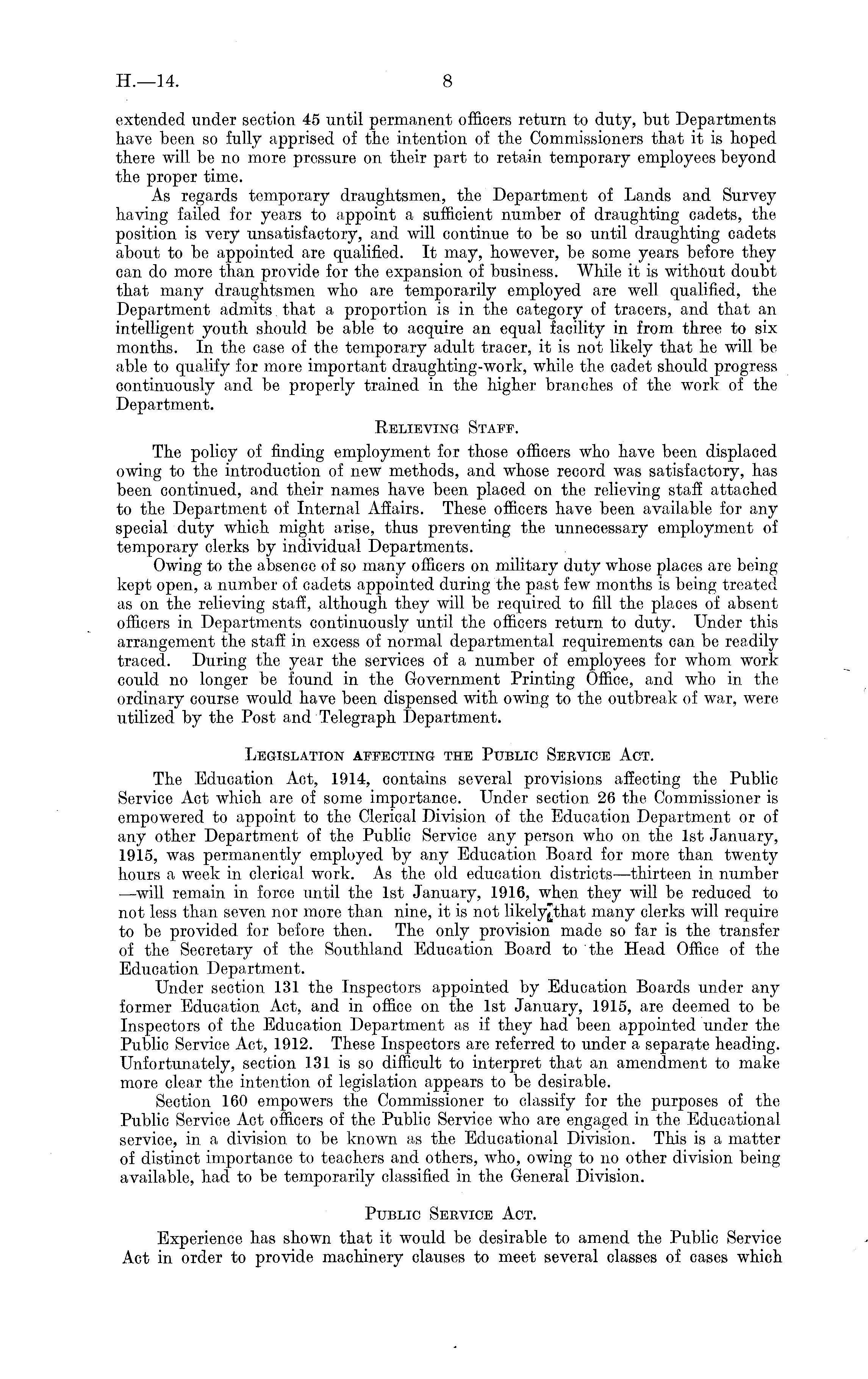extended under section 45 until permanent officers return to duty, but Departments have been so fully apprised of the intention of the Commissioners that it is hoped there will be no more pressure on their part to retain temporary employees beyond the proper time. As regards temporary draughtsmen, the Department of Lands and Survey having failed for years to appoint a sufficient number of draughting cadets, the position is very unsatisfactory, and will continue to be so until draughting cadets about to be appointed are qualified. It may, however, be some years before they can do more than provide for the expansion of business. While it is without doubt that many draughtsmen who are temporarily employed are well qualified, the Department admits that a proportion is in the category of tracers, and that an intelligent youth should be able to acquire an equal facility in from three to six months. In the case of the temporary adult tracer, it is not likely that he will be able to qualify for more important draughting-work, while the cadet should progress continuously and be properly trained in the higher branches of the work of the Department. Relieving Staff. The policy of finding employment for those officers who have been displaced owing to the introduction of new methods, and whose record was satisfactory, has been continued, and their names have been placed on the relieving staff attached to the Department of Internal Affairs. These officers have been available for any special duty which might arise, thus preventing the unnecessary employment of temporary clerks by individual Departments. Owing to the absence of so many officers on military duty whose places are being kept open, a number of cadets appointed during the past few months is being treated as on the relieving staff, although they will be required to fill the places of absent officers in Departments continuously until the officers return to duty. Under this arrangement the staff in excess of normal departmental requirements can be readily traced. During the year the services of a number of employees for whom work could no longer be found in the Government Printing Office, and who in the ordinary course would have been dispensed with owing to the outbreak of war, were utilized by the Post and Telegraph Department. Legislation affecting the Public Service Act. The Education Act, 1914, contains several provisions affecting the Public Service Act which are of some importance. Under section 26 the Commissioner is empowered to appoint to the Clerical Division of the Education Department or of any other Department of the Public Service any person who on the Ist January, 1915, was permanently employed by any Education Board for more than twenty hours a week in clerical work. As the old education districts—thirteen in number —will remain in force until the Ist January, 1916, when they will be reduced to not less than seven nor more than nine, it is not many clerks will require to be provided for before then. The only provision, made so far is the transfer of the Secretary of the Southland Education Board to the Head Office of the Education Department. Under section 131 the Inspectors appointed by Education Boards under any former Education Act, and in office on the Ist January, 1915, are deemed to be Inspectors of the Education Department as if they had been appointed under the Public Service Act, 1912. These Inspectors are referred to under a separate heading. Unfortunately, section 131 is so difficult to interpret that an amendment to make more clear the intention of legislation appears to be desirable. Section 160 empowers the Commissioner to classify for the purposes of the Public Service Act officers of the Public Service who are engaged in the Educational service, in a division to be known as the Educational Division. This is a matter of distinct importance to teachers and others, who, owing to no other division being available, had to be temporarily classified in the General Division. Public Service Act. Experience has shown that it would be desirable to amend the Public Service Act in order to provide machinery clauses to meet several classes of cases which