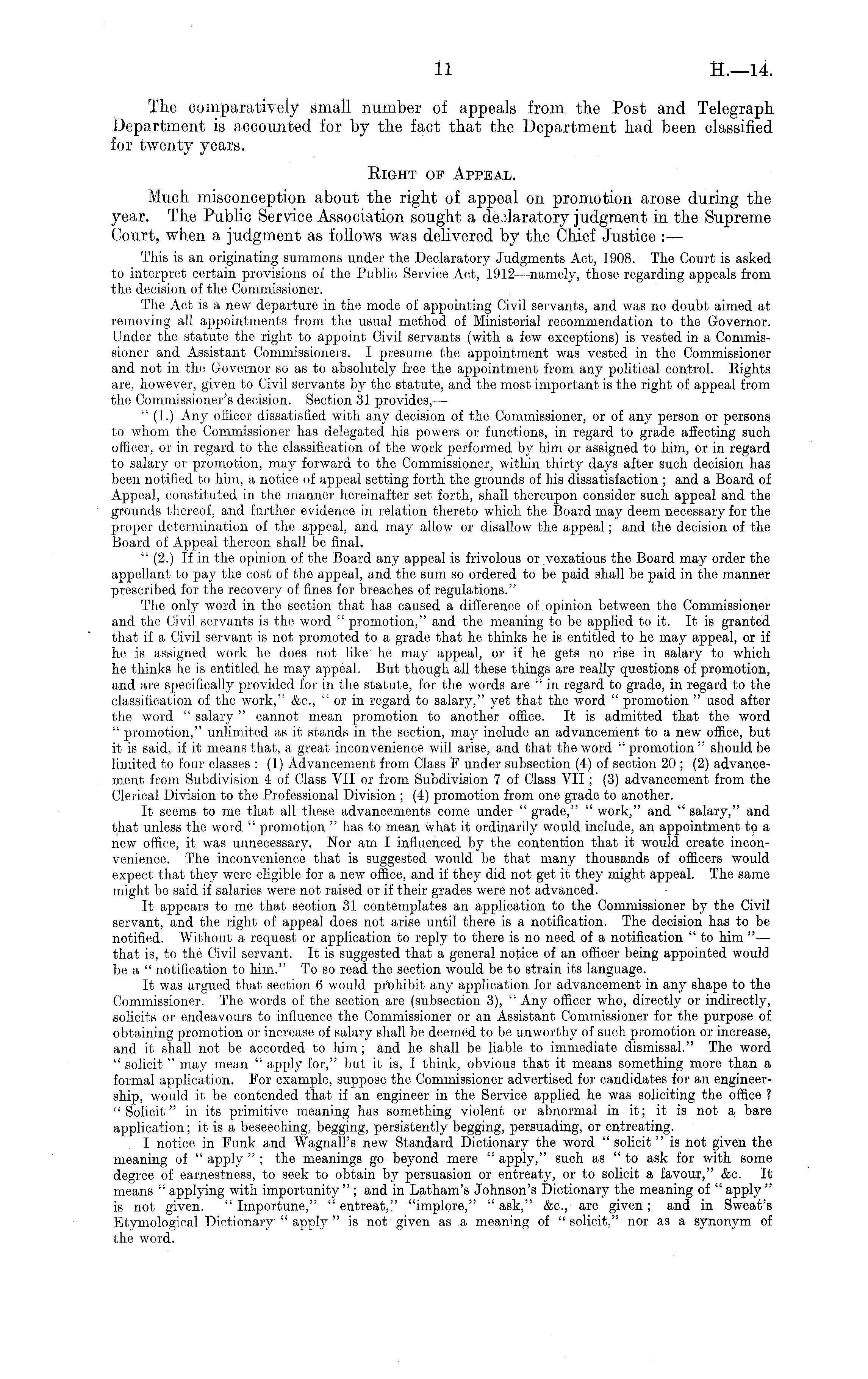 The comparatively small number of appeals from the Post and Telegraph Department is accounted for by the fact that the Department had been, classified for twenty years. Right of Appeal. Much misconception about the right of appeal on promotion arose during the year. The Public Service Association sought a declaratory judgment in the Supreme Court, when a judgment as follows was delivered by the Chief Justice : — This is an originating summons under the Declaratory Judgments Act, 1908. The Court is asked to interpret certain provisions of the Public Service Act, 1912 —namely, those regarding appeals from the decision of the Commissioner, The Act is a new departure in the mode of appointing Civil servants, and was no doubt aimed at removing all appointments from the usual method of Ministerial recommendation to the Governor. Under the statute the right to appoint Civil servants (with a few exceptions) is vested in a Commissioner and Assistant Commissioners. I presume the appointment was vested in the Commissioner and not in the Governor so as to absolutely free the appointment from any political control. Eights are, however, given to Civil servants by the statute, and the most important is the right of appeal from the Commissioner's decision. Section 31 provides,— " (I.) Any officer dissatisfied with any decision of the Commissioner, or of any person or persons to whom the Commissioner has delegated his powers or functions, in regard to grade affecting such officer, or in regard to the classification of the work performed by him or assigned to him, or in regard to salary or promotion, may forward to the Commissioner, within thirty days after such decision has been notified to him, a notice of appeal setting forth the grounds of his dissatisfaction ; and a Board of Appeal, constituted in the manner hereinafter set forth, shall thereupon consider such appeal and the grounds thereof, and further evidence in relation thereto which the Board may deem necessary for the proper determination of the appeal, and may allow or disallow the appeal; and the decision of the Board of Appeal thereon shall be final. " (2.) If in the opinion of the Board any appeal is frivolous or vexatious the Board may order the appellant to pay the cost of the appeal, and the sum so ordered to be paid shall be paid in the manner prescribed for the recovery of fines for breaches of regulations." The only word in the section that has caused a difference of opinion between the Commissioner and the Civil servants is the word " promotion," and the meaning to be applied to it. It is granted that if a Civil servant is not promoted to a grade that he thinks he is entitled to he may appeal, or if he is assigned work he does not like he may appeal, or if he gets no rise in salary to which he thinks he is entitled he may appeal. But though all these things are really questions of promotion, and are specifically provided for in the statute, for the words are ' in regard to grade, in regard to the classification of the work," &c, " or in regard to salary," yet that the word " promotion " used after the word " salary" cannot mean promotion to another office. It is admitted that the word " promotion," unlimited as it stands in the section, may include an advancement to a now office, but it is said, if it means that, a great inconvenience will arise, and that the word " promotion " should be limited to four classes : (1) Advancement from Class F under subsection (4) of section 20 ; (2) advancement from Subdivision 4of Class VII or from Subdivision 7of Class VII; (3) advancement from the Clerical Division to the Professional Division ; (4) promotion from one grade to another. It seems to me that all these advancements come under " grade," " work," and " salary," and that unless the word " promotion " has to mean what it ordinarily would include, an appointment to a new office, it was unnecessary. Nor am I influenced by the contention that it would create inconvenience. The inconvenience that is suggested would be that many thousands of officers would expect that they were eligible for a new office, and if they did not get it they might appeal. The same might be said if salaries were not raised or if their grades were not advanced. It appears to me that section 31 contemplates an application to the Commissioner by the Civil servant, and the right of appeal does not arise until there is a notification. The decision has to be notified. Without a request or application to reply to there is no need of a notification "to him " — that is, to the Civil servant. It is suggested that a general notice of an officer being appointed would be a " notification to him." To so read the section would be to strain its language. It was argued that section 6 would prohibit any application for advancement in any shape to the Commissioner. The words of the section are (subsection 3), " Any officer who, directly or indirectly, solicits or endeavours to influence the Commissioner or an Assistant Commissioner for the purpose of obtaining promotion or increase of salary shall be deemed to be unworthy of such promotion or increase, and it shall not be accorded to him ; and he shall be liable to immediate dismissal." The word " solicit " may mean " apply for," but it is, I think, obvious that it means something more than a formal application. For example, suppose the Commissioner advertised for candidates for an engineership, would it be contended that if an engineer in the Service applied he was soliciting the office ? "Solicit" in its primitive meaning has something violent or abnormal in it; it is not a bare application; it is a beseeching, begging, persistently begging, persuading, or entreating. I notice in Funk and Wagnall's new Standard Dictionary the word " solicit " is not given the meaning of " apply " ; the meanings go beyond mere " apply," such as "to ask for with some degree of earnestness, to seek to obtain by persuasion or entreaty, or to solic