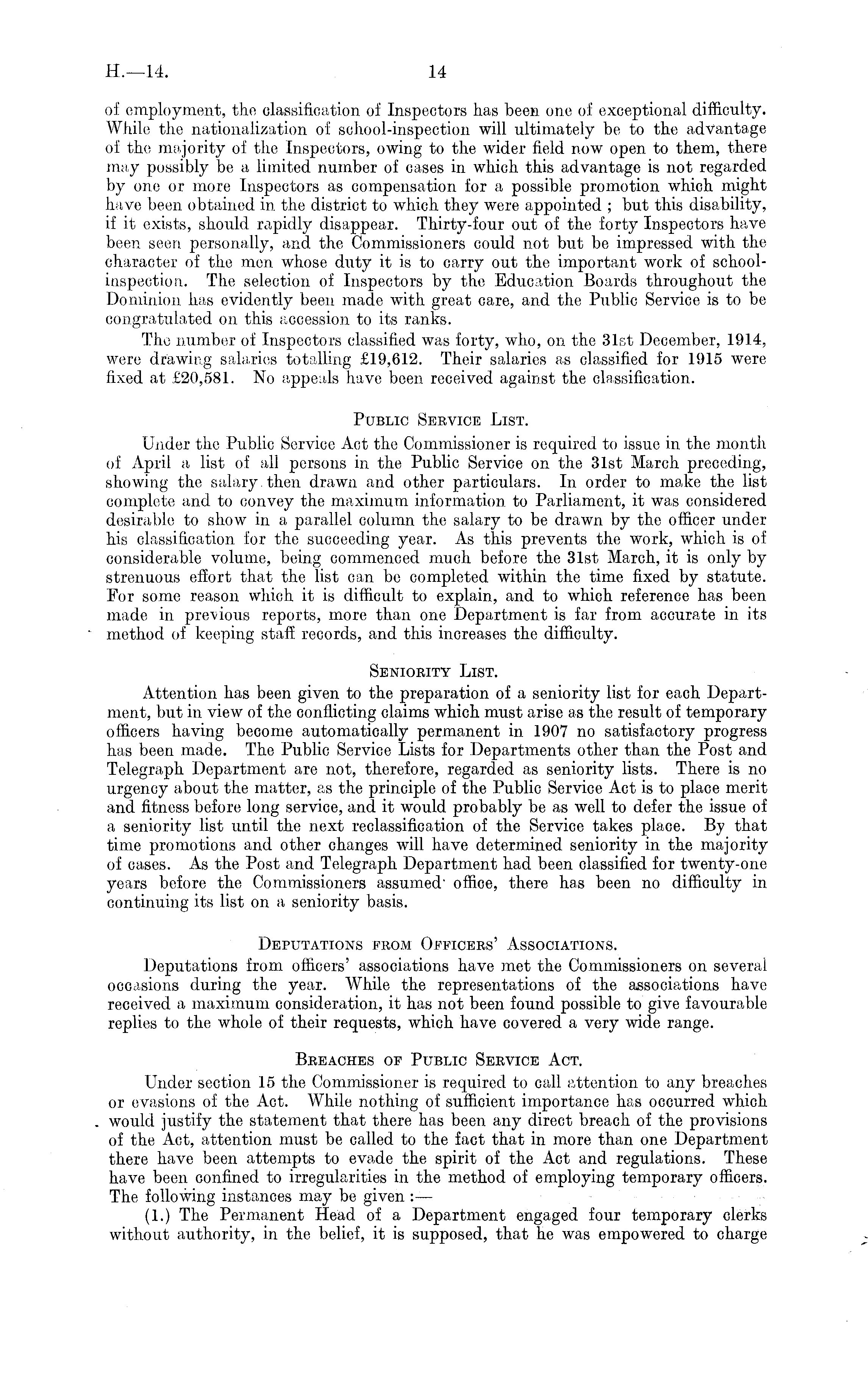 of employment, the classification of Inspectors has been one of exceptional difficulty. While the nationalization of school-inspection will ultimately be to the advantage of the majority of the Inspectors, owing to the wider field now open to them, there may possibly be a limited number of cases in which this advantage is not regarded by one or more Inspectors as compensation for a possible promotion which might have been obtained in the district to which they were appointed ; but this disability, if it exists, should rapidly disappear. Thirty-four out of the forty Inspectors have been seen personally, and the Commissioners could not but be impressed with the character of the men whose duty it is to carry out the important work of schoolinspection. The selection of Inspectors by the Education Boards throughout the Dominion has evidently been made with great care, and the Public Service is to be congratulated on this accession to its ranks. The number of Inspectors classified was forty, who, on the 31st December, 1914, were drawing salaries totalling £19,612. Their salaries as classified for 1915 were fixed at £20,581. No appeals have been received against the classification. Public Service List. Under the Public Service Act the Commissioner is required to issue in the month of April a list of all persons in the Public Service on the 31st March preceding, showing the salary.then drawn and other particulars. In order to make the list complete and to convey the maximum information to Parliament, it was considered desirable to show in a parallel column the salary to be drawn by the officer under his classification for the succeeding year. As this prevents the work, which is of considerable volume, being commenced much before the 31st March, it is only by strenuous effort that the list can be completed within the time fixed by statute. For some reason which it is difficult to explain, and to which reference has been made in previous reports, more than one Department is far from accurate in its method of keeping staff records, and this increases the difficulty. Seniority List. Attention has been given to the preparation of a seniority list for each Department, but in view of the conflicting claims which must arise as the result of temporary officers having become automatically permanent in 1907 no satisfactory progress has been made. The Public Service Lists for Departments other than the Post and Telegraph Department are not, therefore, regarded as seniority lists. There is no urgency about the matter, as the principle of the Public Service Act is to place merit and fitness before long service, and it would probably be as well to defer the issue of a seniority list until the next reclassification of the Service takes place. By that time promotions and other changes will have determined seniority in the majority of cases. As the Post and Telegraph Department had been classified for twenty-one years before the Commissioners assumed' office, there has been no difficulty in continuing its list on a seniority basis. Deputations from Officers' Associations. Deputations from officers' associations have met the Commissioners on several occasions during the year. While the representations of the associations have received a maximum consideration, it has not been found possible to give favourable replies to the whole of their requests, which have covered a very wide range. Breaches of Public Service Act. Under section 15 the Commissioner is required to call attention to any breaches or evasions of the Act. While nothing of sufficient importance has occurred which would justify the statement that there has been any direct breach of the provisions of the Act, attention must be called to the fact that in more than one Department there have been attempts to evade the spirit of the Act and regulations. These have been confined to irregularities in the method of employing temporary officers. The following instances may be given :— (1.) The Permanent Head of a Department engaged four temporary clerks without authority, in the belief, it is supposed, that he was empowered to charge