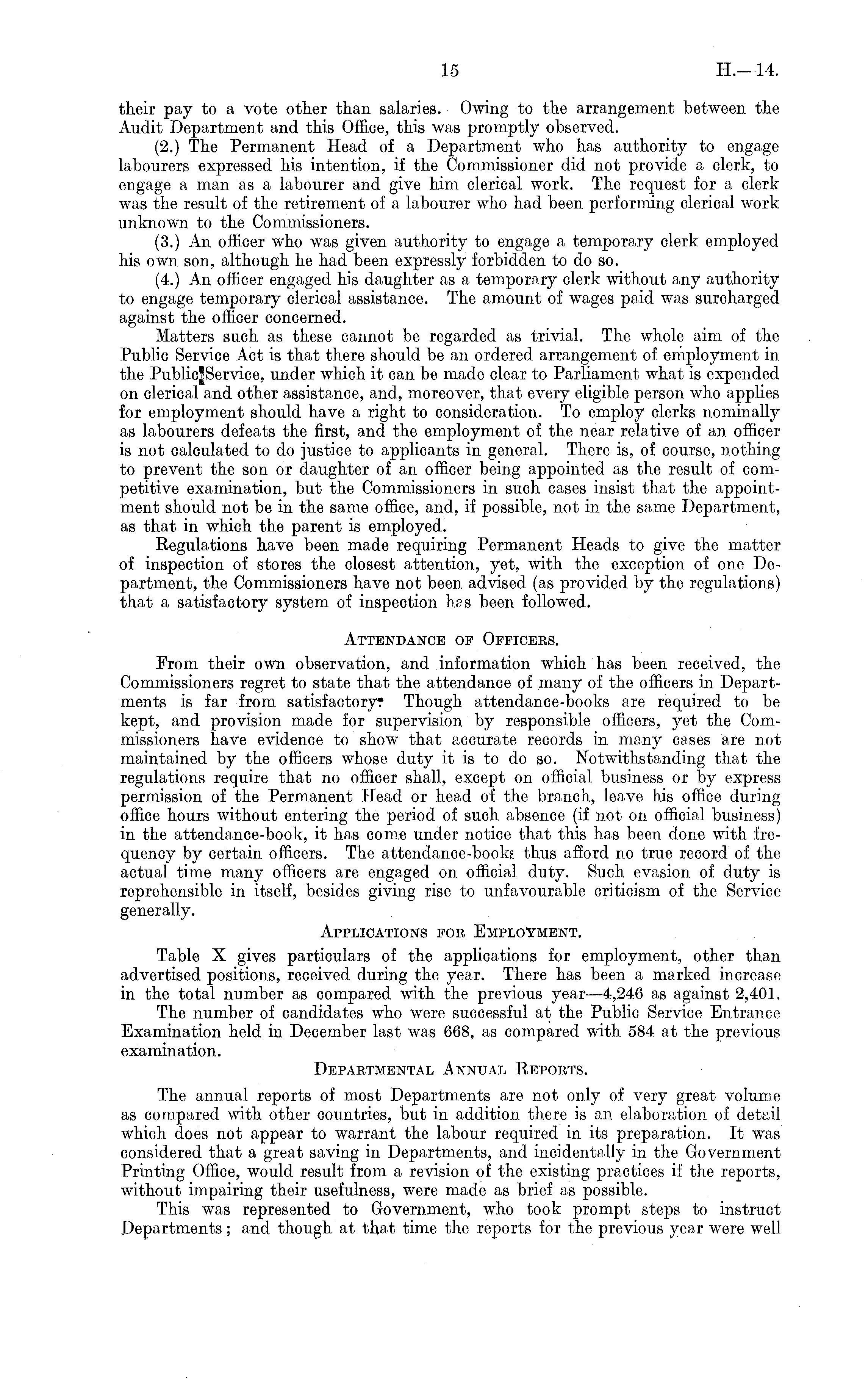 their pay to a vote other than salaries. Owing to the arrangement between the Audit Department and this Office, this was promptly observed. (2.) The Permanent Head of a Department who has authority to engage labourers expressed his intention, if the Commissioner did not provide a clerk, to engage a man as a labourer and give him clerical work. The request for a clerk was the result of the retirement of a labourer who had been performing clerical work unknown to the Commissioners. (3.) An officer who was given authority to engage a temporary clerk employed his own son, although he had been expressly forbidden to do so. (4.) An officer engaged his daughter as a temporary clerk without any authority to engage temporary clerical assistance. The amount of wages paid was surcharged against the officer concerned. Matters such as these cannot be regarded as trivial. The whole aim of the Public Service Act is that there should be an ordered arrangement of employment in the Public|Service, under which it can be made clear to Parliament what is expended on clerical and other assistance, and, moreover, that every eligible person who applies for employment should have a right to consideration. To employ clerks nominally as labourers defeats the first, and the employment of the near relative of an officer is not calculated to do justice to applicants in general. There is, of course, nothing to prevent the son or daughter of an officer being appointed as the result of competitive examination, but the Commissioners in such cases insist that the appointment should not be in the same office, and, if possible, not in the same Department, as that in which the parent is employed. Regulations have been made requiring Permanent Heads to give the matter of inspection of stores the closest attention, yet, with the exception of one Department, the Commissioners have not been advised (as provided by the regulations) that a satisfactory system of inspection has been followed. Attendance of Officers. From their own observation, and information which has been received, the Commissioners regret to state that the attendance of many of the officers in Departments is far from satisfactory? Though attendance-books are required to be kept, and provision made for supervision, by responsible officers, yet the Commissioners have evidence to show that accurate records in ma,ny cases are not maintained by the officers whose duty it is to do so. Notwithstanding that the regulations require that no officer shall, except on official, business or by express permission of the Permanent Head or head of the branch, leave his office during office hours without entering the period of such absence (if not on official business) in the attendance-book, it has come under notice that this has been done with frequency by certain officers. The attendance-books thus afford no true record of the actual time many officers are engaged on official duty. Such evasion of duty is reprehensible in itself, besides giving rise to unfavourable criticism of the Service generally. Applications for Employment. Table X gives particulars of the applications for employment, other than advertised positions, received during the year. There has been a marked increase in the total number as compared with the previous year—4,246 as against 2,401. The number of candidates who were successful at the Public Service Entrance Examination held in December last was 668, as compared with 584 at the previous examination. Departmental Annual Reports. The annual reports of most Departments are not only of very great volume as compared with other countries, but in addition there is an elaboration of detail which does not appear to warrant the labour required in its preparation. It was considered that a great saving in Departments, and incidentally in the Government Printing Office, would result from a revision of the existing practices if the reports, without impairing their usefulness, were made as brief as possible. This was represented to Government, who took prompt steps to instruct Departments; and though at that time the reports for the previous year were well