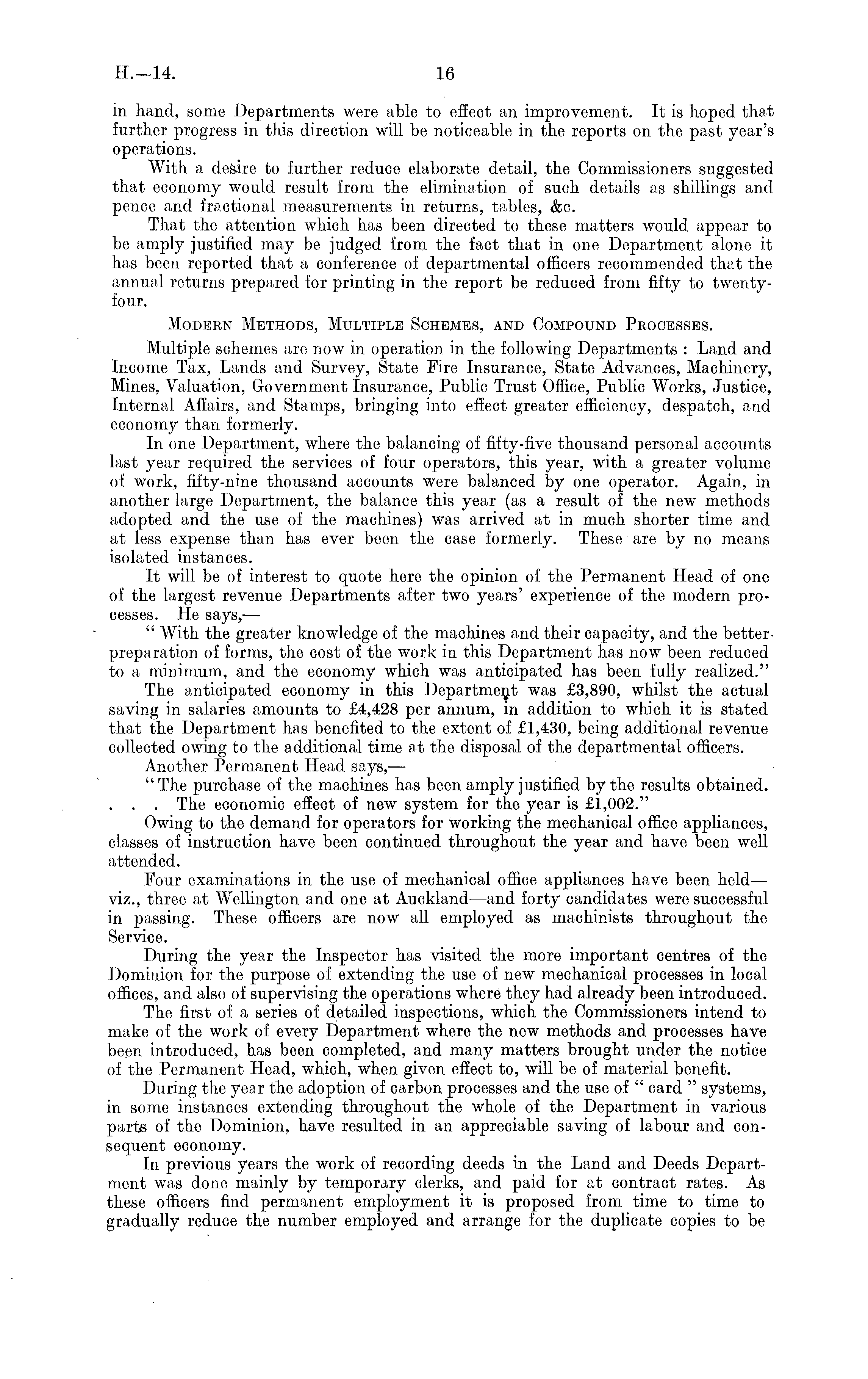 in hand, some Departments were able to effect an improvement. It is hoped that further progress in this direction will be noticeable in the reports on the past year's operations. With a desire to further reduce elaborate detail, the Commissioners suggested that economy would result from the elimination of such details as shillings and pence and fractional measurements in returns, tables, &c. That the attention which has been directed to these matters would appear to be amply justified may be judged from the fact that in one Department alone it has been reported that a conference of departmental officers recommended that the annual returns prepared for printing in the report be reduced from fifty to twentyfour. Modern Methods, Multiple Schemes, and Compound Processes. Multiple schemes are now in operation in the following Departments : Land and Income Tax, Lands and Survey, State Fire Insurance, State Advances, Machinery, Mines, Valuation, Government Insurance, Public Trust Office, Public Works, Justice, Internal Affairs, and Stamps, bringing into effect greater efficiency, despatch, and economy than formerly. In one Department, where the balancing of fifty-five thousand personal accounts last year required the services of four operators, this year, with a greater volume of work, fifty-nine thousand accounts were balanced by one operator. Again, in another large Department, the balance this year (as a result of the new methods adopted and the use of the machines) was arrived at in much shorter time and at less expense than has ever been the case formerly. These are by no means isolated instances. It will be of interest to quote here the opinion of the Permanent Head of one of the largest revenue Departments after two years' experience of the modern processes. He says, — : ' With the greater knowledge of the machines and their capacity, and the betterpreparation of forms, the cost of the work in this Department has now been reduced to a minimum, and the economy which was anticipated has been fully realized." The anticipated economy in this Department was £3,890, whilst the actual saving in salaries amounts to £4,428 per annum, in addition to which it is stated that the Department has benefited to the extent of £1,430, being additional revenue collected owing to the additional time at the disposal of the departmental officers. Another Permanent Head says,— " The purchase of the machines has been amply justified by the results obtained. . . . The economic effect of new system for the year is £1,002." Owing to the demand for operators for working the mechanical office appliances, classes of instruction have been continued throughout the year and have been well attended. Four examinations in the use of mechanical office appliances have been held— viz., three at Wellington and one at Auckland —and forty candidates were successful in passing. These officers are now all employed as machinists throughout the Service. During the year the Inspector has visited the more important centres of the Dominion for the purpose of extending the use of new mechanical processes in local offices, and also of supervising the operations where they had already been introduced. The first of a series of detailed inspections, which the Commissioners intend to make of the work of every Department where the new methods and processes have been introduced, has been completed, and many matters brought under the notice of the Permanent Head, which, when, given effect to, will be of material benefit. During the year the adoption of carbon processes and the use of " card " systems, in some instances extending throughout the whole of the Department in various parts of the Dominion, have resulted in an appreciable saving of labour and consequent economy. In previous years the work of recording deeds in the Land and Deeds Department was done mainly by temporary clerks, and paid for at contract rates. As these officers find permanent employment it is proposed from time to time to gradually reduce the number employed and arrange for the duplicate copies to be