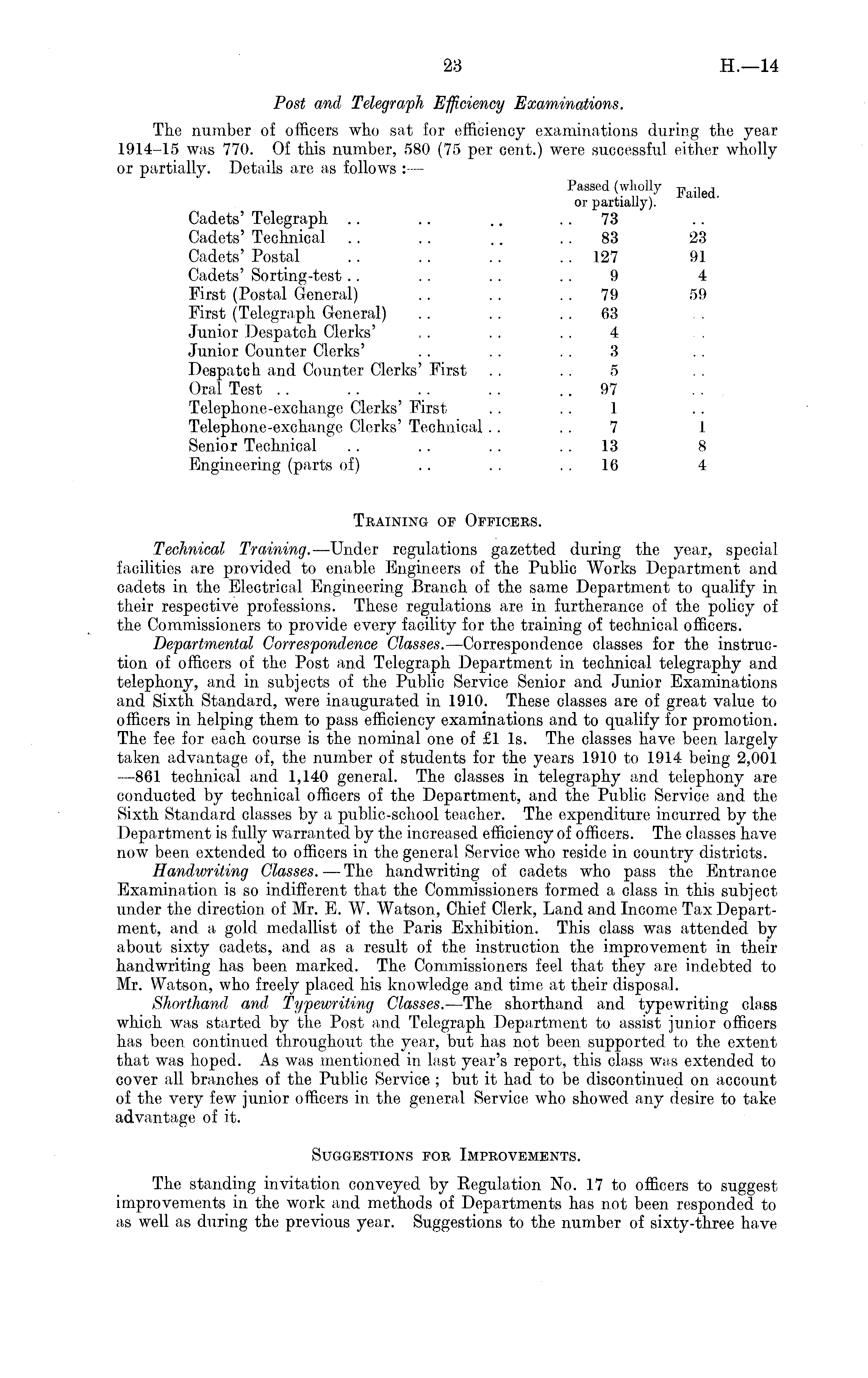 Post and Telegraph E-fficiency Examinations. The number of officers who sat for efficiency examinations during the year 1914-15 was 770. Of this number, 580 (75 per cent.) were successful either wholly or partially. Details are as follows : — Passed (wholly or partially). Cadets' Telegraph .. .. .. 73 Cadets' Technical .. . . .. 83 23 Cadets' Postal .. .. .. .. 127 91 Cadets' Sorting-test.. . . .. 9 4 First (Postal General) .. . . 79 59 First (Telegraph General) . . . . 63 Junior Despatch Clerks' . . . . . . 4 Junior Counter Clerks' . . . . . . 3 Despatch and Counter Clerks' First . . . . 5 Oral Test .. . . . . .. 97 Telephone-exchange Clerks' First . . . . 1 Telephone-exchange Clerks' Technical . . . . 7 I Senior Technical . . . . .. 13 8 Engineering (parts of) . . . . 16 4 Training of Officers. Technical Training. —Under regulations gazetted during the year, special facilities are provided to enable Engineers of the Public Works Department and cadets in the Electrical Engineering Branch of the same Department to qualify in their respective professions. These regulations are in furtherance of the policy of the Commissioners to provide every facility for the training of technical officers. Departmental Correspondence Glasses. —Correspondence classes for the instruction of officers of the Post and Telegraph Department in technical telegraphy and telephony, and in subjects of the Public Service Senior and Junior Examinations and Sixth Standard, were inaugurated in 1910. These classes are of great value to officers in helping them to pass efficiency examinations and to qualify for promotion. The fee for each course is the nominal one of £1 Is. The classes have been largely taken advantage of, the number of students for the years 1910 to 1914 being 2,001 —861 technical and 1,140 general. The classes in telegraphy and telephony are conducted by technical officers of the Department, and the Public Service and the Sixth Standard classes by a public-school teacher. The expenditure incurred by the Department is fully warranted by the increased efficiency of officers. The classes have now been extended to officers in the general Service who reside in country districts. Handwriting Classes. — The handwriting of cadets who pass the Entrance Examination is so indifferent that the Commissioners formed a class in this subject under the direction of Mr. E. W. Watson, Chief Clerk, Land and Income Tax Department, and a gold medallist of the Paris Exhibition. This class was attended by about sixty cadets, and as a result of the instruction the improvement in their handwriting has been marked. The Commissioners feel that they are indebted to Mr. Watson, who freely placed his knowledge and time at their disposal. Shorthand and Typewriting Classes. —The shorthand and typewriting class which was started by the Post and Telegraph Department to assist junior officers has been continued throughout the year, but has not been supported to the extent that was hoped. As was mentioned in last year's report, this class was extended to cover all branches of the Public Service ; but it had to be discontinued on account of the very few junior officers in the general Service who showed any desire to take advantage of it. Suggestions for Improvements. The standing invitation conveyed by Regulation No. 17 to officers to suggest improvements in the work and methods of Departments has not been responded to as well as during the previous year. Suggestions to the number of sixty-three have