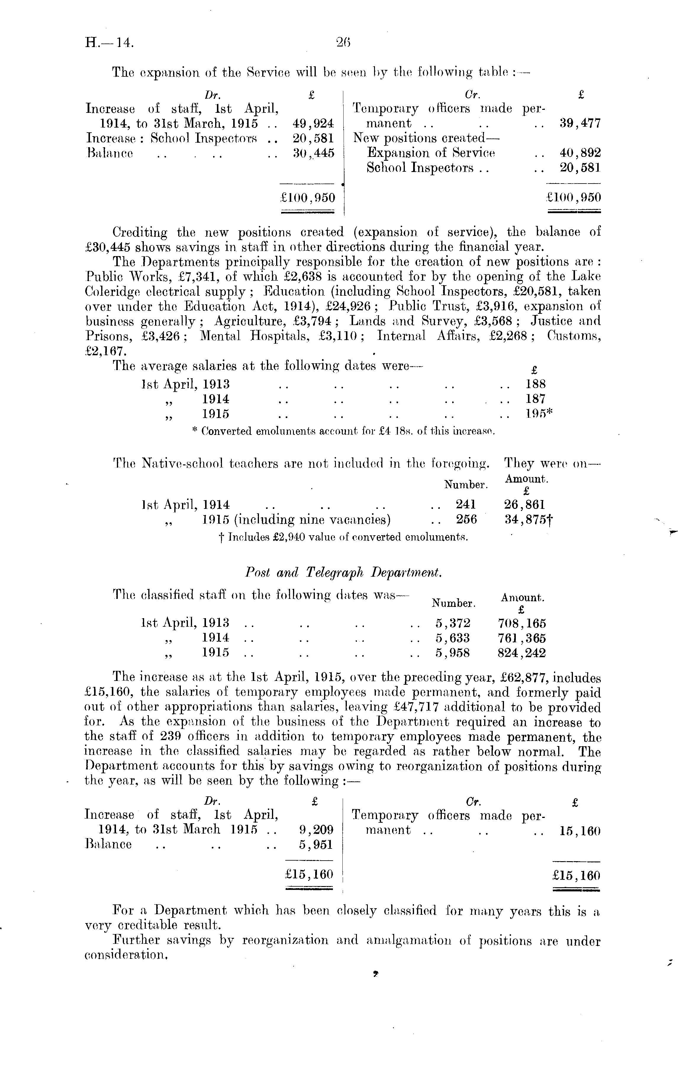 The expansion of the Service will be seen by the following table :— Dr. £ Or. £ Increase of staff, Ist April, Temporary officers made per--1914, to 31st March, 1915 .. 49,924 manent .. '.. ..39,477 Increase: School Inspectors .. 20,581 New positions created'— Balance .. ... .. 30,445 Expansion of Service .. 40,892 School Inspectors .. .. 20,581 £100,950 £100,950 Crediting the new positions created (expansion of service), the balance of £30,445 shows savings in staff in other directions during the financial year. The Departments principally responsible for the creation of new positions are : Public Works, £7,341, of which £2,638 is accounted for by the opening of the Lake Coleridge electrical supply ; Education (including School Inspectors, £20,581, taken over under the Education Act, 1914), £24,926 ; Public Trust, £3,916, expansion of business generally ; Agriculture, £3,794 ; Lands and Survey, £3,568 ; Justice and Prisons, £3,426;' Mental. Hospitals, £3,110; Internal Affairs, £2,268; Customs, £2,167. The average salaries at the following dates were — £ Ist April, 1913 .. .. .. \. ..188 1914 .. .. .. 187 1915 .. .. .. .. ..195* * Converted emoluments account for £4 18s. of this increase. The Native-school teachers are not included in the foregoing. They were on — Number. Am ° unt ' Ist April, 1914 .. .. .. ..241 26,861 „ 1915 (including nine vacancies) .. 256 34,875f f Includes £2,940 value of converted emoluments. Post and Telegraph Department. The classified staff on the following dates was — T , Amount Number. „ Ist April, 1913 .. .. .. ..5,372 708,165 1914 .. .. .. .. 5,633 761,365 1915 .. .. .. .. 5,958 824,242 The increase as at the Ist April, 1915, over the preceding year, £62,877, includes £15,160, the salaries of temporary employees made permanent, and formerly paid out of other appropriations than salaries, leaving £47,717 additional to be provided for. As the expansion of the business of the Department required an increase to the staff of 239 officers in addition to temporary employees made permanent, the increase in the classified salaries may be regarded as rather below normal. The Department accounts for this by savings owing to reorganization of positions during the year, as will be seen by the following :— Dr. £ Gr. £ Increase of staff, Ist April, Temporary officers made per--1914, to 31st March 1915 .. 9,209 manent .. .. .. 15,160 Balance .. .. .. 5,951 £15,160 £15,160 For a Department which has been closely classified for many years this is a very creditable result. Further savings by reorganization and amalgamation of positions are under consideration. t