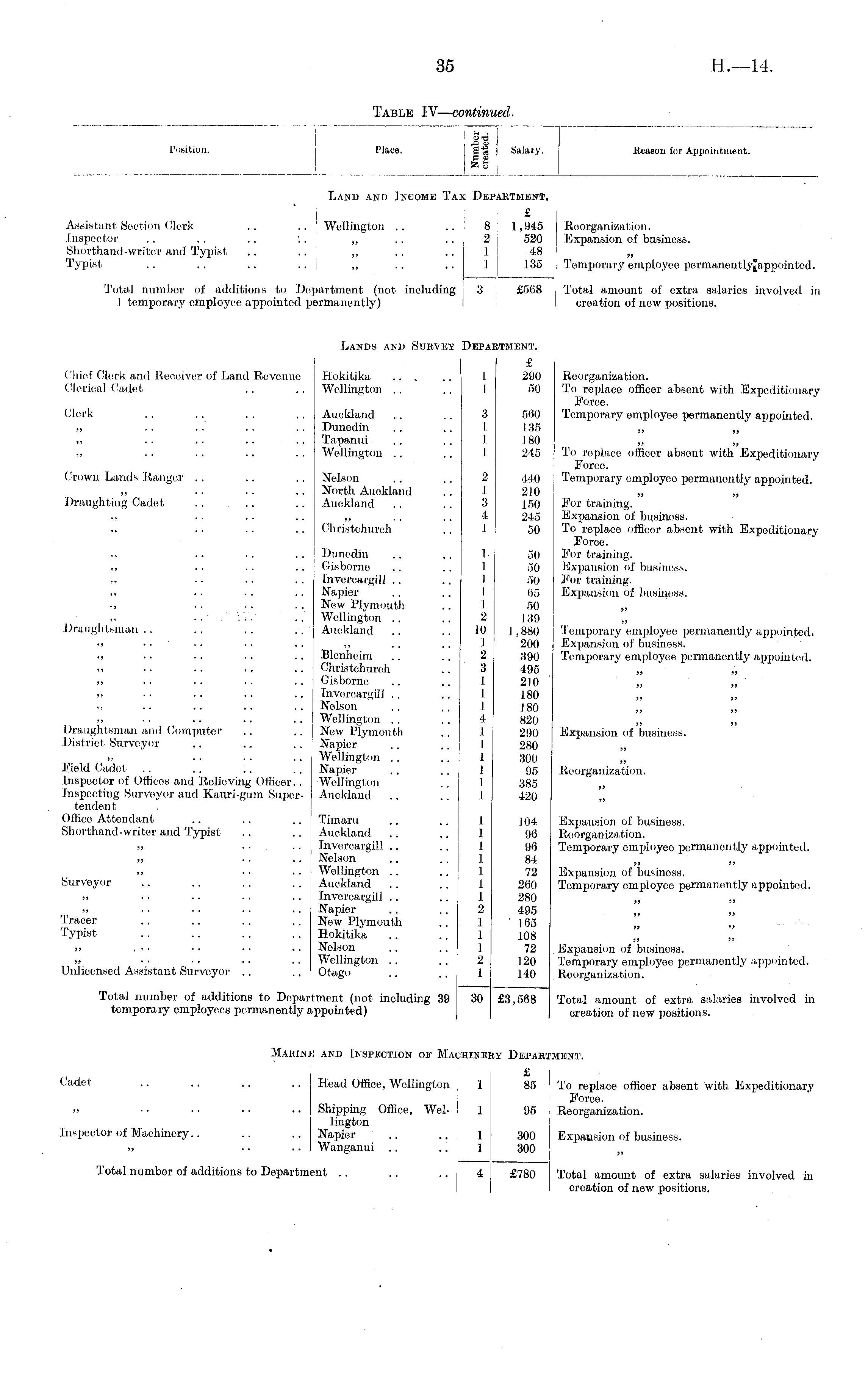! S-3 X. a. Position. Place. 6a Salary. rd 01 rrS Reason tor Appointment. Land and Income Tax Department. £ Assistant Section Clerk .. .. Wellington .. .. 8 1,945 Inspector .. .. .. :. i „ .. .. 2 520 Shorthand-writer and Typist .. .. [ „ . . .. 1 48 Typist .. .. .. .. | „ .. .. 1 135 i_ Reorganization. Expansion of business. Temporary employee pormanontIy[appointed. Total number of additions to Department (not including 3 , £508 1 temporary employee, appointed permanently) Total amount of extra salaries involved in creation of new positions. Lands and Survey Department. £ Chief Clerk and Receiver of Land Revenue Hokitika 1 290 Clerical Cadet .. . . Wellington .. .. I 50 IBPA] 1 I Reorganization. To replace officer absent with Expeditionary Force. Temporary employee permanently appointed. Clerk .. . . .. . . Auckland .. .. 3 560 ,, .. .. .. .. Dunedin .. .. I 135 „ . . .. .. .. Tapanui . . . . 1 180 .. Wellington .. . . I 245 3 I I I To replace officer absont with Expeditionary Force. Temporary employee permanently appointed. Crown Lands Ranger . . .. .. Nelson .. . . 2 440 .. North Auckland .. I 210 Draughting Cadet .. .. .. Auckland .. .. 3 150 .. 4 245 .. Christchurch . . I 50 2 I 3 4 I For training. Expansion of business. To replace officer absont with Expeditionary Force. For training. Expansion of business. For training. Expansion of business. ,, .. .. .. Dunedin . . .. I 50 ,, .. .. .. Gisborne .. .. I 50 ,, •. .. .. Invercargill .. .. I 50 ,, • • •. .. Napier .. .. 1 65 .. New Plymouth . . I 50 '-"..' . . Wellington . . . . 2 130 Draughtsman.. .. .. /. ' Auckland .. .. 10 i,88o I 200 „ • . .. .. . . Blenheim .. . . 2 390 ,, • • .. .. .. Christchurch .. 3 495 ,, .. .. .. .. Gisborne .. .. I 210 ,, •■ .. .. .. fnvoreargill .. .. I 180 Nelson .. .. I 180 ,, • ■ ■. .. .. Wellington .. .. 4 820 Draughtsman and Computer .. .. Now Plymouth I 290 District Surveyor .. .. .. Napier .. .. 1 280 ,, .. .. .. Wellington .. I 300 Field Cadet .. .. .. .. Napier .. .. I 95 Inspector of Offices and Relieving Officer.. Wellington 1 385 Inspecting Surveyor and Kauri-gum Super- Auckland .. I 420 tendent Office Attendant .. .. .. Timaru .. .. 1 104 Shorthand-writer and Typist .. .. Auckland .. .. 1 96 „ ..... Invercargill .. .. 1 96 ,, • • .. Nelson .. . . 1 84 ,, • ■ . . Wellington .. .. 1 72 Surveyor .. .. .. .. Auckland .. .. 1 260 Invercargill .. .. I 280 .. Napier .. .. 2 495 Tracer .. .. . . .. New Plymouth .. 1 165 Typist .. .. . . . . Hokitika .. .. 1 108 „ ... •. .. .. Nelson .. .. 1 72 „ • • ■. .. .. Wellington .. .. 2 120 ' Unlicensed Assistant Surveyor .. .. ' Otago .. .. 1 j 40 I. I I I 1 2 10 1 2 3 1 1 1 4 1 1 1 I 1 1 Temporary employee permanently appointed. Expansion of business. Temporary employee permanently appointed. ,, ,, ,, ,, ,, ,, Expansion of business. Reorganization. u 1 1 1 1 1 1 1 2 1 1 1 2 1 Expansion of business. Reorganization. Temporary omployeo permanently appointed. Expansion of business. Temporary employee permanently appointed. ,, ,, ,, >, ,, ,, Expansion of businoss. Temporary employee permanently appointed. Reorganization. Total number of additions to Department (not including 39 30 £3,568 temporary employees permanently appointed) tment (not including 39 ippointed) 30 £3,568 Total amount of extra salaries involved in creation of new positions. 1 Marine and Inspection of Machinery Departm k and Inspection of Mai ;y Depar'j 'MENT. chine: £ I Cadet .. .. .. .. Head Office, Wellington 1 85 | ' Head Office, Wellington 1 £ 85 To replace officer absent with Expeditionary Force. Reorganization. 1 .. Shipping Office, Wei- 1 95 1 iri iv+Yin Shipping Office, Wellington Napier Wanganui 1 95 Imgton Inspector of Machinery.. .. .. Napier .. .. 1 300 I 1 300 300 Expansion of business. » ■ • .. Wanganui .. .. I 300 ,, Total number of additions to Department .. . . .. 41 £780 ' Total amount of extra salaries involved in creation of new positions. int .. £780