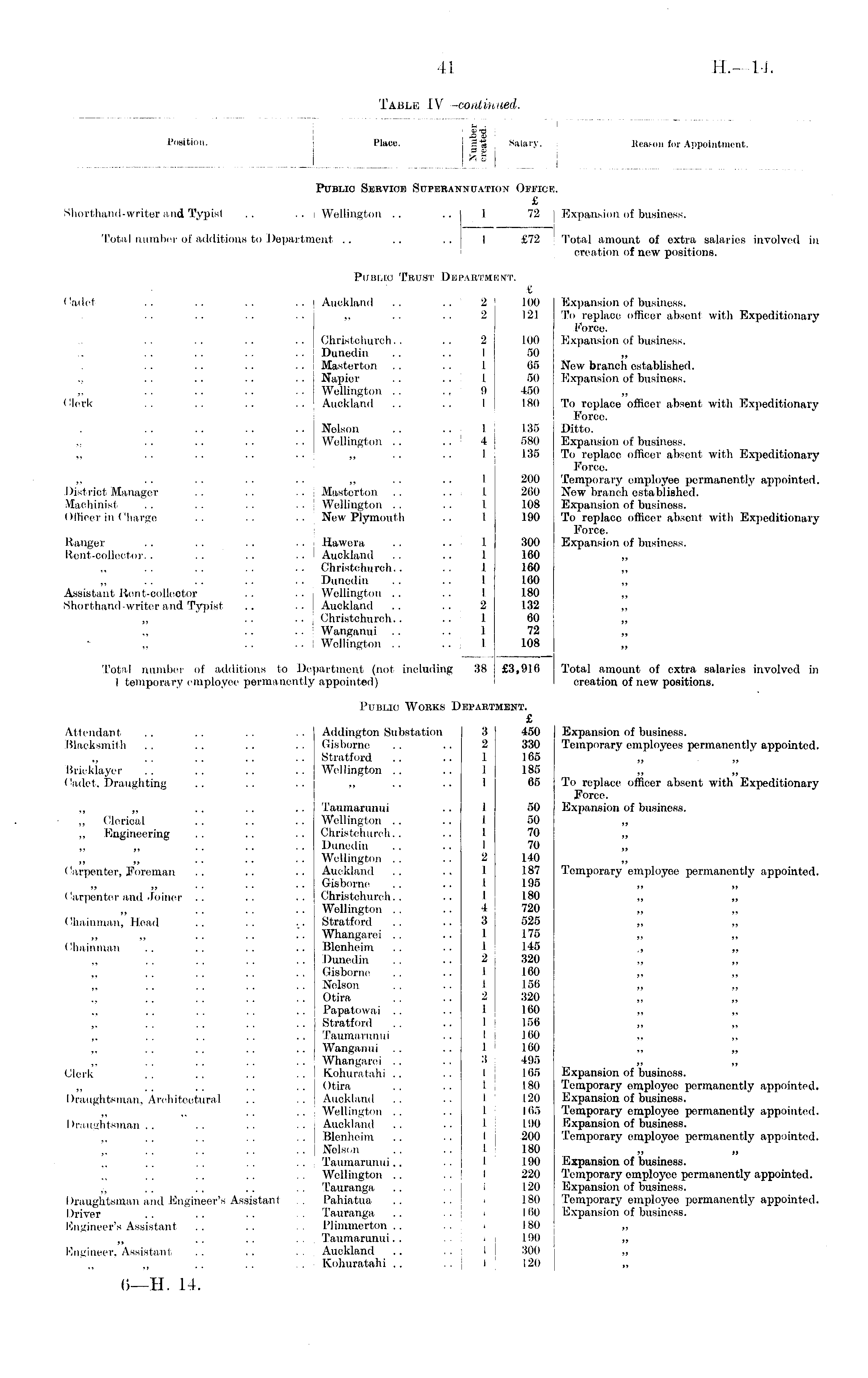 St Position. Place. S « Salary. Heat-cm lor Appointment. S oi 7, 8 Public Service Superannuation Office. £ Shorthand-writer and Typist .. .. I Wellington .. ..II 72 Expansion of business. Total number of additions to Department .. .. .. 1 £72 Total amount of extra salaries involved in creation of new positions. Public Trust Department. £ Cadet .. .. .. .. I Auckland .. .. ' 2 100 Expansion of business. „ .. . . 2 121 To replace officer absent with Expeditionary Force. Christchurch.. .. 2 100 Expansion of business. Dunedin .. .. 1 50 „ Masterton .. .. 1 65 New branch established. ., . . .. .. . . Napier .. .. 1 50 Expansion of business. .. Wellington . . 9 450 Clerk .. .. .. .. Auckland .. .. I 180 To replace officer absent, with Expeditionary Force. .. Nelson .. ... 1 135 Ditto. ,. . . .. . . .. Wellington .. .. 4 580 Expansion of businoss. „ . . .. .. .. ,, .. .. | 1 135 To replace officer absent with Expeditionary Force. „ .. .. .. .. ,, .. .. I 200 Temporary employee permanently appointed. District Manager . . . . .. Masterton . . . . 1 200 Now braneh established. Machinist . . . . .. . . Wellington .. . . I 108 Expansion of business. Officer in Charge •■ .. .. New Plymouth .. 1 190 To replace officer absent with Expeditionary Force. Hanger . . .. . . ... Hawera .. .. 1 300 Expansion of business. Rent-collector.. .. . . .. Auckland .. 1 160 .. Christchurch.. .. 1 160 . . Dunedin . . 1 160 Assistant Rent-collector . . . . Wellington . . . . 1 180 „ Shorthand-writer and Typist .. .. Auckland .. .. 2 132 ,, .. Christchurch.. 1 60 „ .. .. Wanganui .. .. 1 72 „ .... Wellington . . .. . I 108 „ Total number of additions to Department (not including 38 £3,916 Total amount of extra salaries involved in I temporary employee permanently appointed) creation of new positions. Public Works Department. £ Attendant, .. .. .. .. Addington Substation 3 450 Expansion of business. Blacksmith .. .. .. .. Gisborne .. .. 2 330 Temporary employees permanently appointed. .. Stratford .. 1 165 „ Bricklayer .. .. .. .. Wellington .... 1 185 < 'adot. Draughting .. .. .. ,, .. .. 1 65 To replace officer absent with Expeditionary Force. „ „ .. .. .. Taumarunui .. 1 50 Expansion of business. „ Clerical .. .. .. Wellington . . .. 1 50 „ „ Engineering .. .. .. Christchurch. . .. 1 70 „ .. Dunedin .. ..1 70 . . Wellington . . 2 140 Carpenter, Foreman .. .. .. Auckland .. .. I 187 Temporary employee permanently appointed. „ „ .. .. .. Gisborne .. .. 1 195 „ „ Carpenter and Joiner .. .. •• Christchurch.. 1 180 ,, ,, .. Wellington . . .. 4 720 Ohainman, Head .. .. .. Stratford .. .. 3 525 „ „ .'. Whangarei .. ..1 175 Chainman .. .. .. .. Blenheim .. .. 1 145 ,, „ .. Dunedin .. 2 320 .. Gisborne .. 1 160 „ .. .. . . . . Nelson . . . . I 156 „ .. Otira . . .. 2 320 „ .. .. .. .. Papatowai .. 1 160 ,, „ .. Stratford . . 1 156 ,, .. .. .. .. Taumarunui .. I j 160 „ „ .. Wanganui .. .. 1 | 160 „ . . .. . . .. Whangarei .. .. 3 495 „ „ Clerk . . .. . . .. Kohuratahi . . .. 1 j 165 Expansion of business. „ .. .. . . .. Otira . . .. 1 180 Temporary employee permanently appointed. Draughtsman, Architectural .. .. Auckland .. .. I 120 Expansion of business. „ ,. .. .. Wellington .. .. I 105 Temporary employee permanently appointed. Draughtsman .. .. .. Auckland .. .. I 190 Expansion of business. „ . . . .. Blenheim . . . . I 200 Temporary employee permanently appointed. .. Nelson .. I ! 180 Taumarunui .. . . I 190 Expansion of business. Wellington .. I 220 Temporary employee permanently appointed. ,-, . . .. .. . . I Tauranga . . I 120 Expansion of businoss. Draughtsman and Engineer's Assistant .. Pahiatua .. .. > 180 Temporary employee permanently appointed. Driver .. . . . . . . Tauranga . . .. ■ 160 Expansion of business. Engineer's Assistant .. .. Plimmerton .. , 180 „ .. .. Taumarunui. . ... i, 190 „ Engineer, Assistant .. .. .. Auckland .. .. j 1 I 300 „ Kohuratahi .. .. [ 1 | 120 1 2 1 1 1 3 1 1