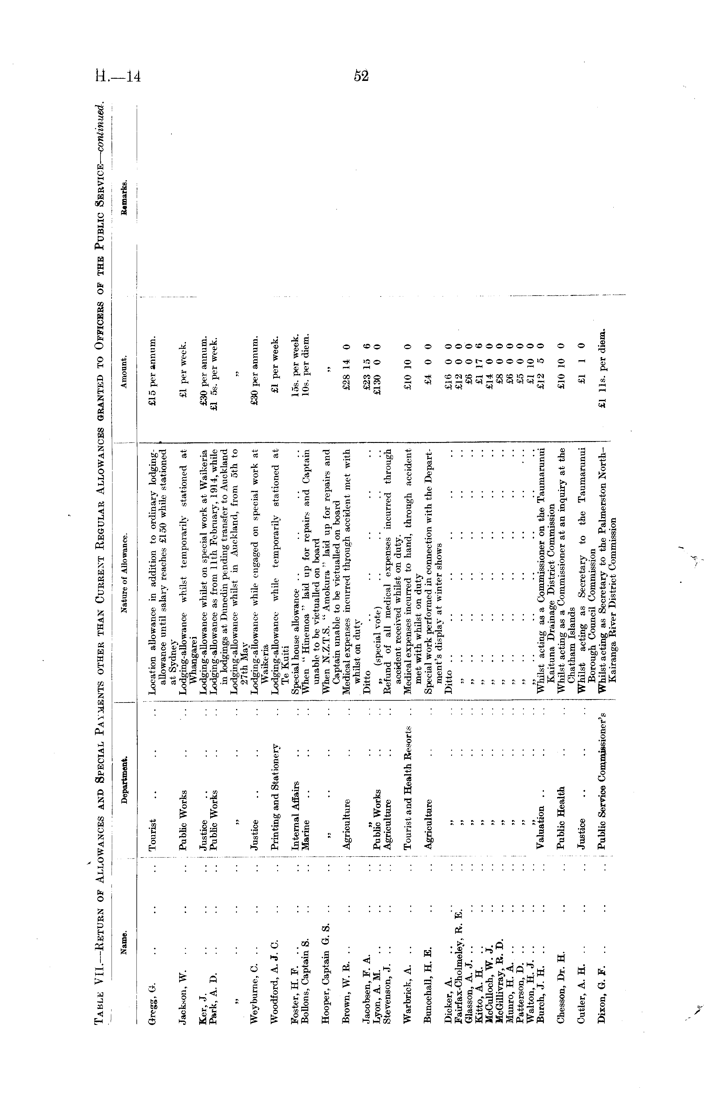 Name. Department. Nature of Allowance. Amount. Remarks. Gregg, G. .. j Tourist Location allowance in addition to ordinary lodgingallowance until salary reaches £150 while stationed at Sydney Lodging-allowance whilst temporarily stationed at Whangarei Lodging-allowance whilst on special work at Waikeria Lodging-allowance as from llth February, 1914, while in lodgings at Dunedin pending transfer to Auckland Lodging-allowance whilst in Auckland, from 5th to 27th May Lodging-allowance while engaged on special work at Waikeria Lodging-allowance while temporarily stationed at Te Kuiti Special house allowance When " Hinemoa " laid up for repairs and Captain unable to be victualled on board When N.Z.T.S. " : Amokura " laid up for repairs and Captain unable to be victualled on board Medical expenses incurred through accident met with whilst on duty Ditto „ (special vote) Refund of all medical expenses incurred through accident received whilst on duty. Medical expenses incurred to hand, through accident met with whilst on duty Special work performed in connection with the Department's display at winter shows Ditto £15 per annum. Jackson, W. Pubhc Works £1 per week. Ker, J. Park, A. D. .. j Justice .. ! Pubhc Works £30 per annum. £1 5s. per week. Weyburne, C. . . Justice £30 per annum. Woodford, A. J. C. .. ! Printing and Stationery £1 per week. Foster, H. F. .. Bollons, Captain S. .. ; Internal Affairs .. i Marine 15s. per week. 10s. per diem. Hooper, Captain G. S. Brown, W. R. . . Agriculture £28 14 0 Jacobsen, F. A. Lyon, A. M. Stevenson, J. .. Warbrick, A. . . ■ • j „ .. i Public Works Agriculture Tourist and Health Resorts .. £23 15 6 £130 0 0 £10 10 0 Buncehall, H. E. Agriculture £4 0 0 Dicker, A. Fairfax-Cholmeley, R. E. Glasson, A. J. .. Kitto, A. H. .. McCulloch, W. J. McGillivray, R. D. Monro, H. A. .. Patterson, D. .. Walton, H. J. . . Burch, J. H. .. Valuation £16 0 0 £12 0 0 £6 0 0 £1 17 6 £14 0 0 £8 0 0 £6 0 0 £5 0 0 £1 10 0 £12 5 0 Chesson, Dr. H. Cutler, A. H. . . Public Health .. ; Justice Whilst acting as a Commissioner on the Taumarunui Kaituna Drainage District Commission Whilst acting as a Commissioner at an inquiry at the Chatham Islands Whilst acting as Secretary to the Taumarunui Borough Council Commission Whilst acting as Secretary to the Palmerston NorthKairanga River District Commission £10 10 0 £1 1 0 Dixon, G. F. .. .. > Public Service Commissioner's £1 lis. per diem. I • ___