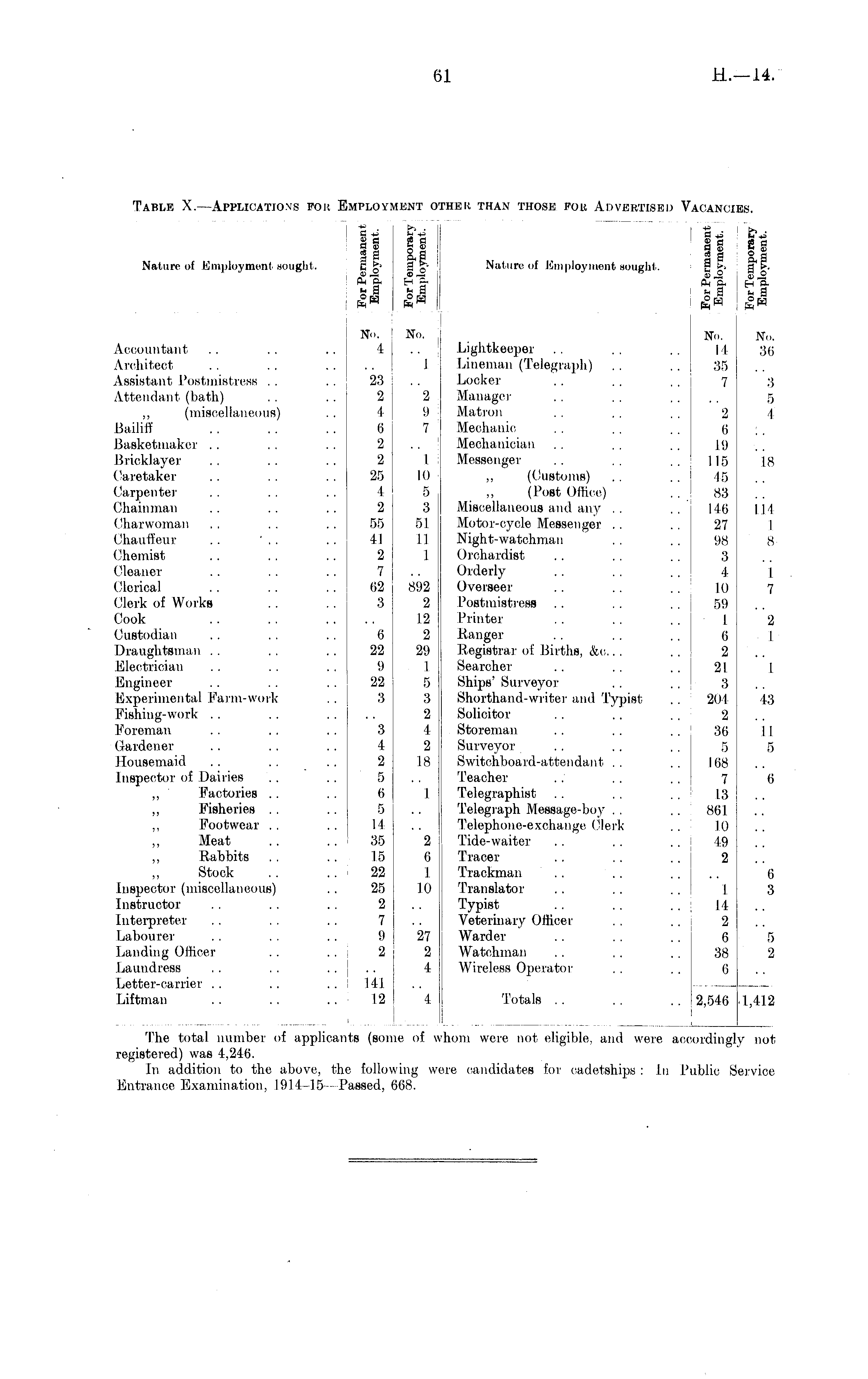 The total number of applicants (some of whom were not eligible, and were accordingly not registered) was 4,246. In addition to the above, the following were candidates for cadetships : In Public Service Entrance Examination, 1914-15 Passed, 668.