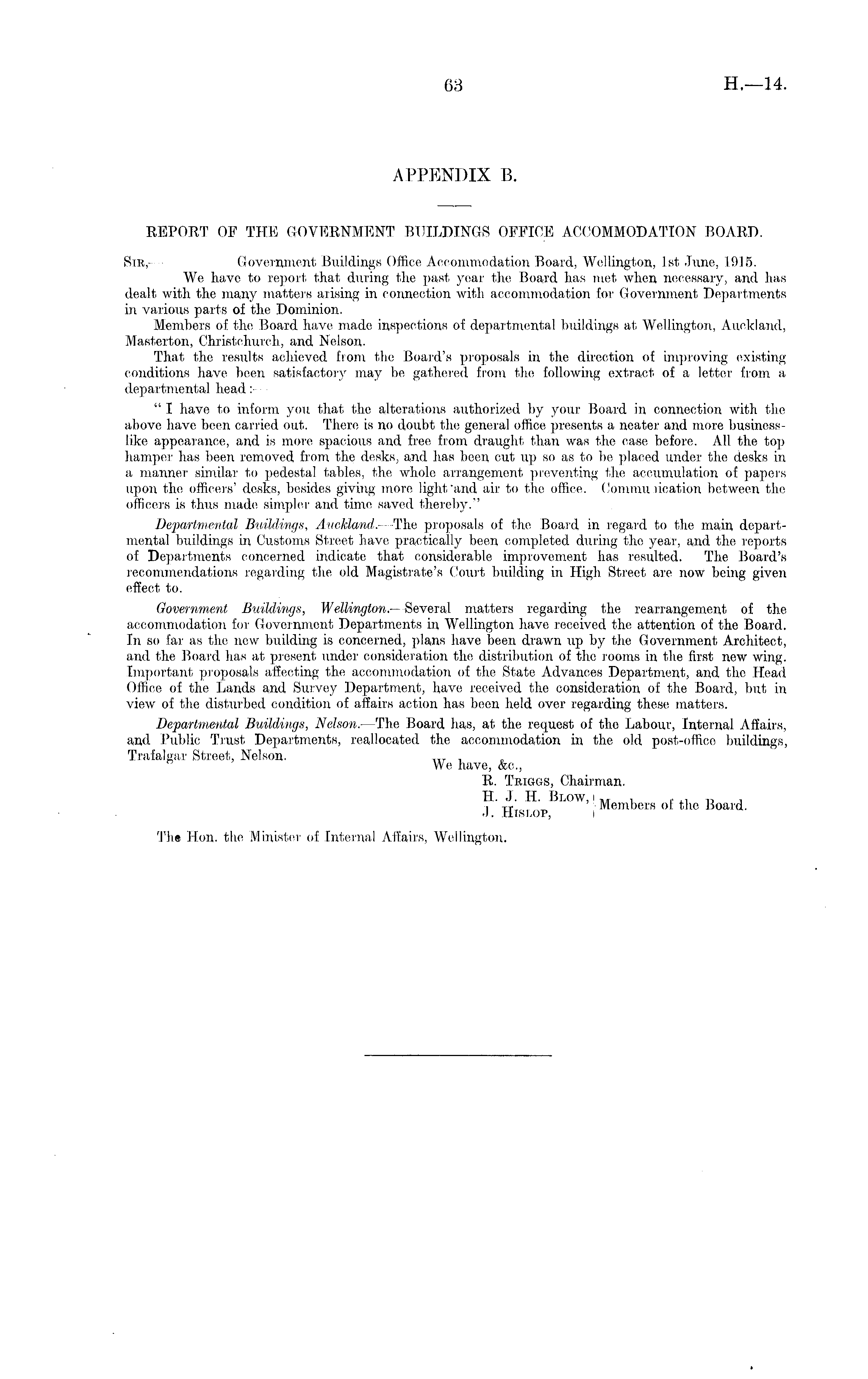 APPENDIX B. REPORT OF THE GOVERNMENT BUILDINGS OFFICE ACCOMMODATION BOARD. Sir,,- Government Buildings Office Accommodation Board, Wellington, Ist .June, 1915. We have to report that during the past year the Board has met when necessary, and has dealt with the many matters arising in connection with accommodation for Government Departments in various parts of the Dominion. Members of the Board have made inspections of departmental buildings at Wellington, Auckland, Masterton, Christchurch, and Nelson. That the results achieved from the Board's proposals in the direction of improving existing conditions have been satisfactory may be gathered from the following extract of a letter from a departmental head :- " I have to inform you that the alterations authorized by your Board in connection with the above have been carried out. There is no doubt the general office presents a neater and more businesslike appearance, and is more spacious and free from draught than was the case before. All the top hamper has been removed from the desks, and has been cut up so as to be placed under the desks in a manner similar to pedestal tables, the whole arrangement preventing the accumulation of papers upon the officers' desks, besides giving more light "and air to the office. Communication between the officers is thus made simpler and time saved thereby." Departmental Buildings, Auckland.—The proposals of the, Board in regard to the main departmental buildings in Customs Street have practically been completed during the year, and the reports of Departments concerned indicate that considerable improvement has resulted. The Board's recommendations regarding the old Magistrate's Court building in High Street are now being given effect to. Government Buildings, Wellington- Several matters regarding the rearrangement of the accommodation for Government Departments in Wellington have received the attention ot the Board. In so far as the new building is concerned, plans have been drawn up by the Government Architect, and the Board has at present under consideration the distribution of the rooms in the first new wing. Important proposals affecting the accommodation of the State Advances Department, and the Head Office of the Lands and Survey Department, have received the consideration of the Board, but in view of the disturbed condition of affairs action has been held over regarding these matters. Departmental Buildings, Nelson. —The Board has, at the request of the Labour, Internal Affairs, and Public Trust Departments, reallocated the accommodation in the old post-office buildings, Trafalgar Street, Nelson. ~r , We have, &c, R. Triggs, Chairman. H. J. H. Blow, i „ , ~, „ , .). HrsLOP, ', Members of the Board. The Hon. the Minister of Internal Affairs, Wellington.