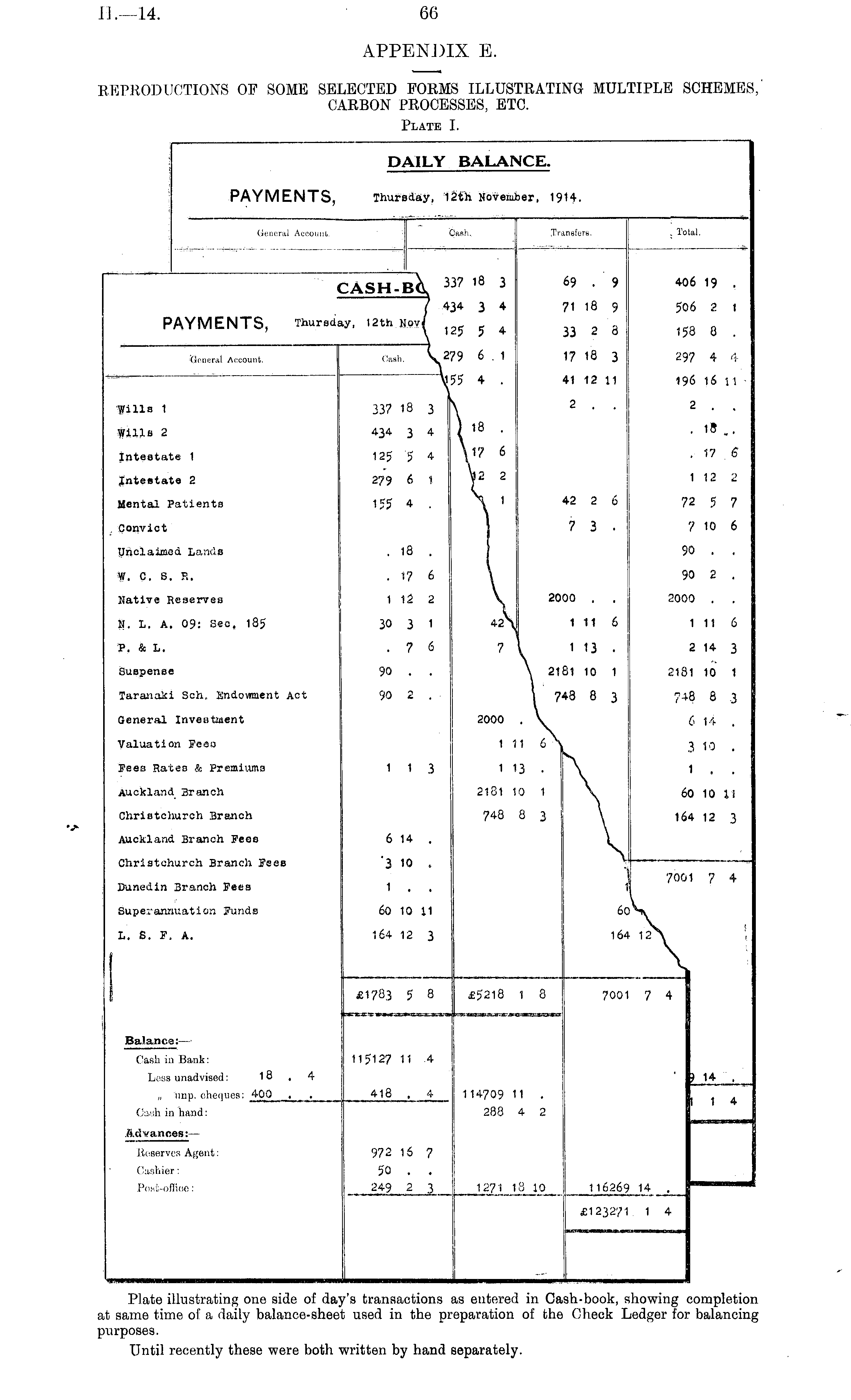 Plate illustrating one side of day's transactions as entered in Cash-book, showing completion at same time of a daily balance-sheet used in the preparation of the Cheek Ledger for balancing purposes. Until recently these were both written by hand separately.