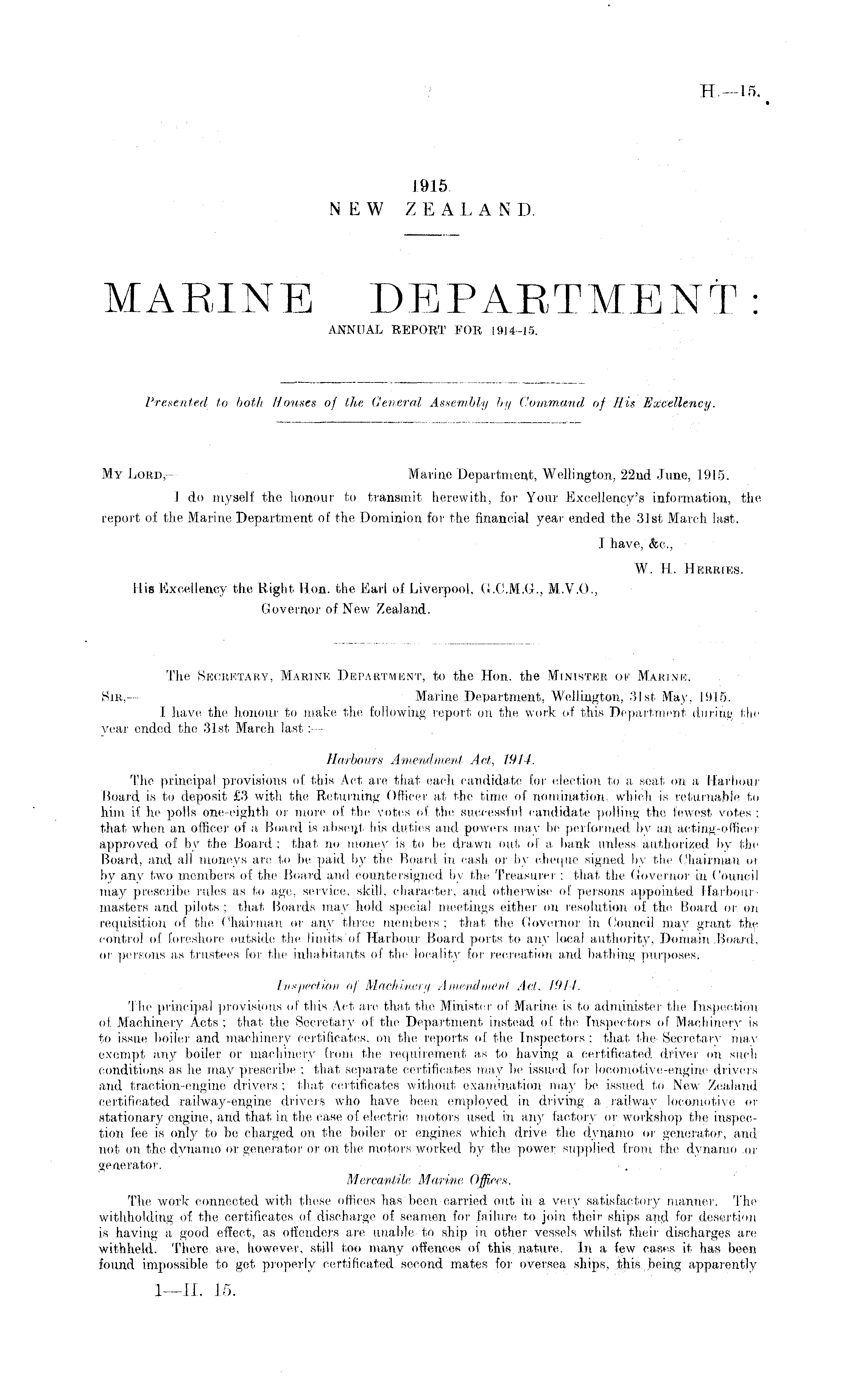 My Lord, — Marine Department, Wellington, 22nd June, 1915. I do myself the honour to transmit herewith, for Your Excellency's information, the report of the Marine Department of the Dominion for the financial year ended the 31st March last. I have, f&c, W. H. Herries. His Excellency the Eight Hon. the Earl of Liverpool, 0.C.M.G., M.V.0., Governor of New Zealand.