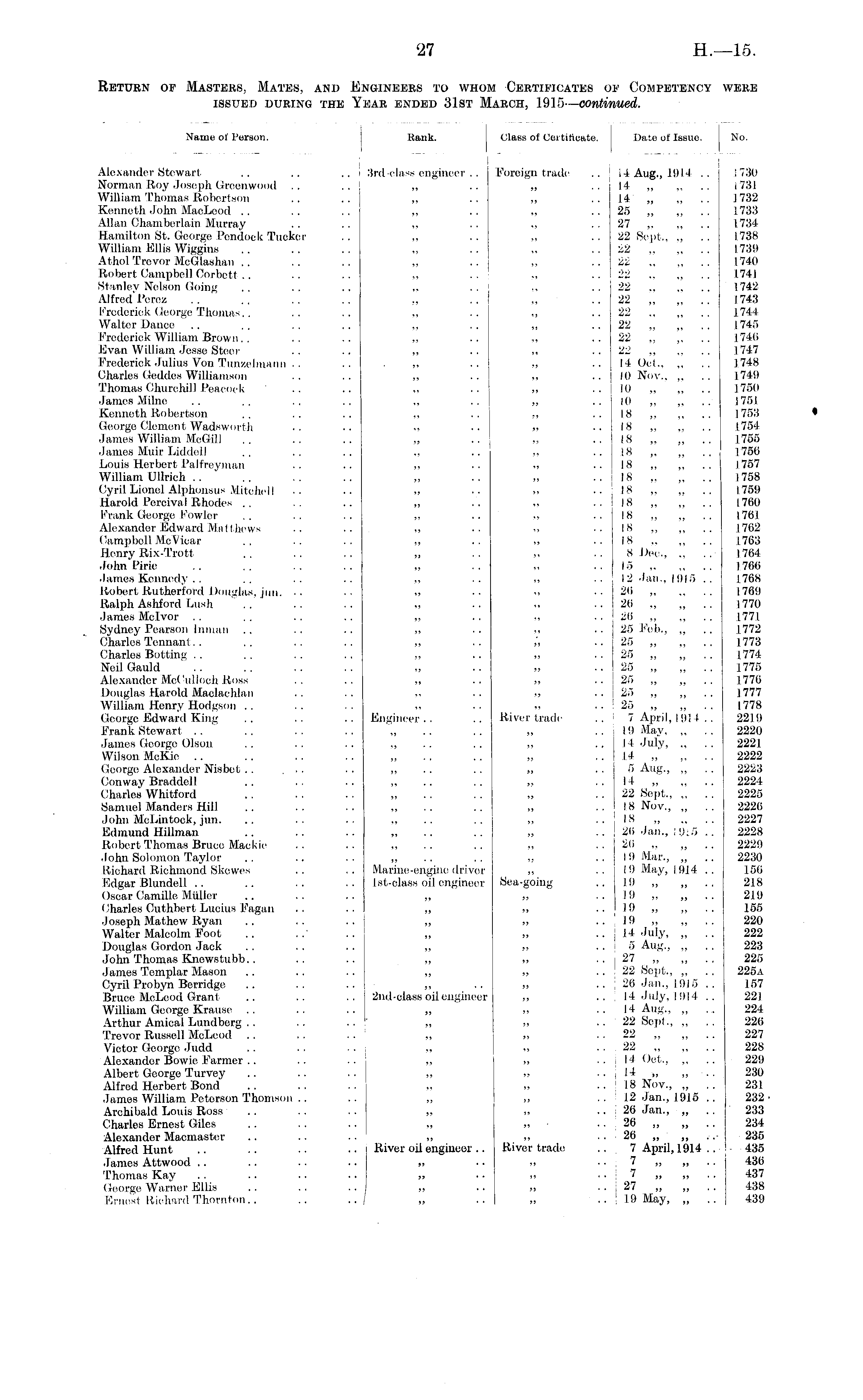 Return of Masters, Mates, and Engineers to whom Certificates or Competency were issued during the Year ended 31st March, 1915 — continued.
