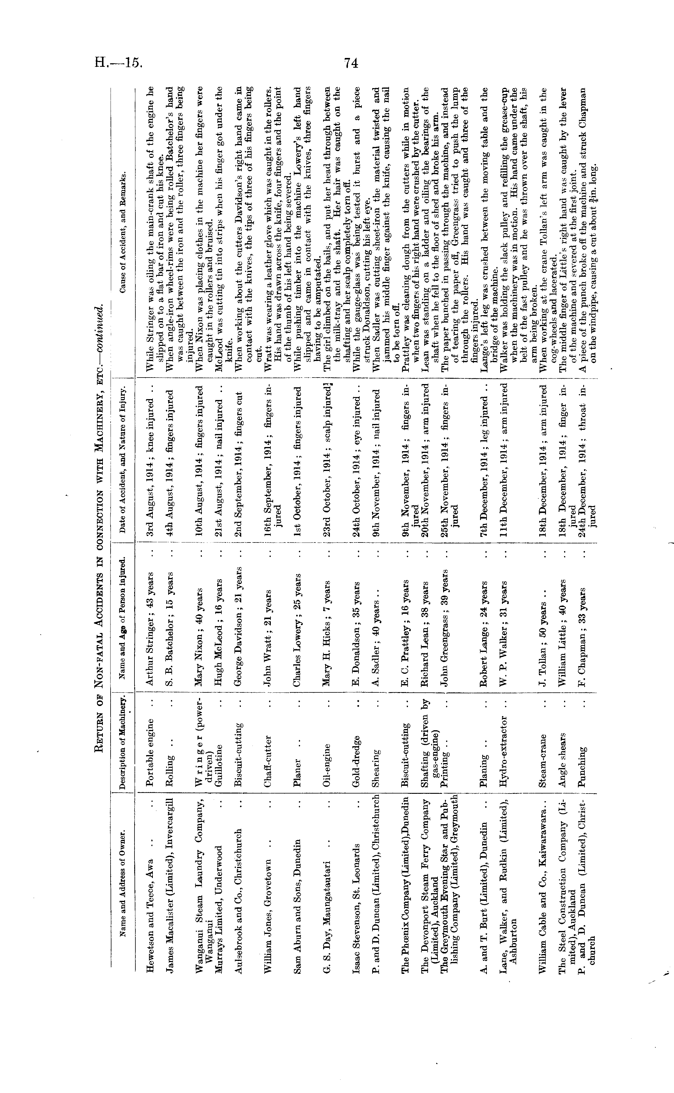 Name and Address of Owner. Description of Machinery. Name and Age of Person injured. Date of Accident, and Nature of Injury. Cause of Accident, and Remarks. Hewetson and Teeee, Awa .. .. Portable engine .. Arthur Stringer; 43 years .. 3rd August, 1914 ; knee injured .. While Stringer was oiling the main-crank shaft of the engine he slipped on to a flat bar of iron and cut his knee. James Macalister (Limited), Invercargill Rolling .. .. S. B. Batchelor; 15 years .. j 4th August, 1914 ; fingers injured When angle-iron wheel-rims were being rolled Batchelor's hand was caught between the iron and the roller, three fingers being injured. Wanganui Steam Laundry Company, Wringer (power- Mary Nixon ; 40 years .. i 10th August, 1914 ; fingers injured When Nixon was placing clothes in the machine her fingers were Wanganui driven) caught in the rollers and bruised. Murrays Limited, Underwood .. Guillotine • • Hugh McLeod ; 16 years .. : 21st August, 1914 ; nail injured .. McLeod was cutting tin into strips when his finger got under the knife. Aulsebrook and Co., Christchurch .. Biscuit-cutting .. George Davidson ; 21 years .. | 2nd September, 1914 ; fingers cut When working about the cutters Davidson's right hand came in contact witi the knives, the tips of three of his fingers being cut. William Jones, Grovetown .. .. Chaff-cutter .. JohnWratt; 21 years .. 16th September, 1914 ; fingers in- Wratt was wearing a leather glove which was caught in the rollers. jured His hand was drawn across the knife, four fingers and the point of the thumb of his left hand being severed. Sam Aburn and Sons, Dunedin . . Planer .. .. Charles Lowery; 25 years .. 1st October, 1914; fingers injured While pushing timber into the machine Lowery's left hand slipped and came in contact with the knives, three fingers having to be amputated. G. S. Day, Maungatautari .. .. Oil-engine .. Mary H. Hicks ; 7 years .. 23rd October, 1914 ; scalp injured] The girl climbed on the bails, and put her head through between the milk-tray and the shaft. Her hair was caught on the shafting and her scalp completely torn off. Isaac Stevenson, St. Leonards .. Gold-dredge .. E. Donaldson; 35 years .. 24th October, 1914 ; eye injured .. While the gauge-glass was being tested it burst and a piece struck Donaldson, cutting his left eye. P. and D. Duncan (Limited), Christchurch Shearing .. A. Sadler; 40 years .. .. 9th November, 1914 ; nail injured When Sadler was cutting sheet-iron the material twisted and jammed his middle finger against the knife, causing the nail to be torn off. The Phoenix Company (Limited), Dunedin Biscuit-cutting .. E. C. Prattley ; 16 years .. 9th November, 1914 ; fingers in- Prattley was cleaning dough from the cutters while in motion jured when two fingers of his right hand were crushed by the cutter. The Devonport Steam Ferry Company Shafting (driven by Richard Lean; 38 years .. i 20th November, 1914 ; arm injured Lean was standing on a ladder and oiling the bearings of the (Limited), Auckland gas-engine) I shaft when he fell to the floor of shed and broke his arm. The Greymouth Evening Star and Pub- Printing .. .. John Greengrass ; 39 years .. ; 25th November, 1914 ; fingers in- The paper bunched in passing through the machine, and instead lishing Company (Limited), Greymouth j jured of tearing the paper off, Greengrass tried to push the lump through the rollers. His hand was caught and three of the fingers injured. A. and T. Burt (Limited), Dunedin .. Planing .. .. Robert Lange ; 24 years .. 7th December, 1914 ; leg injured .. Lange's left leg was crushed between the moving table and the bridge of the machine. Lane, Walker, and Rudkin (Limited), Hydro-extractor .. W. P. Walker; 31 years .. 11th December, 1914 ; arm injured Walker was holding the slack pulley and refilling the grease-cup Ashburton when the machinery was in motion. His hand came under the belt of the fast pulley and he was thrown over the shaft, his arm being broken. William Cable and Co., Kaiwarawara.. Steam-crane .. J. Tollan ; 50 years .. .. 18th December, 1914 ; arm injured When working at the crane Tollan's left arm was caught in the cog-wheels and lacerated. The Steel Construction Company (Li- Angle shears .. William Little ; 40 years .. 18th December, 1914 ; finger in- The middle finger of Little's right hand was caught by the lever mited), Auckland I jured of the machine and severed at the first joint. P. and D. Duncan (Limited), Christ- Punching .. 1". Chapman ; 33 years .. 24th December, 1914; throat in- A piece of the punch broke off the machine and struck Chapman church jured on the windpipe, causing a cut about Jin. long.