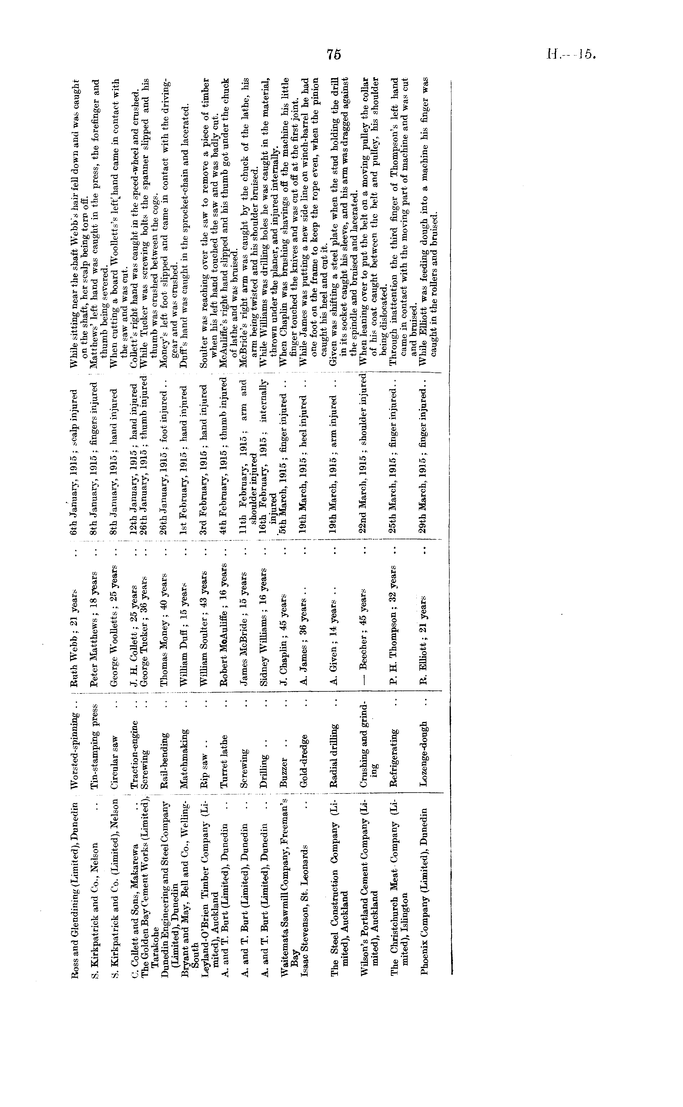 Ross and Glendining (Limited), Bunedin Worsted-spinning .. Ruth Webb ; 21 years .. 6th January, 1915 ; scalp injured While sitting near the shaft Webb's hair fell down and was caught on the shaft, her scalp being torn off. S. Kirkpatrick and Co., Nelson .. j Tin-stamping press j Peter Matthews ; 18 years .. I 8th January, 1915 ; fingers injured j Matthews' left hand was caught in the press, the forefinger and thumb being severed. S. Kirkpatrick and Co. (Limited), Nelson Circular saw .. j George Woolletts ; 25 years .. 8th January, 1915 ; hand injured When cutting a board Woolletts's left-hand came in contact with the saw and was cut. C. Collett and Sons, Makarewa .. Traction-engine .. i J. H. Collett; 25 years .. 12th January, 1915 ; hand injured Collett's right hand was caught in the speed-wheel and crushed. The Golden Bay Cement Works (Limited),; Screwing .. 1 George Tucker; 36 years .. 26th January, 1915 ; thumb injured While Tucker was screwing bolts the spanner slipped and Ms Tarakohe thumb was crushed between the cogs. Bunedin Engineering and Steel Company j Rail-bending .. j Thomas Money ; 40 years .. 26th January, 1915; foot injured .. Money's left foot slipped and came in contact with the driving(Limited), Bunedin i j gear and was crushed. Bryant and May, Bell and Co., Welling- Matchmaking .. I William Buff; 15 years .. 1st February, 1915 ; hand injured Buff's hand was caught in the sprocket-chain and lacerated. South | Leyland-O'Brien Timber Company (Li- Rip saw .. .. William Soulter; 43 years .. ! 3rd February, 1915 ; hand injured Soulter was reaching over the saw to remove a piece of timber mited), Auckland I j ! when his left hand touched the saw and was badly cut. A. and T. Burt (Limited), Bunedin .. j Turret lathe .. Robert MoAuliffe ; 16 years .. 4th February, 1915 ; thumb injured McAuliffe's right hand slipped and his thumb got under the chuck of lathe and was bruised. A. and T. Burt (Limited), Bunedin .. j Screwing .. James McBride ; 15 years .. 11th February, 1915 ; arm and McBride's right arm was caught by the chuck of the lathe, his shoulder injured arm being twisted and his shoulder bruised. A. and T. Burt (Limited), Bunedin .. ' Brilling .. .. Sidney Williams ; 16 years .. 16th February, 1915 ; internally ; While Williams was drilling holes he was caught in the material, j _ injured thrown under the planer, and injured internally. Waitemata Sawmill Company, Freeman's Buzzer .. J. Chaplin; 45 years .. 5th March, 1915; finger injured .. When Chaplin was brushing shavings off the machine his little Bay finger touched the knives and was cut off at the first joint. Isaac Stevenson, St. Leonards . • Gold-dredge .. A. James ; 36 years .. .. 19th March, 1915 ; heel injured .. While James was putting a new side line on winch-barrel he had one foot on the frame to keep the rope even, when the pinion caught his heel and cut it. The Steel Construction Company (Li- Radial drilling .. A. Given ; 14 years .. .. 19th March, 1915 : arm injured .. Given was shifting a steel plate when the stud holding the drill mited), Auckland in its socket caught his sleeve, and his arm was dragged against the spindle and bruised and lacerated. Wilson's Portland Cement Company (Li- Crushing and grind- — Beecher; 45 years .. 22nd March, 1915 ; shoulder injured When leaning over to put the belt on a moving pulley the collar mited), Auckland ing of his coat caught between the belt and pulley, his shoulder being dislocated. The Christchurch Meat Company (Li- Refrigerating .. P.H.Thompson; 32 years .. 25th March, 1915 ; finger injured.. Through inattention the third finger of Thompson's left hand mited), Islington came in contact with the moving part of machine and was cut and bruised. Phoenix Company (Limited), Bunedin Lozenge-dough .. R. Elliott; 21 years .. 29th March, 1915 : finger injured.. Wliile Elliott was feeding dough into a machine his finger was caught in the rollers and bruised.