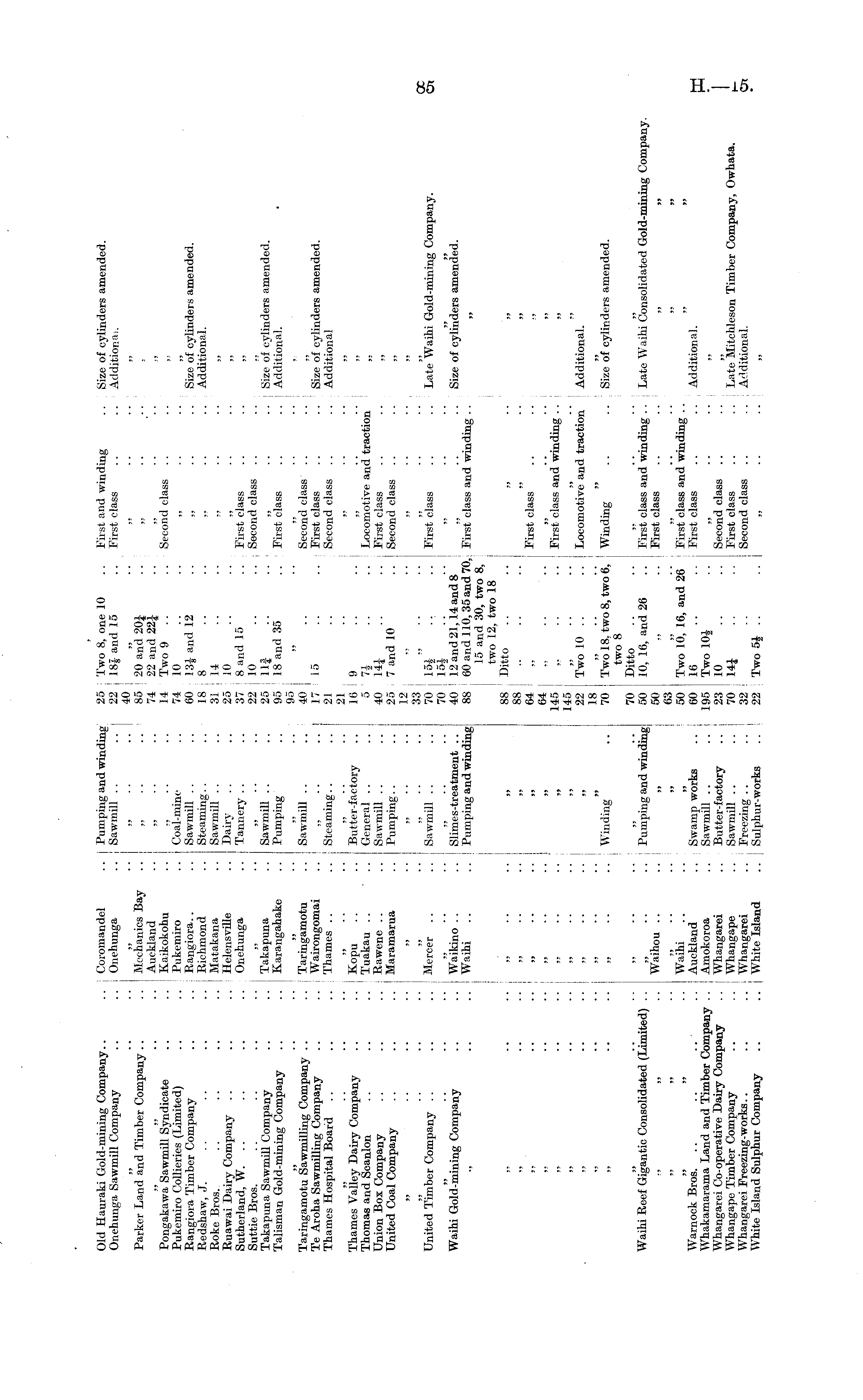 Old Hauraki Gold-mining Company.. .. Coromandel .. j Pumping and winding 25 i Two 8, one 10 .. First and winding .. Size of cylinders amended. Onehunga Sawmill Company .. .. Onehunga .. ; Sawmill .. .. j 22 18J and 15 .. First class .. .. Additional. •• 40, Parker Land and Timber Company.. .. Mechanics Bay .. j „ .. .. 85 20 and 20J .. „ .. .. , „ „ .. .. Auckland .. | „ .. .. 74 22 and 22J .. „ .. . ., Pongakawa Sawmill Syndicate .. .. Kaikokohu .. | „ .. .. 14 Two 9 .. .. Second class .. .. ,, Pukemiro Collieries (Limited) .. .. Pukemiro .. Coal-mine .. 74 10 .. .. „ .. .. „ Rangiora Timber Company .. .. Rangiora.. .. Sawmill .. .. 80 13J and 12 .. „ .. .. Size of cylinders amended. Redshaw, J. .. .. .. .. Richmond .. Steaming.. .. 18 8 .. .. ,, .. .. j Additional. Roke Bros. .. .. .. .. Matakana .. Sawmill .. .. 31 14 .. .. „ .. .. „ Ruawai Dairy Company .. .. .. Helensville .. Dairy .. .. 25 10 .. .. .. .. Sutherland, W. .. .. .. Onehunga .. j Tannery .. .. 37 8 and 15 .. First class .. .. „ Suttie Bros. .. .. .. .. j „ .. ,, .. .. 22 10 .. .. j Second class .. .. „ Takapuna Sawmill Company .. .. Takapuna .. Sawmill .. .. 25 llf .. .. „ .. .. Size of cylinders amended. Talisman Gold-mining Company .. .. Karangahake .. Pumping .. 95 18 and 35 .. First class .. .. ! Additional. „ .. .. „ .. „ 95 „ .. ,, .. .. : , Taringamotu Sawmilling Company .. .. Taringamotu .. Sawmill .. .. 40 .. Second class .. .. „ Te Aroha Sawmilling Company .. Wairongomai .. j „ .. .. 17 15 .. .. First class .. .. Size of cylinders amended. Thames Hospital Board .. .. . • Thames .. .. ! Steaming.. ..21 .. Second class .. .. Additional „ ..21 .. „ , Thames Valley Dairy Company .. .. Kopu .. .. Butter-factory .. 16 9 .. .. „ .. .. „ Thomas and Scanlon .. .. .. Tuakau .. ' .. ! General .. .. 5 7| .. .. Locomotive and traction ,, Union Box Company . . .. .. Rawene .. .. j Sawmill .. .. 40 14J .. .. First class .. .. „ United Coal Company .. .. .. Maramarua .. ! Pumping.. .. 25 7 and 10 .. Second class .. .. „ | 12 .. I „ ..33 „ United Timber Company .. .. .. Mercer .. .. Sawmill .. .. 70 15J .. .. First class .. .. Late Waihi Gold-mining Company. „ .. .. .. „ .. .. 70 15J .. .. I „ .. .. „ „ Waihi Gold-mining Company .. .. Waikino .. .. Slimes-treatment .. 40 12 and 21, 14 and 8 „ .. .. Size of cylinders amended. .. .. Waihi .. .. Pumping and winding 88 60 and 110, 35 and 70. First class and winding .. „ 15 and 30, two 8, two 12, two 18 ,. .. „ .. „ 88 Ditto .... „ .. „ .. „ 88 ,, .. „ .. „ 64 „ First class .. .. ., • • | „ 64 ,, .. .. „ 145 ,, .. .. First class and winding .. „ .. „ 145 „ .. „ .. „ 22 Two 10 .. .. Locomotive and traction Additional. ......... „ 18 „ .. .. ,, .. .. j Winding .. 70 Two 18, two 8, two 6, Winding .. .. Size of cylinders amended. two 8 „ .. „ .. „ 70 Ditto .. .. „ .. .. „ Waihi Reef Gigantic Consolidated (Limited) .. „ .. .. Pumping and winding 50 10, 16, and 26 .. First class and winding .. Late Waihi Consolidated Gold-mining Company. ., „ .. Waihou .. .. „ 50 „ .. First class .... „ „ ....... „ 63 „ .. „ .... „ „ .. Waihi .... „ 50 Two 10, 16, and 26 First class and winding .. ,, „ Warnock Bros. .. .. .. .. Auckland .. Swamp works .. 60 16 .. .. First class .. .. Additional. Whakamarama Land and Timber Company . . Amokoroa .. Sawmill .. .. 195 Two 10-1 .. ,, .. .. ,, Whangarei Co-operative Dairy Company .. Whangarei .. Butter-factory .. 23 10 .. .. Second class .. .. Whangape Timber Company .. .. Whangape .. Sawmill .. .. 70 14J .. .. First class .. .. Late Mitchleson Timber Company, Owhata. Whangarei Freezing-works.. .. .. Whangarei .. Freezing .. .. 32 .. Second class .. .. Additional. White Island Sulphur Company .. .. White Island .. ; Sulphur-works .. 22 Two 5J .. .. „ .. .. „