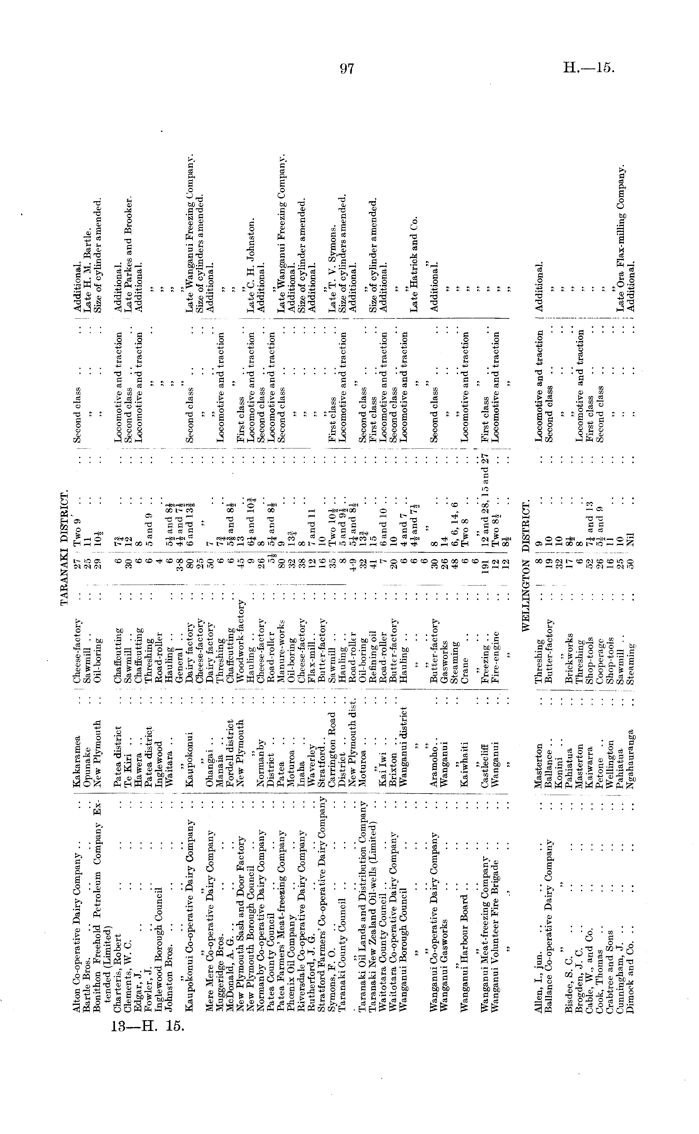 TARANAKI DISTRICT. Alton Co-operative Dairy Company .. .. Kakaramea .. J Cheese-factory . . 27 Two 9 .. .. Second class .. .. ! Additional. Bartle Bros. .. .. .. .. Opunake .. Sawmill .. .. 25 11 .. .. „ .. . . Late H. M. Bartle. Bonithon Freehold Petroleum Company Ex- New Plymouth . . Oil-boring .. 29 10£ .. .. ,, .. . . Size of cylinder amended. tended (Limited) Charteris, Robert .. .. . . Patea district . . Chaffcutting .. 6 7J .. .. Locomotive and traction Additional. Clements, W. C. .. .. Te Kiri .. .. Sawmill .. .. 30 12 .. .. Second class .. .. Late Parkes and Brooker. Edgar, J. .. .. .. .. Hawera .. .. Chaffcutting .. 6 8 .. .. Locomotive and traction Additional. Fowler, J. .. .. .. . . Patea district .. Threshing .. 6 5 and 9 .. .. „ .. „ Inglewood Borough Council .. .. Inglewood .. Road-roller 4 „ „ Johnston Bros. .. .. .. .. Waitara .. .. Hauling .. .. 6 5Jand8J .. „ „ „ .. .. .. .. „ .. General .. .. 3-8 4J and 7\ .. „ „ Kaupokonui Co-operative Dairy Company .. Kaupokonui .. Dairy factory .. 80 6andl3f .. Second class .. .. Late Wanganui Freezing Company. „ ,, .. ,, .. Cheese -factory .. 25 „ .. ,, .. .. Size of cylinders amended. Mere Mere Co-operative Dairy Company .. Ohangai .. .. Dairy factory .. 50 7 .. .. ,, .. .. Additional. Muggeridge Bros. .. .. .. Manaia .. .. Threshing .. 6 7| .. .. Locomotive and traction „ McDonald, A. G. .. .. .. .. Fordell district .. ChafEcutting .. 6 of and 8J . .. „ „ New Plymouth Sash and Door Factory .. New Plymouth . . Woodwork-factory 45 13 .. .. First class .. .. „ New Plymouth Borough Council .. .. „ .. Hauling .. .. 9 6£ and lOf .. Locomotive and traction Late C. H. Johnston. Normanby Co-operative Dairy Company .. Normanby .. Cheese -factory .. 26 8 .. .. Second class .. .. Additional. Patea County Council .. .. .. District .. .. Road-roller .. 5£ and 8i .. Locomotive and traction „ Patea Farmers' Meat-freezing Company .. Patea .. .. Manure-works .. 80 9 .. .. Second class .. .. Late Wanganui Freezing Company. Phoenix Oil Company .. .. .. Moturoa .. .. Oil-boring .. 32 13f .. .. „ .. .. Additional. Riversdale Co-operative Dairy Company .. Inaha .. .. Cheese -factory .. 38 8 .. .. „ .. .. Size of cylinder amended. Rutherford, J. G. .. .. .. .. Flax-mill.. .. 12 7 and 11 .. „ .. .. Additional. Stratford Farmers' Co-operative Dairy Company* Stratford.. .. Butter-factory .. 16 10 .. .. „ .. .. „ Symons, F. O. .. .. .. .. Carrington Road .. Sawmill .. .. 35 Two 10J .. .. j First class .. . . Late T. V. Symons. Taranaki County Council .. .. .. District .. .. Hauling .. .. 8 5 and 9£ .. .. ; Locomotive and traction Size of cylinders amended. „ .. .. .. New Plymouth dist. Road-roller .. 4-9 5Jand8£ .. „ Additional. Taranaki Oil Lands and Distribution Company Moturoa .. .. Oil-boring .. 32 13f .. .. Second class .. .. „ Taranaki New Zealand Oil-wells (Limited) .. „ .. .. Refining oil .. 41 15 .. .. First class .. .. Size of cylinder amended. Waitotara County Council .. .. .. Kai Iwi .. .. Road-roller .. 7 6 and 10 .. .. Locomotive and traction Additional. Waitotara Co-operative Dairy Company .. Brixton .. .. Butter-factory .. 20 10 .. .. Second class .. .. „ Wanganui Borough Council .. .. Wanganui district Hauling .. .. 6 4 and 7 .. .. Locomotive and traction „ „ .. .. .. „ „ ..6 4Jand7i .. „ Late Hatrick and Co. ...... „ 6 .. „ Wanganui Co-operative Dairy Company .. Aramoho.. .. Butter-factory .. 30 8 .. .. Second class .. .. Additional. Wanganui Gasworks .. .. .. Wanganui .. Gasworks .. 26 14 .. .. „ .. .. „ ,, .. .. .. ,, .. Steaming .. 48 6, 6, 14, 6 .. ,, .. .. ,, Wanganui Harbour Board .. .. .. Kaiwhaiti Crane .. .. 6 Two 8 . . Locomotive and traction „ ,, . . . . . . ,, . . ,, . . . . 6 „ . . . . 1 ,, ,, Wanganui Meat-freezing Company .. .. Castlecliff .. Freezing.. .. 191 12 and 28, 15 and 27 First class .. .. „ Wanganui Volunteer Fire Brigade .. .. Wanganui .. Fire-engine .. 12 Two 8£ .. .. Locomotive and traction „ 12 8£ .. j WELLINGTON DISTRICT. Allen, L, jun. .. .. .. .. Masterton .. | Threshing .. 8 9 .. .. Locomotive and traction ! Additional. Ballance Co-operative Dairy Company .. Ballance .. .. Butter-factory .. 19 10 .. .. Second class .. .. „ ,, „ .. Konini .. .. ,, .. 32 10 . . .. „ .. .. „ Bisdee, S. C. .. .. .. .. Pahiatua .. I Brickworks .. 17 8£ .. .. ,, .. .. ,, Brogden, J. C. .. .. .. Masterton .. Threshing . . 6 8 .. .. Locomotive and traction „ Cable, W., and Co. .. .. .. Kaiwarra .. ! Shop-tools .. 52 and 13 .. First class .. .. „ Cook, Thomas .. .. .. .. Petone .. .. j Cooperage .. 26 5|- and 9 .. Second class .. .. „ Crabtree and Sons .. .. .. Wellington .. I Shop-tools .. 16 j 11 .. .. „ .. .. „ Cunningham, J. .. .. .. .. Pahiatua .. Sawmill . . .. 25 10 .. .. „ .. .. Late Ora Flax-milling Company. Dimock and Co. .. .. .. .. Ngahauranga .. Steaming .. 50 Nil .. .. „ .. .. Additional.