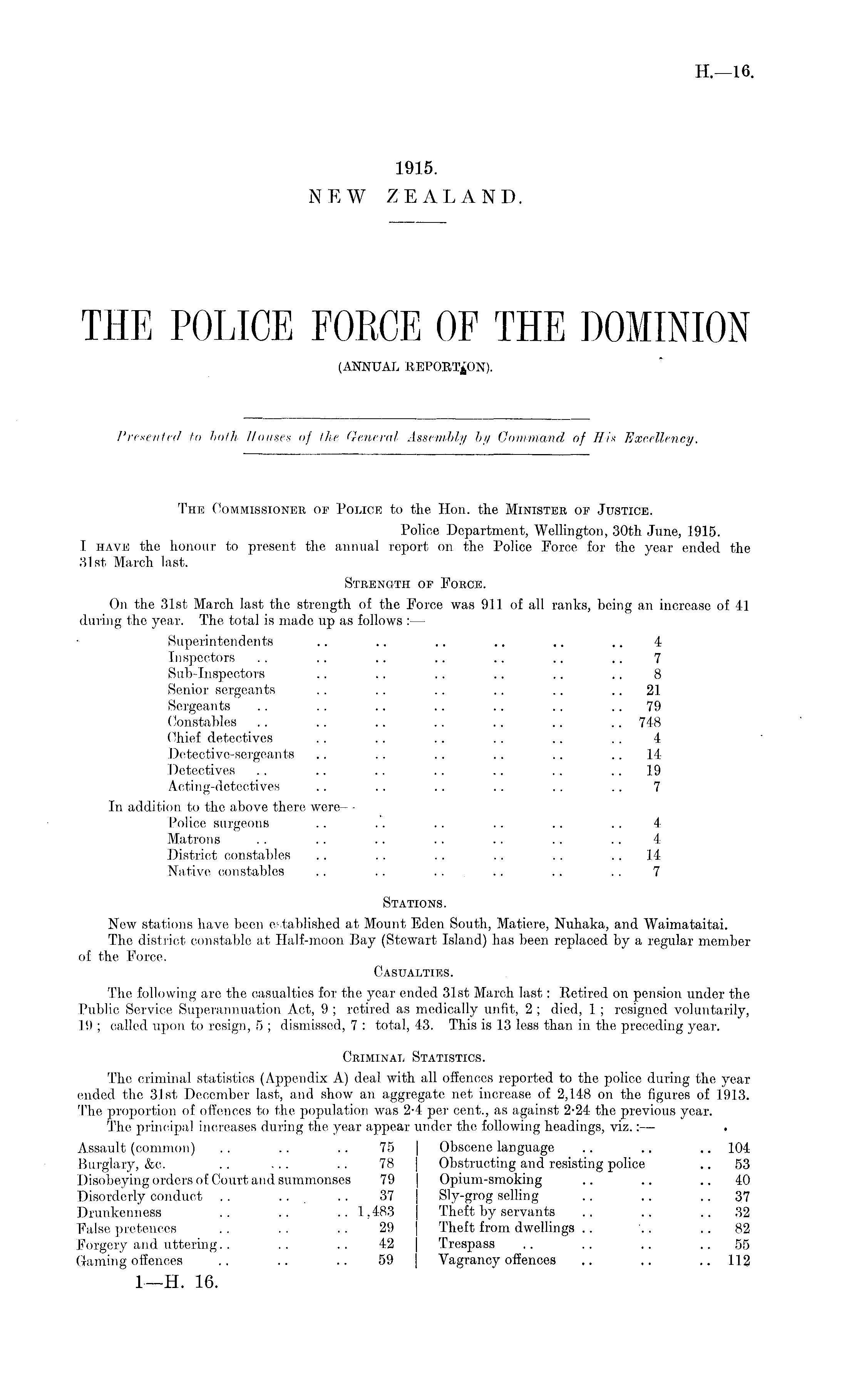 The Commissioner op Police to the Hon. the Minister op Justice. Police Department, Wellington, 30th June, 1915. I have the honour to present the annual report on the Police Force for the year ended the 31st March last. Strength of Force. On the 31st March last the strength of the Force was 911 of all ranks, being an increase of 41 during the year. The total is made up as follows : — Superintendents .. .. .. .. .. .. 4 Inspectors . . .. .. .. .. .. .. 7 Sub-Inspectors .. .. .. .. .. .. 8 Senior sergeants .. .. .. .. .. 21 Sergeants .. .. .. .. .. .. 79 Constables .. .. .. .. .. .. .. 748 Chief detectives . . .. .. .. .. .. 4 Detective-sergeants .. .. .. .. .. 14 Detectives .. .. .. .. .. .. 19 Acting-detectives .. .. .. .. .. .. 7 In addition to the above there were— Police surgeons .. .*. .. .. .. .. 4 Matrons . . .. .. .. .. .. .. 4 District constables .. .. .. .. .. 14 Native constables .. .. ... .. .. .. 7 Stations. New stations have been established at Mount Eden South, Matiere, Nuhaka, and Waimataitai. The district constable at Half-moon Bay (Stewart Island) has been replaced by a regular member of the Force. Casualties. The following are the casualties for the year ended 31st March last: Retired on pension under the Public Service Superannuation Act, 9 ; retired as medically unfit, 2 ; died, 1 ; resigned voluntarily, 19 ; called upon to resign, 5 ; dismissed, 7 : total, 43. This is 13 less than in the preceding year. Criminal Statistics. The criminal statistics (Appendix A) deal with all offences reported to the police during the year ended the 31st December last, and show an aggregate net increase of 2,148 on the figures of 1913. The proportion of offences to the population was 2-4 per cent., as against 2-24 the previous year. The principal increases during the year appear under the following headings, viz.:— . Assault (common) . . .. .. 75 Obscene language .. .. .. 104 Burglary, &c. .. ... .. 78 Obstructing and resisting police .. 53 Disobeying orders of Court and summonses 79 Opium-smoking .. .. ..40 Disorderly conduct .. ... .. 37 Sly-grog selling .. .. 37 Drunkenness .. .. .. 1,483 Theft by servants .. .. ..32 False pretences .. .. .. 29 Theft from dwellings .. '.. 82 Forgery and uttering. . . . .. 42 Trespass .. .. .. 55 Gaming offences .. .. .. 59 Vagrancy offences .. .. .. 112
