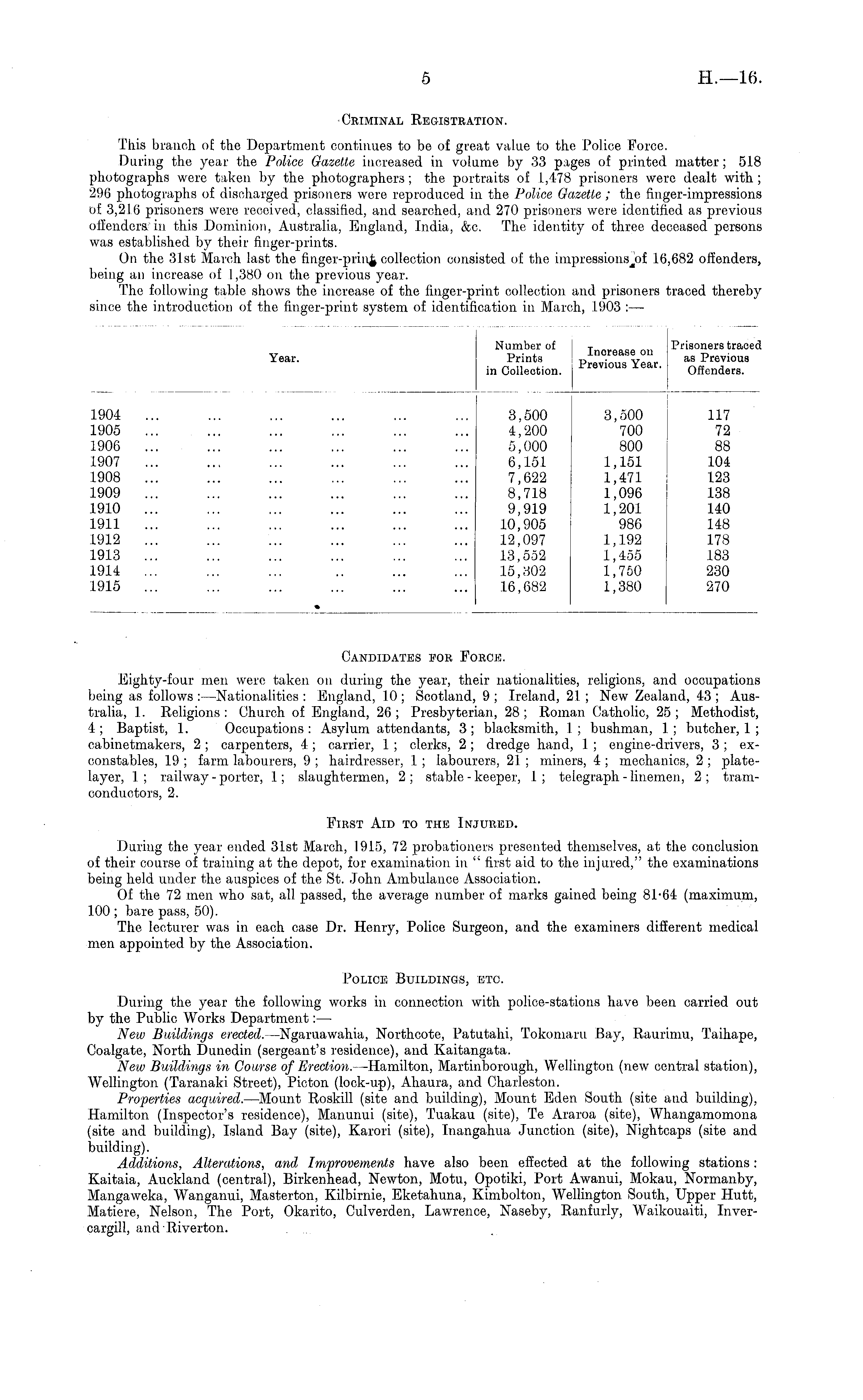 Candidates for Force. Eighty-four men were taken on during the year, their nationalities, religions, and occupations being as follows :—Nationalities : England, 10 ; Scotland, 9 ; Ireland, 21 ; New Zealand, 43 ; Australia, 1. Religions: Church of England, 26; Presbyterian, 28; Roman Catholic, 25; Methodist, 4 ; Baptist, 1. Occupations : Asylum attendants, 3 ; blacksmith, I ; bushman, 1 ; butcher, 1 ; cabinetmakers, 2 ; carpenters, 4 ; carrier, 1 ; clerks, 2 ; dredge hand, 1 ; engine-drivers, 3 ; oxconstables, 19 ; farm labourers, 9 ; hairdresser, 1 ; labourers, 21 ; miners, 4 ; mechanics, 2 ; platelayer, I; railway - porter, 1; slaughtermen, 2; stable-keeper, 1; telegraph-linemen, 2; tramconductors, 2. First Aid to the Injured. During the year ended 31st March, 1915, 72 probationers presented themselves, at the conclusion of their course of training at the depot, for examination in " first aid to the injured," the examinations being held under the auspices of the St. John Ambulance Association. Of the 72 men who sat, all passed, the average number of marks gained being 81-64 (maximum, 100 ; bare pass, 50). The lecturer was in each case Dr. Henry, Police Surgeon, and the examiners different medical men appointed by the Association. Police Buildings, etc. During the year the following works in connection with police-stations have been carried out by the Public Works Department:— New Buildings erected. --Ngaruawahia, Northcote, Patutahi, Tokomaru Bay, Raurimu, Taihape, Coalgate, North Dunedin (sergeant's residence), and Kaitangata. New Buildings in Course of Erection. —Hamilton, Martinborough, Wellington (new central station), Wellington (Taranaki Street), Picton (lock-up), Ahaura, and Charleston. Properties acquired. —Mount Roskill (site and building), Mount Eden South (site and building), Hamilton (Inspector's residence), Manunui (site), Tuakau (site), Te Araroa (site), Whangamomona (site and building), Island Bay (site), Karori (site), Inangahua Junction (site), Nightcaps (site and building). Additions, Alterations, and Improvements have also been effected at the following stations : Kaitaia, Auckland (central), Birkenhead, Newton, Motu, Opotiki, Port Awanui, Mokau, Normanby, Mangaweka, Wanganui, Masterton, Kilbirnie, Eketahuna, Kimbolton, Wellington South, Upper Hutt, Matiere, Nelson, The Port, Okarito, Cuiverden, Lawrence, Naseby, Ranfurly, Waikouaiti, Inveroargill, andßiverton.