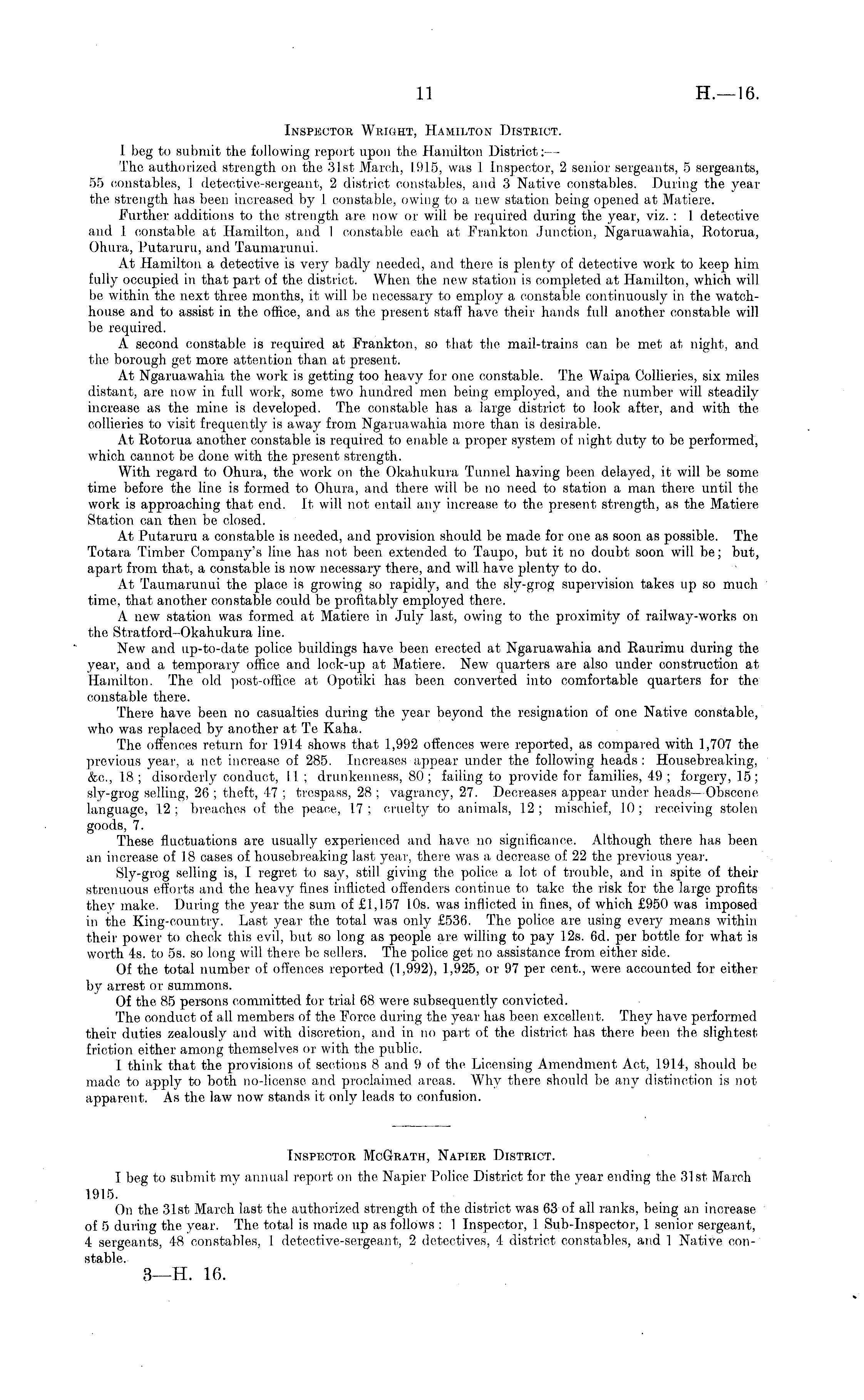 Inspector Wright, Hamilton District. 1 beg to submit the following report upon the Hamilton District: — The authorized strength on the 31st March, 1915, was I Inspector, 2 senior sergeants, 5 sergeants, 55 constables, 1 detective-sergeant, 2 district constables, and 3 Native constables. During the year the strength has been increased by 1. constable, owing to a new station being opened at Matiere. Further additions to the strength are now or will be required during the year, viz. : I detective and I constable at Hamilton, and I constable each at Frankton Junction, Ngaruawahia, Rotorua, Ohura, Putaruru, and Taumarunui. At Hamilton a detective is very badly needed, and there is plenty of detective work to keep him fully occupied in that part of the district. When the new station is completed at Hamilton, which will be within the next three months, it will be necessary to employ a constable continuously in the watchhouse and to assist in the office, and as the present staff have their hands full another constable will be required. A second constable is required at Frankton, so that the mail-trains can be met at night, and the borough get more attention than at present. At Ngaruawahia the work is getting too heavy for one constable. The Waipa Collieries, six miles distant, are now in full work, some two hundred men being employed, and the number will steadily increase as the mine is developed. The constable has a large district to look after, and with the collieries to visit frequently is away from Ngaruawahia more than is desirable. At Rotorua another constable is required to enable a proper system of night duty to be performed, which cannot be done with the present strength. With regard to Ohura, the work on the Okahukura Tunnel having been delayed, it will be some time before the line is formed to Ohura, and there will be no need to station a man there until the work is approaching that end. It will not entail any increase to the present strength, as the Matiere Station can then bo closed. At Putaruru a constable is needed, and provision should be made for one as soon as possible. The Totara Timber Company's line has not been extended to Taupo, but it no doubt soon will be; but, apart from that, a constable is now necessary there, and will have plenty to do. At Taumarunui the place is growing so rapidly, and the sly-grog supervision takes up so much time, that another constable could be profitably employed there. A new station was formed at Matiere in July last, owing to the proximity of railway-works on the Stratford-Okahukura line. New and up-to-date police buildings have been erected at Ngaruawahia and Raurimu during the year, and a temporary office and lock-up at Matiere. New quarters are also under construction at Hamilton. The old post-office at Opotiki has been converted into comfortable quarters for the constable there. There have been no casualties during the year beyond the resignation of one Native constable, who was replaced by another at Te Kaha. The offences return for 1914 shows that 1,992 offences were reported, as compared with 1,707 the previous year, a net increase of 285. Increases appear under the following heads : Housebreaking, &0., 18; disorderly conduct, II ; drunkenness, 80; failing to provide for families, 49; forgery, 15; sly-grog selling, 26 ; theft, 47 ; trespass, 28 ; vagrancy, 27. Decreases appear under heads—Obscene language, 12; breaches of the peace, 17; cruelty to animals, 12; mischief, 10; receiving stolen goods, 7. These fluctuations are usually experienced and have no significance. Although there has been an increase of 18 cases of housebreaking last year, there was a decrease of 22 the previous year. Sly-grog selling is, I regret to say, still giving the police a lot of trouble, and in spite of their strenuous efforts and the heavy fines inflicted offenders continue to take the risk for the large profits they make. During the year the sum of £1,157 10s. was inflicted in fines, of which £950 was imposed in the King-country. Last year the total was only £536. The police are using every means within their power to check this evil, but so long as people are willing to pay 12s. 6d. per bottle for what is worth 4s. to ss. so long will there be sellers. The police get no assistance from either side. Of the total number of offences reported (1,992), 1,925, or 97 per cent., were accounted for either by arrest or summons. Of the 85 persons committed for trial 68 were subsequently convicted. The conduct of all members of the Force during the year has been excellent. They have performed their duties zealously and with discretion, and in no part of the district has there been the slightest friction either among themselves or with the public. I think that the provisions of sections 8 and 9 of the Licensing Amendment Act, t914, should be made to apply to both no-liconse and proclaimed areas. Why there should be any distinction is not apparent. As the law now stands it only leads to confusion. Inspector McGrath, Napier District. I beg to submit my annual report on the Napier Police District for the year ending the 31st March 1915. On the 31st March last the authorized strength of the district was 63 of all ranks, being an increase of 5 during the year, The total is made up as follows : 1 Inspector, 1 Sub-Inspector, 1 senior sergeant, 4 sergeants, 48 constables, I detective-sergeant, 2 detectives, 4 district constables, and 1 Native constable.