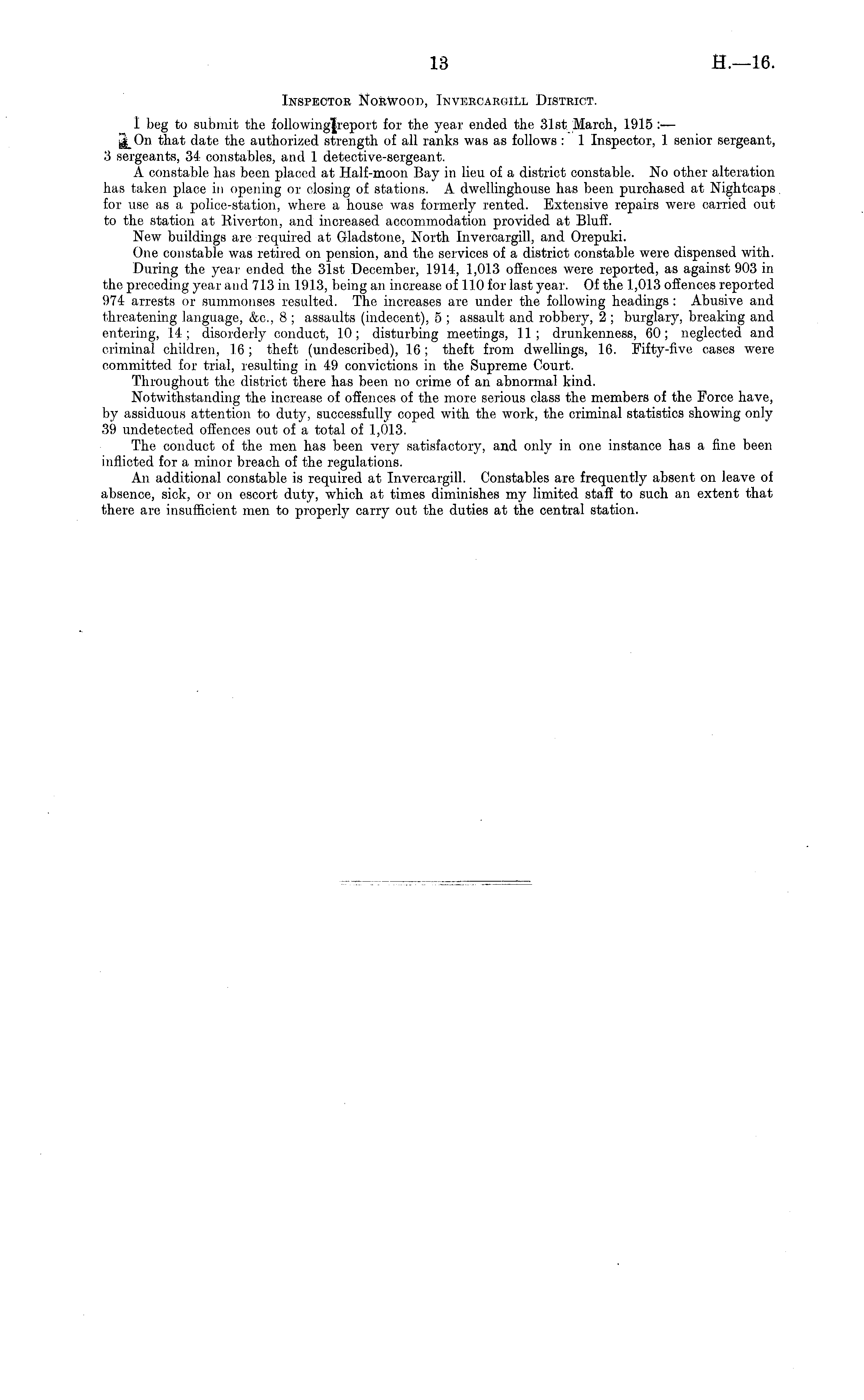 Inspector Norwood, Inveroargill District. I beg to submit the following|report for the year ended the 31st March, 1915 : — that date the authorized strength of all ranks was as follows : 1 Inspector, 1 senior sergeant, 3 sergeants, 34 constables, and 1 detective-sergeant. A constable has been placed at Half-moon Bay in lieu of a district constable. No other alteration has taken place in opening or closing of stations. A dwellinghouse has been purchased at Nightcaps for use as a police-station, where a house was formerly rented. Extensive repairs were carried out to the station at Riverton, and increased accommodation provided at Bluff. Now buildings are required at Gladstone, North Inveroargill, and Orepuki. One constable was retired on pension, and the services of a district constable were dispensed with. During the year ended the 31st December, 191.4, 1,013 offences were reported, as against 903 in the preceding year and 713 in 1913, being an increase of 110 for last year. Of the 1,013 offences reported 974 arrests or summonses resulted. The increases are under the following headings : Abusive and threatening language, &c, 8 ; assaults (indecent), 5 ; assault and robbery, 2 ; burglary, breaking and entering, 14 ; disorderly conduct, 10 ; disturbing meetings, 11 ; drunkenness, 60 ; neglected and criminal children, 16; theft (undcscribed), 16; theft from dwellings, 16. Fifty-five cases were committed for trial, resulting in 49 convictions in the Supreme Court. Throughout the district there has been no crime of an abnormal kind. Notwithstanding the increase of offences of the more serious class the members of the Force have, by assiduous attention to duty, successfully coped with the work, the criminal statistics showing only 39 undetected offences out of a total of 1,013. The conduct of the men has been very satisfactory, and only in one instance has a fine been inflicted for a minor breach of the regulations. An additional constable is required at Inveroargill. Constables arc frequently absent on leave of absence, sick, or on escort duty, which at times diminishes my limited staff to such an extent that there are insufficient men to properly carry out the duties at the central station.