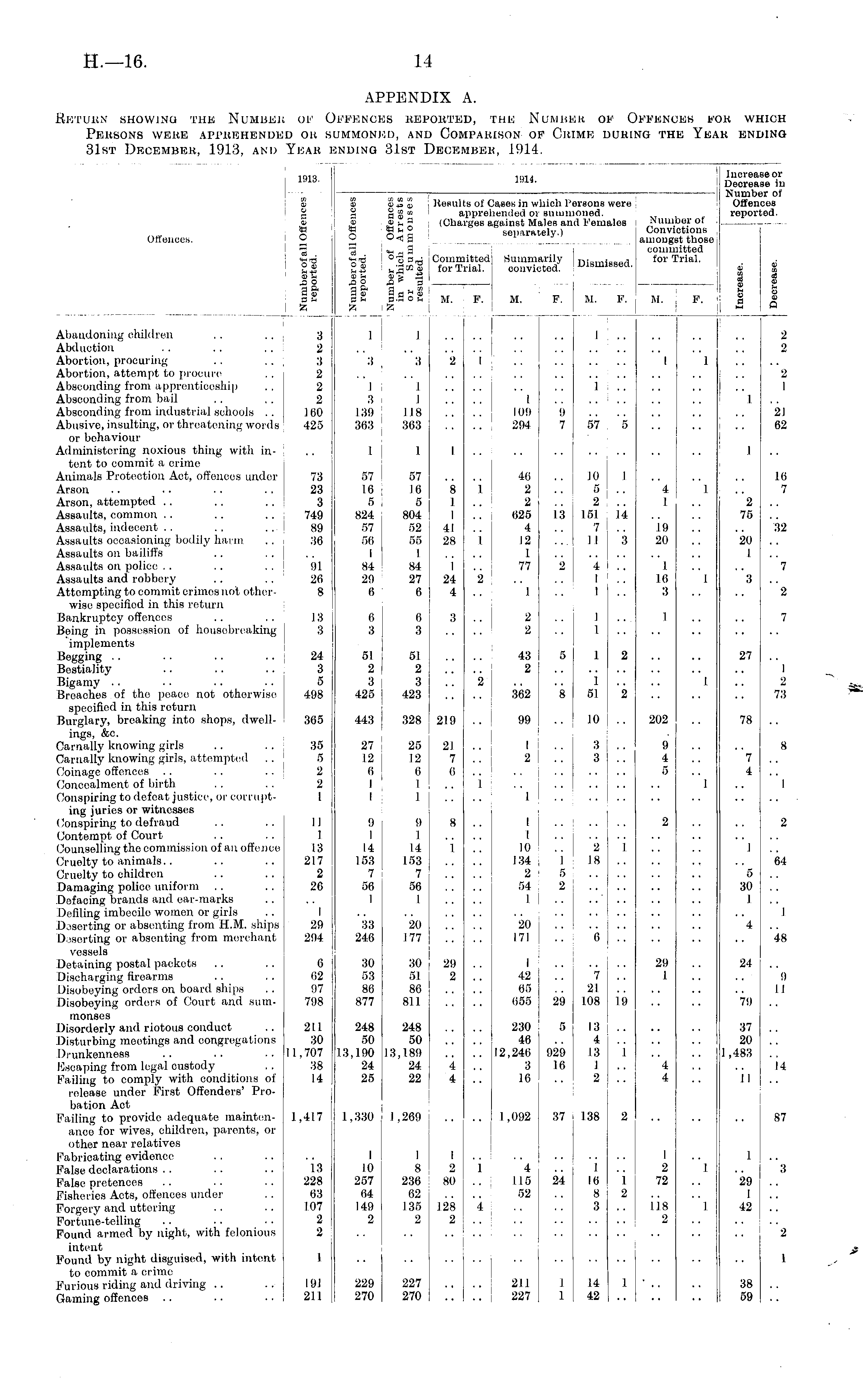 APPENDIX A. Return showing the Number of offences reported, the Number of Offences for which Persons were apprehended or summoned, and Comparison of Crime during the Year ending 31st December, 1913, and Year ending 31st December, 1914.