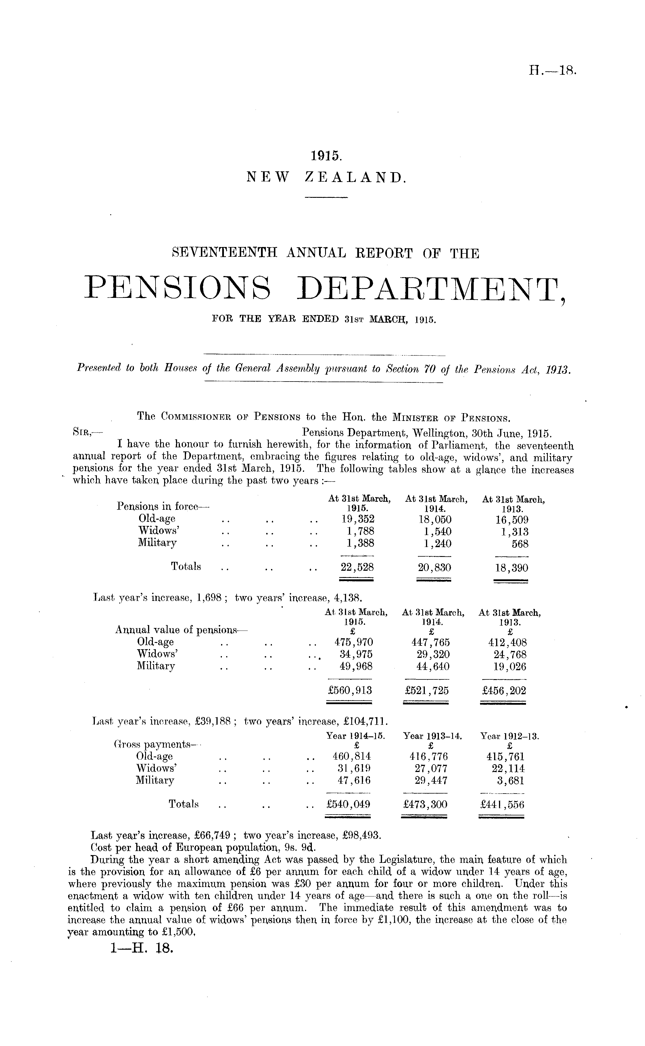 SEVENTEENTH ANNUAL REPORT OF THE PENSIONS DEPARTMENT, FOR THE YEAR ENDED 31st MARCH, 1915.