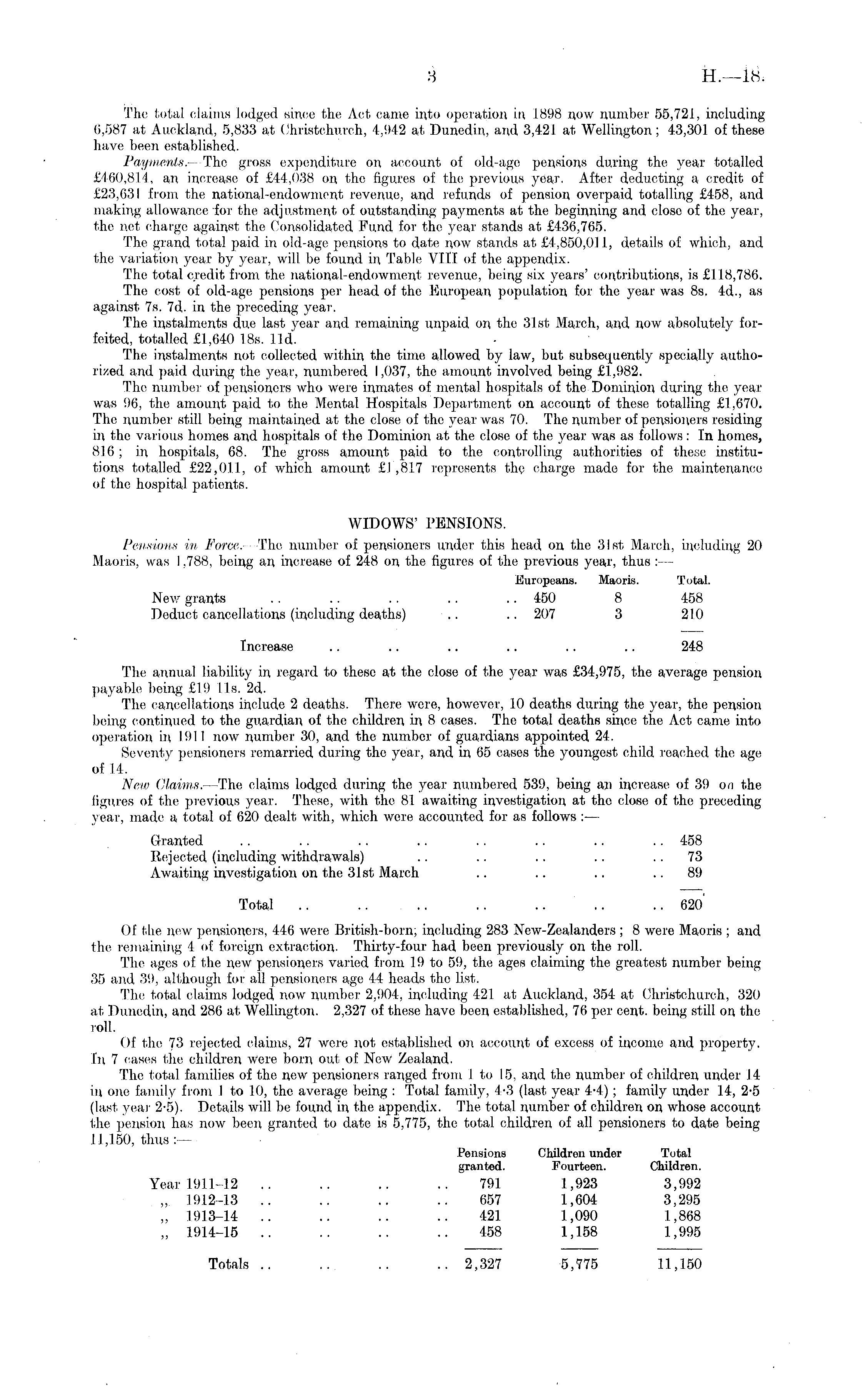The total claims lodged since the Act came into operation in 1898 now number 55,721, including 6,587 at Auckland, 5,833 at Christehurch, 4,942 at Dunedin, and 3,421 at Wellington ; 43,301 of these have been established. Payments.- The gross expenditure on account of old-age pensions during the year totalled £460,811, an increase of £44,038 on the figures of the previous year. After deducting a credit of £23,631 from the national-endowment revenue, and refunds of pension overpaid totalling £458, and making allowance for the adjustment of outstanding payments at the beginning and close of the year, the net charge against the Consolidated Fund for the year stands at £436,765. The grand total paid in old-age pensions to date now stands at £4,850,011, details of which, and the variation year by year, will be found in Table VIII of the appendix. The total credit from the national-endowment revenue, being six years' contributions, is £118,786. The cost of old-age pensions per head of the European population for the year was Bs. 4d., as against 7s. 7d. in the preceding year. The instalments due last year and remaining unpaid on the 31st March, and now absolutely forfeited, totalled £1,640 18s. lid'. The instalments not collected within the time allowed by law, but subsequently specially authorized and paid during the year, numbered 1,037, the amount involved being £1,982. The number of pensioners who were inmates of mental hospitals of the Dominion during the year was 96, the amount paid to the Mental Hospitals Department on account of these totalling £1,670. The number still being maintained at the close of the year was 70. The number of pensioners residing in the various homes and hospitals of the Dominion at the close of the year was as follows: In homes, 816 ;in hospitals, 68. The gross amount paid to the controlling authorities of these institutions totalled £22,011, of which amount £1 ,817 represents the charge made for the maintenance of the hospital patients. WIDOWS' PENSIONS. Pensions in Force. The number of pensioners under this head on the 31st March, including 20 Maoris, was 1,788, being an increase of. 248 on the figures of the previous year, thus : Europeans. Maoris. Total. New grants . . .. .. .. .. 450 8 458 Deduct cancellations (including deaths) .. .. 207 3 210 Increase .. .. .. .. .. .. 248 The annual liability in regard to these at the close of the year was £34,975, the average pension payable being £19 lis. 2d. The cancellations include 2 deaths. There wore, however, 10 deaths during the year, the pension being continued to the guardian of the children in 8 cases. The total deaths since the Act came into operation in 1911 now number 30, and the number of guardians appointed 21. Seventy pensioners remarried during the year, and in 65 cases the youngest child reached tins age; of 14. New Claims. —The claims lodged during the year- numbered 539, being an increase of 39 on the figures of the previous year. These, with the 81 awaiting investigation at the close of the preceding year, made a total of 620 dealt with, which wore accounted for as follows : — Granted .. .. .. .. .. .. .. .. 458 Rejected (including withdrawals) .. .. .. .. 73 Awaiting investigation on the 31st March .. .. .. 89 Total .. .. .. .. .. 620' Of the new pensioners, 446 were British-born; including 283 New-Zoalanders ; 8 were Maoris ; and the remaining 4of foreign extraction. Thirty-four had been previously on the roll. The ages of the new pensioners varied from 19 to 59, the ages claiming the greatest number being 35 and 39, although for all pensioners age 44 heads the list. The total claims lodged now number 2,904, including 421 at Auckland, 354 at Christehurch, 320 at Dunedin, and 286 at Wellington. 2,327 of these have been established, 76 per cent, being still on the roll. Of the 73 rejected claims, 27 were not established on account of excess of income and property. In 7 cases the children wore born out of New Zealand. The total families of the new pensioners ranged from I to 15, and the number of children under 14 in one family from Ito 10, the average being : Total family, 4-3 (last year 4-4); family under 14, 2-5 (last year 2-5). Details will be found in the appendix. The total number of children on whose account the pension has now been granted to date is 5,775, the total children of all pensioners to date being 11,150, thus :— Pensions Children under Total granted. Fourteen. Children. Year 1911-12 .. .. .. .. 791 1,923 3,992 „ 1912-13 .. .. .. .. 657 1,604 3,295 „ 1913-14 .. .. .. .. 421 1,090 1,868 „ 1914-15 .. .. .. .. 458 1,158 1,995 Totals .. ... .. .. 2,327 5,775 11,150