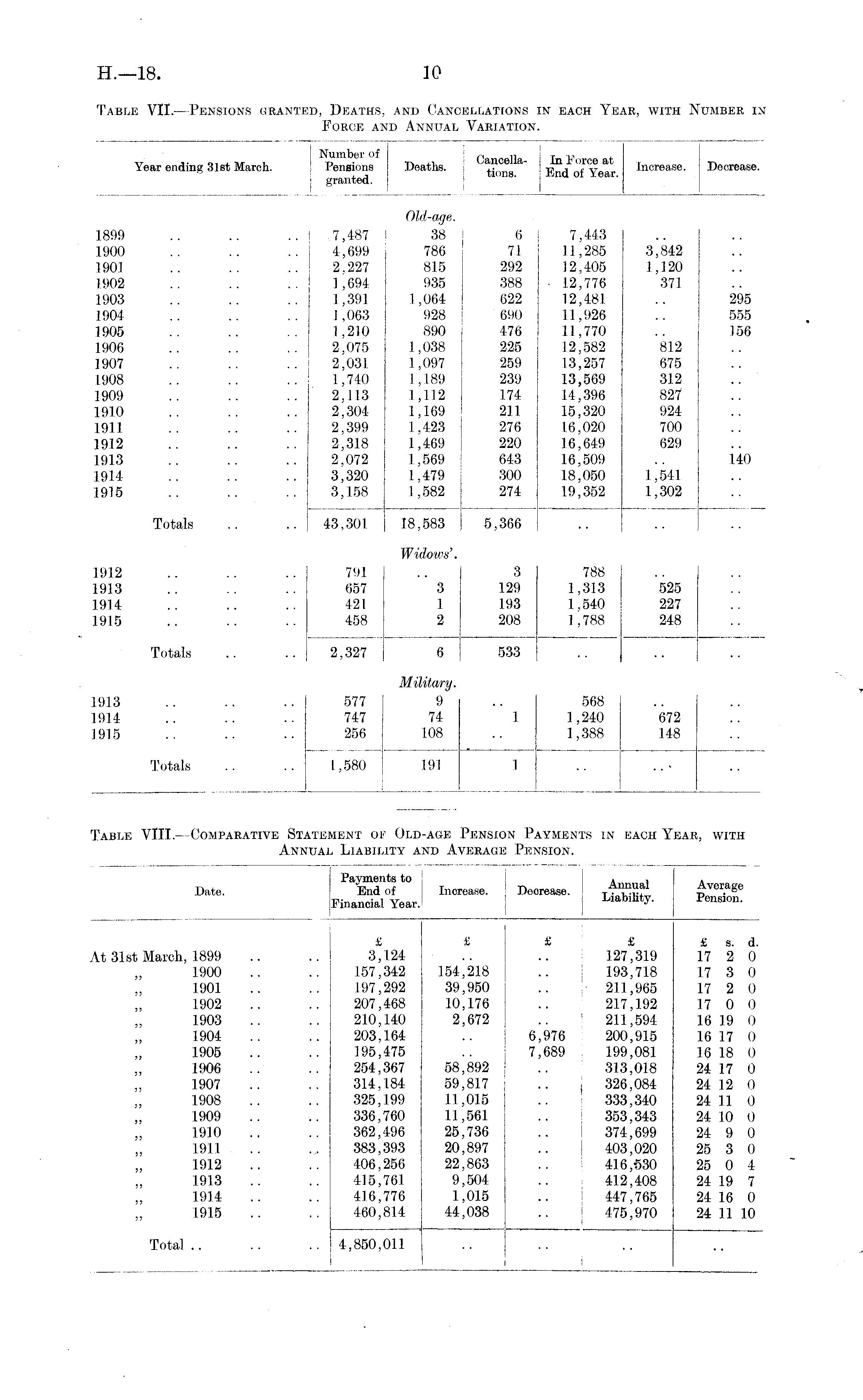 Table VIII.—Comparative Statement of Old-age Pension Payments in each Year, with Annual Liability and Average Pension.