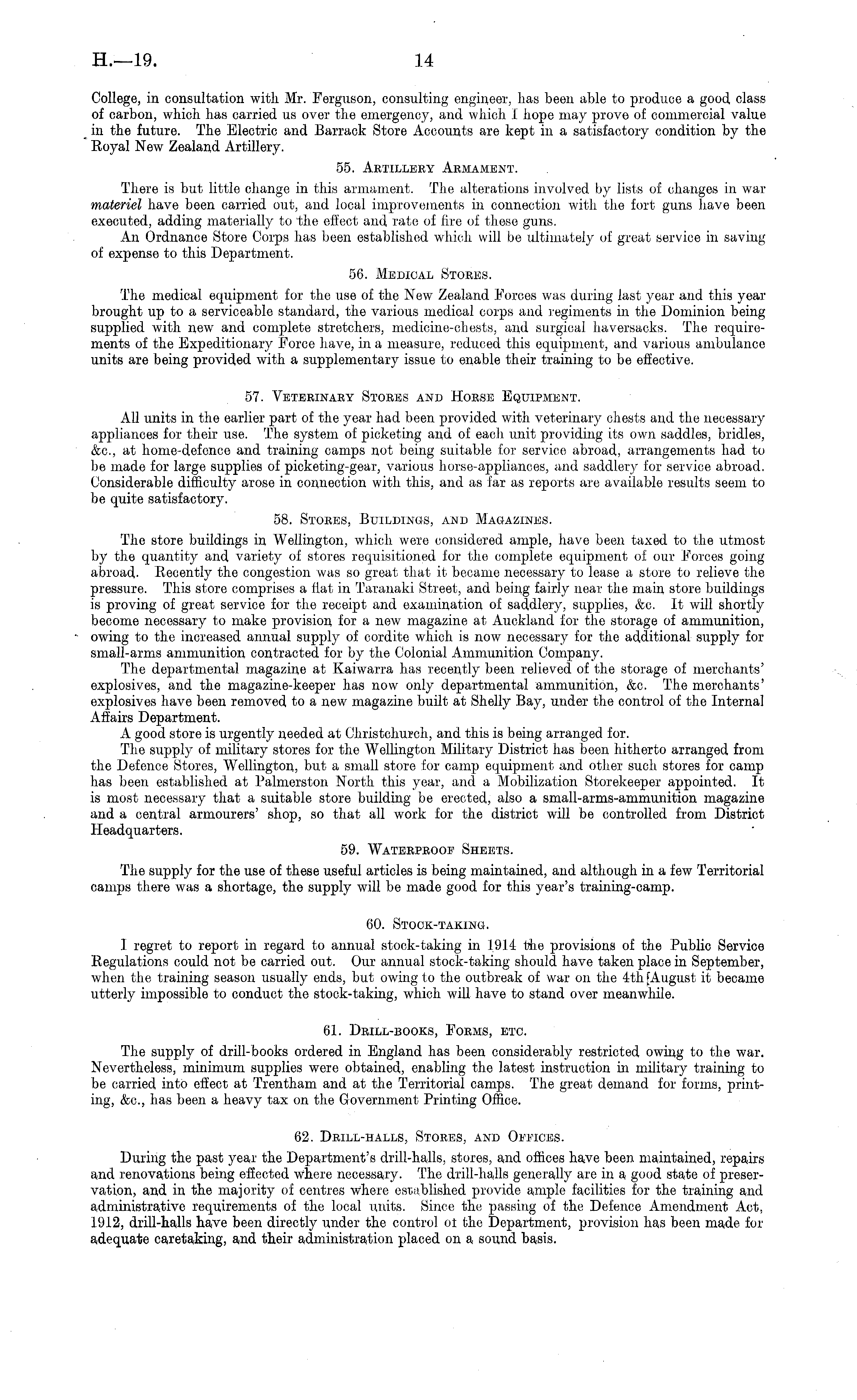 College, in consultation with Mr. Ferguson, consulting engineer, has been able to produce a good class of carbon, which has carried us over the emergency, and which I hope may prove of commercial value in the future. The Electric and Barrack Store Accounts are kept in a satisfactory condition by the Royal New Zealand Artillery. 55. Artillery Armament. There is but little change in this armament. The alterations involved by lists of changes in war materiel have been carried out, and local improvements in connection with the fort guns have been executed, adding materially to the effect and rate of fire of these guns. An Ordnance Store Corps has been established which will be ultimately of great service in saving of expense to this Department. 56. Medical Stores. The medical equipment for the use of the New Zealand Forces was during last year and this year brought up to a serviceable standard, the various medical corps and regiments in the Dominion being supplied with new and complete stretchers, medicine-chests, and surgical haversacks. The requirements of the Expeditionary Force have, in a measure, reduced this equipment, and various ambulance units are being provided with a supplementary issue to enable their training to be effective. 57. Veterinary Stores and Horse Equipment. All units in the earlier part of the year had been provided with veterinary chests and the necessary appliances for their use. The system of picketing and of each unit providing its own saddles, bridles, &c, at home-defence and training camps not being suitable for service abroad, arrangements had to be made for large supplies of picketing-gear, various horse-appliances, and saddlery for service abroad. Considerable difficulty arose in connection with this, and as far as reports are available results seem to be quite satisfactory. 58. Stores, Buildings, and Magazines. The store buildings in Wellington, which were considered ample, have been taxed to the utmost by the quantity and variety of stores requisitioned for the complete equipment of our Forces going abroad. Recently the congestion was so great that it became necessary to lease a store to relieve the pressure. This store comprises a flat in Taranaki Street, and being fairly near the main store buildings is proving of great service for the receipt and examination of saddlery, supplies, &c. It will shortly become necessary to make provision for a new magazine at Auckland for the storage of ammunition, owing to the increased annual supply of cordite which is now necessary for the additional supply for small-arms ammunition contracted for by the Colonial Ammunition Company. The departmental magazine at Kaiwarra has recently been relieved of the storage of merchants' explosives, and the magazine-keeper has now only departmental ammunition, &c. The merchants' explosives have been removed to a new magazine built at Shelly Bay, under the control of the Internal Affairs Department. A good store is urgently needed at Christchurch, and this is being arranged for. The supply of military stores for the Wellington Military District has been hitherto arranged from the Defence Stores, Wellington, but a small store for camp equipment and other such stores for camp has been established at Palmerston North this year, and a Mobilization Storekeeper appointed. It is most necessary that a suitable store building be erected, also a small-arms-ammunition magazine and a central armourers' shop, so that all work for the district will be controlled from District Headquarters. 59. Waterproof Sheets. The supply for the use of these useful articles is being maintained, and although in a few Territorial camps there was a shortage, the supply will be made good for this year's training-camp. 60. Stock-taking. 1 regret to report in regard to annual stock-taking in 1914 the provisions of the Public Service Regulations could not be carried out. Our annual stock-taking should have taken place in September, when the training season usually ends, but owing to the outbreak of war on the 4th [August it became utterly impossible to conduct the stock-taking, which will have to stand over meanwhile. 61. Drill-books, Forms, etc. The supply of drill-books ordered in England has been considerably restricted owing to the war. Nevertheless, minimum supplies were obtained, enabling the latest instruction in military training to be carried into effect at Trentham and at the Territorial camps. The great demand for forms, printing, &c, has been a heavy tax on the Government Printing Office. 62. Drill-halls, Stores, and Offices. During the past year the Department's drill-halls, stores, and offices have been maintained, repairs and renovations being effected where necessary. The drill-halls generally are in a good state of preservation, and in the majority of centres where established provide ample facilities for the training and administrative requirements of the local units. Since the passing of the Defence Amendment Act, 1912, drill-halls have been directly under the control, ot the Department, provision has been made for adequate caretaking, and their administration placed on a sound basis.