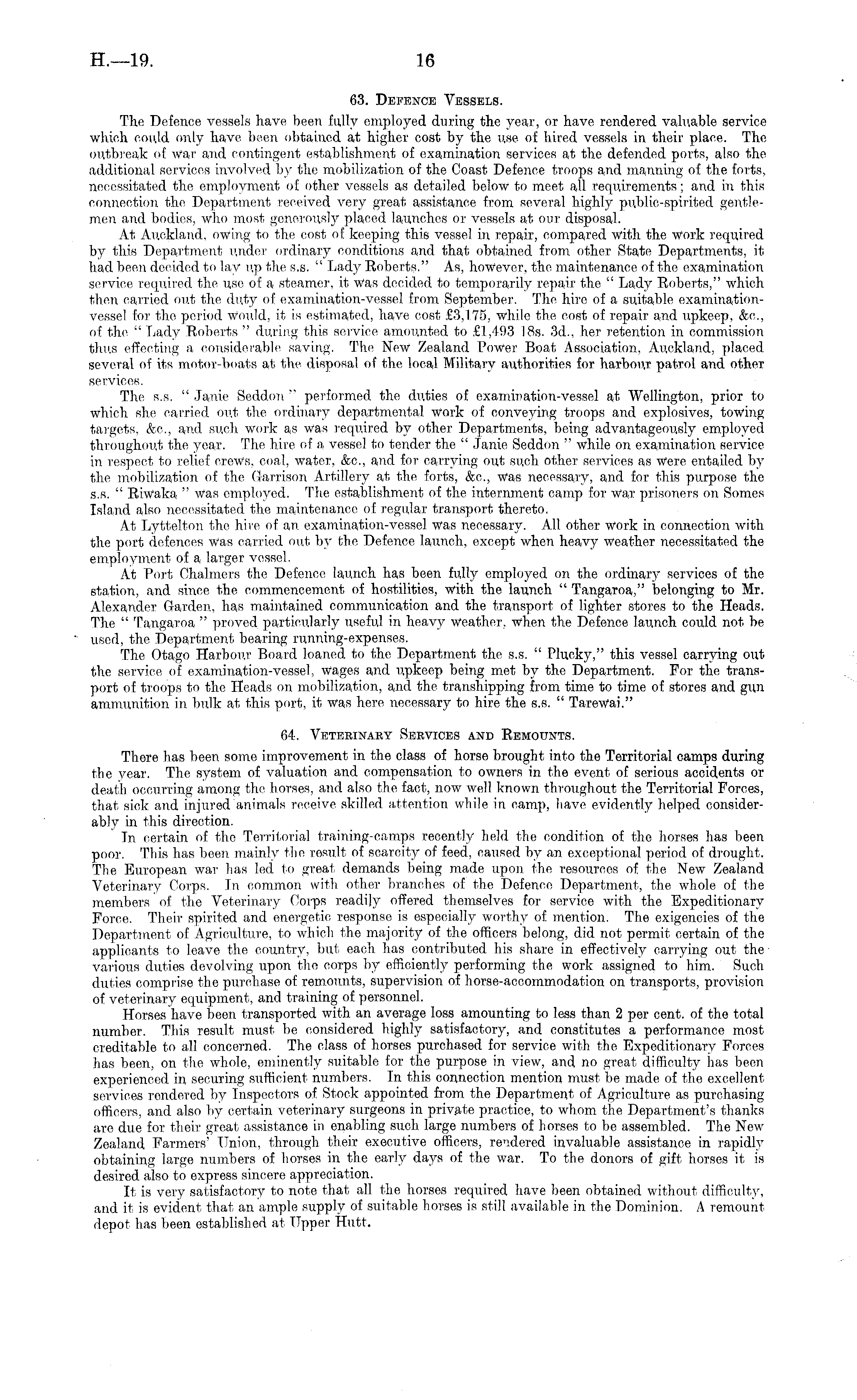 63. Defence Vessels. The Defence vessels have been fully employed during the year, or have rendered valuable service which could only have been obtained at higher cost by the use of hired vessels in their place. The outbreak of war and contingent establishment of examination services at the defended ports, also the additional services involved by the mobilization of the Coast Defence troops and manning of the forts, necessitated the employment of other vessels as detailed below to meet all requirements; and in this connection the Department received very great assistance from several highly public-spirited gentlemen and bodies, who most generously placed launches or vessels at our disposal. At Auckland, owing to the cost of keeping this vessel in repair, compared with the Work required by this Department under ordinary conditions and that obtained from other State Departments, it had been decided to lay up the s.s. " Lady Roberts." As, however, the maintenance of the examination service required the use of a steamer, it was decided to temporarily repair the " Lady Roberts," which then carried out the duty of examination-vessel from September. The hire of a suitable examinationvessel for the period Would, it is estimated, have cost £3,175, while the cost of repair and upkeep, &c, of the " Lady Roberts " during this service amounted to £1,493 18s. 3d., her retention in commission thus effecting a considerable saving. The New Zealand Power Boat Association, Auckland, placed several of its motor-boats at the disposal of the local Military authorities for harbour patrol and other services. The s.s. " Janie Seddon " performed the duties of examination-vessel at Wellington, prior to which she carried out the ordinary departmental work of conveying troops and explosives, towing targets, &c, and such work as was required by other Departments, being advantageously employed throughout the year. The hire of a vessel to tender the " Janie Seddon " while on examination service in respect to relief crews, coal, water, &c, and for carrying out such other services as Were entailed by the mobilization of the Garrison Artillery at the forts, &c, was necessary, and for this purpose the s.s. " Riwaka " Was employed. The establishment of the internment camp for war prisoners on Somes Island also necessitated the maintenance of regular transport thereto. At Lyttelton the hire of an examination-vessel Was necessary. All other work in connection with the port defences was carried out by the Defence launch, except when heavy weather necessitated the employment of a larger vessel. At Port Chalmers the Defence launch has been fully employed on the ordinary services of the station, and since the commencement of hostilities, with the launch " Tangaroa," belonging to Mr. Alexander Garden, has maintained communication and the transport of lighter stores to the Heads. The " Tangaroa " proved particularly useful in heavy weather, when the Defence launch could not be used, the Department bearing running-expenses. The Otago Harbour Board loaned to the Department the s.s. " Plucky," this vessel carrying out the service of examination-vessel, Wages and upkeep being met by the Department. For the transport of troops to the Heads on mobilization, and the transhipping from time to time of stores and gun ammunition in bulk at this port, it was here necessary to hire the s.s. " Tarewai." 64:. Veterinary Services and Remounts. There has been some improvement in the class of horse brought into the Territorial camps during the year. The system of valuation and compensation to owners in the event of serious accidents or death occurring among the horses, and also the fact, now well known throughout the Territorial Forces, that sick and injured animals receive skilled attention while in camp, have, evidently helped considerably in this direction. Tn certain of the Territorial training-camps recently held the condition of the horses has been poor. This has been mainly the result of scarcity of feed, caused by an exceptional period of drought. The European war has led to great demands being made upon the resources of the New Zealand Veterinary Corps. In common with other branches of the Defence Department, the whole of the members of the Veterinary Corps readily offered themselves for service with the Expeditionary Force. Their spirited and energetic response is especially worthy of mention. The exigencies of the Department of Agriculture, to which the majority of the officers belong, did not permit certain of the applicants to leave the country, but each has contributed his share in effectively carrying out the various duties devolving upon the corps by efficiently performing the work assigned to him. Such duties comprise the purchase of remounts, supervision of horse-accommodation on transports, provision of veterinary equipment, and training of personnel. Horses have been transported with an average loss amounting to less than 2 per cent, of the total number. This result must be considered highly satisfactory, and constitutes a performance most creditable to all concerned. The class of horses purchased for service with the Expeditionary Forces has been, on the whole, eminently suitable for the purpose in view, and no great difficulty has been experienced in securing sufficient numbers. In this connection mention must be made of the excellent services rendered by Inspectors of Stock appointed from the Department of Agriculture as purchasing officers, and also by certain veterinary surgeons in private practice, to whom the Department's thanks are due for their great assistance in enabling such large numbers of horses to be assembled. The New Zealand Farmers' Union, through their executive officers, rendered invaluable assistance in rapidly obtaining large numbers of horses in the early days of the war. To the donors of gift horses it is desired also to express sincere appreciation. It is very satisfactory to note that all the horses r