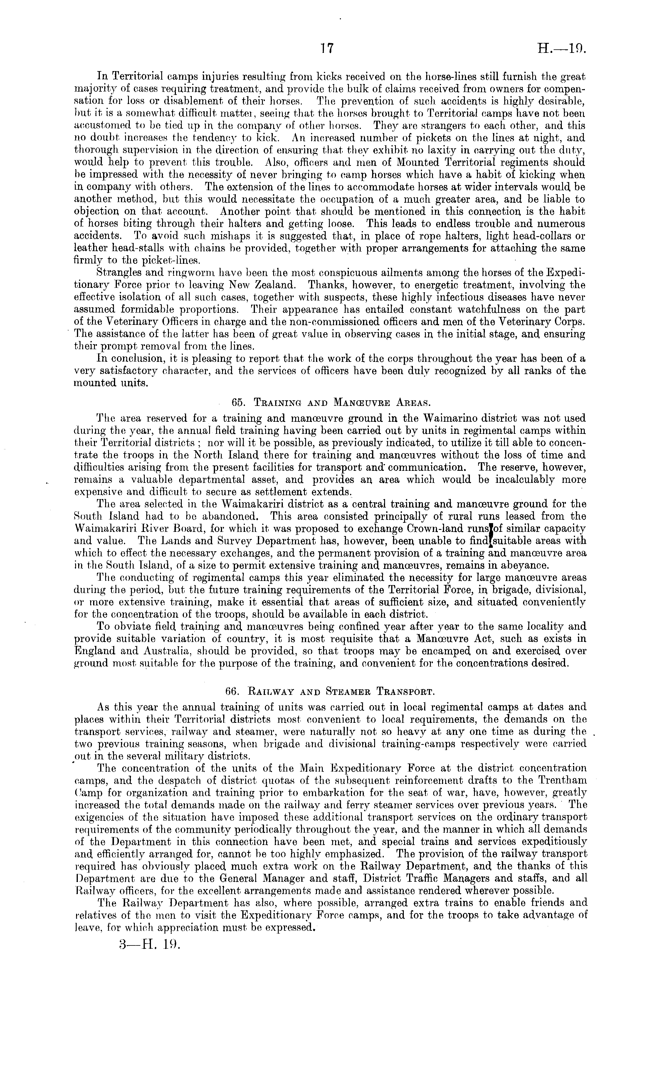 In Territorial camps injuries resulting from kicks received on the horse-lines still furnish the great majority of cases requiring treatment, and provide the bulk of claims received from owners for compensation for loss or disablement of their horses. The prevention of such accidents is highly desirable, but it is a somewhat difficult matter, seeing that the horses brought to Territorial camps have not been accustomed to be tied up in the company of other horses. They are strangers to each other, and this no doubt increases the tendency to kick. An increased number of pickets on the lines at night, and thorough, supervision in the direction of ensuring that they exhibit no laxity in carrying out the duty, would help to prevent this trouble. Also, officers and men of Mounted Territorial regiments should be impressed with the necessity of never bringing to camp horses which have a habit of kicking when in company with others. The extension of the lines to accommodate horses at wider intervals would be another method, but this would necessitate the occupation of a much greater area, and be liable to objection on that account. Another point that should be mentioned in this connection is the habit of horses biting through their halters and getting loose. This leads to endless trouble and numerous accidents. To avoid such mishaps it is suggested that, in place of rope halters, light head-collars or leather head-stalls with chains be provided, together with proper arrangements for attaching the same firmly to the picket-lines. Strangles and ringworm have been the most conspicuous ailments among the horses of the Expeditionary Force prior to leaving New Zealand. Thanks, however, to energetic treatment, involving the effective isolation of all such cases, together with suspects, these highly infectious diseases have never assumed formidable proportions. Their appearance has entailed constant watchfulness on the part of the Veterinary Officers in charge and the non-commissioned officers and men of the Veterinary Corps. The assistance of the latter has been of great value in observing cases in the initial stage, and ensuring their prompt removal from the lines. In conclusion, it is pleasing to report that the work of the corps throughout the year has been of a very satisfactory character, and the services of officers have been duly recognized by all ranks of the mounted units. • 65. Training and Manoeuvre Areas. The area reserved for a training and manoeuvre ground in the Waimarino district was not used during the year, the annual field training having been carried out by units in regimental camps within their Territorial districts ; nor will it be possible, as previously indicated, to utilize it till able to concentrate the troops in the North Island there for training and manoeuvres without the loss of time and difficulties arising from the present facilities for transport and' communication. The reserve, however, remains a valuable departmental asset, and provides an area which would be incalculably more expensive and difficult to secure as settlement extends. The area selected in the Waimakariri district as a central training and manoeuvre ground for the South Island had to be abandoned. This area consisted principally of rural runs leased from the Waimakariri River Board, for which it was proposed to exchange Crown-land runsTof similar capacity and value. The Lands and Survey Department has, however, been unable to find'suitable areas with which to effect the necessary exchanges, and the permanent provision of a training and manoeuvre area in the South Island, of a size to permit extensive training and, manoeuvres, remains in abeyance. The conducting of regimental camps this year eliminated the necessity for large manoeuvre areas during the period, but the future training requirements of the Territorial Force, in brigade, divisional, or more extensive training, make it essential, that areas of sufficient size, and situated conveniently for the concentration of the troops, should be available in each district. To obviate field training and manoeuvres being confined year after year to the same locality and provide suitable variation of country, it is most requisite that a Manoeuvre Act, such as exists in England and Australia, should be provided, so that troops may be encamped on and exercised over ground most suitable for the purpose of the training, and convenient for the concentrations desired. 66. Railway and Steamer Transport. As this year the annual training of units was carried out in local regimental camps at dates and places within their Territorial districts most convenient to local requirements, the demands on the transport services, railway and steamer, were naturally not so heavy at any one time as during the two previous training seasons, when brigade and divisional training-camps respectively were carried out in the several military districts. The concentration of the units of the Main Expeditionary Force at the district concentration camps, and the despatch of district quotas of the subsequent reinforcement drafts to the Trentham Camp for organization and training prior to embarkation for the seat of war, have, however, greatly increased the total demands made on the railway and ferry steamer services over previous years. The exigencies of the situation have imposed these additional transport services on the ordinary transport requirements of the community periodically throughout the year, and the manner in which all demands of the Department in this connection have been met, and special trains and services expeditiously and efficiently arranged for, cannot be too highly emphasized. The provision of the railway transport required has obviously placed much extra work on the Railway Department, and the thanks of this Department are due to the General Manager and staff, District Traffic Managers and staffs, and all Railway officers, for the excellent arrangements made and assistan