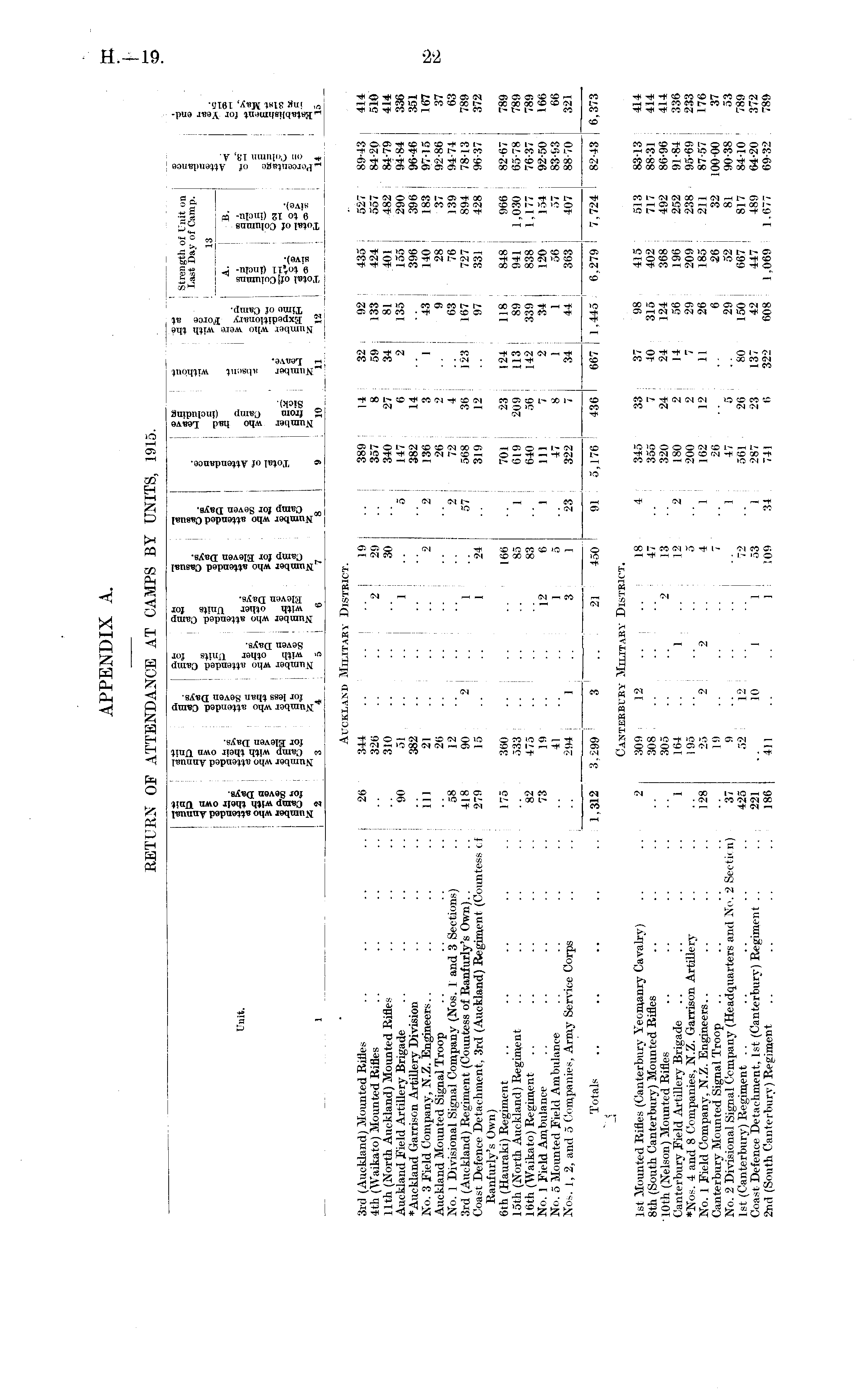 RETURN OF ATTENDANCE AT CAMPS BY UNITS, 1915. Unit. ■as as lis. Ill l|* l|3 ill ill 2 3 OH * as 11 J If e*a f«« fi fe asi is IE fe a i ft _ 3 sp, I - ' II II ■Clfl T3^ © _ ©"£ _£ 3 1! lit Id K r5 fc 4 5 6 "oS -OS ■Sis "S > f| f| 1! if r5 fc 7 8 s a p 00 tt HH pi ?- as-- as §^H r5 !a ; io il 3 3 Strength of Unit on A Last Day of Camp. £ A. B. o s os 9 oo a 3 -h-3° I O.H We* 12 1 H H * © © © - 14 | © © • C -H 15 . 1 I ill 2 ill il is! ' i*s gs 3 4_ 5 6 7 Al'CKLASIl MILITARY DISTRICT. 3rd (Auckland) Mounted Rifles 4th (Waikato) Mounted Rifles 11th (North Auckland) Mounted Rifles Auckland Field Artillery Brigade *Auckland Garrison Artillery Division No. 3 Field Company, N.Z. Engineers. . Auckland Mounted Signal Troop No. 1 Divisional Signal Company (Nos. 1 and 3 Sections) 3rd (Auckland) Regiment (Countess of Ranfurly's Own).. Coast Defence Detachment, 3rd (Auckland) Regiment (Countess of Ranfurly's Own) 6th (Hauraki) Regiment loth (North Auckland) Regiment 16th (Waikato) Regiment No. 1 Field Ambulance No. 5 Mounted Field Ambulance Nos. 1, 2, and 5 Companies, Army Service Corps 26 90 111 '58 418 279 175 82 73 344 .. .. .. 19 320 .. .. 2 29 310 30 51 .. .. 1 382 21 2 12 90 2 .. 1 : .. 15 .. .. 1 I 24 360 .. .. .. 166 533 .. .. .. 85 475 .. .. .. 83 19 .. 12 6 41 .. 1 5 294 j 1 .. 3 1 5 2 2 57 389 357 340 147 382 136 26 72 568 319 14 8 27 6 14 3 2 4 36 12 32 59 34 2 1 123 92 : 133 81 135 43 63 167 j 97 435 i 424 401 155 j 396 140 ! 28 76 727 331 : 527 557 482 290 396 183 37 139 894 428 89-43 84-20 84-79 94-84 96-46 9715 92-86 94-74 78-13 96-37 414 510 414 336 351 167 37 63 789 372 1 1 23 701 619 ( 640 111 47 322 23 209 56 7 8 7 124 113 142 2 34 118 89 339 34 44 848 941 838 120 : 56 363 966 1,030 1.177 154 57 407 82-67 65-78 76-37 92-50 83-93 88-70 789 789 789 166 66 321 Totals .. .. .. .. ..I 1.312 3,299 ' 3 .. 21 450 Canterbury Military District. 3,299 ' 3 .. 21 450 91 1— 5,176 ! 436 I 667 I I 1,445 6,279 7,724 82-43 | 6,373 Canterbury Military District. 4 .. 2 i i 345 355 320 180 200 162 26 47 561 287 741 33 : 7 I 24; 2 2 12 5 26 23 6 37 40 24 14 7 11 80 137 322 98 315 124 56 29 26 6 29 150 ! 42 608 415 513 402 717 368 492 196 j 252 209 ! 238 185 211 26 32 52 | 81 667 : 817 447 489 1.069 1.677 8313 88-31 86-96 91-84 95-69 87-57 10000 90-38 84-10 64-20 69-32 414 414 414 336 233 176 37 53 789 372 789 1st Mounted Rifles (Canterbury Yeomanry Cavalry) .. 8th (South Canterbury) Mounted Rifles 10th (Nelson) Mounted Rifles Canterbury Field Artillery Brigade *Nos. 4 and 8 Companies, N.Z. Garrison Artillery No. 1 Field Company, N.Z. Engineers.. .. .. Canterbury Mounted Signal Troop No. 2 Divisional Signal Company (Headquarters and No. 2 Secticn) 1st (Canterbury) Regiment .. .. .. .. Coast Defence Detachment, 1st (Canterbury) Regiment .. .. I 2nd (South Canterbury) Regiment .. .. .. .. I 2 1 128 37 425 221 186 Villi JL-Uill J.I J. h-'J. J.Jj J. JL ;1JV 1 i/lCJlVH. J • 309 1 12 .. 1 .. i 18 308 , .. .. .. 47 305 .. .. 2 ! 13 164 .. ] .. 12 195 .. .. .. 5 25 2 2 .. 4 19 .. .. .. 7 9 52 12 .. .. 72 10 1 1 53 411 .. .. 1 109 309 1 12 .. 1 .. i 18 308 , .. .. .. 47 305 .. .. 2 ! 13 164 .. ] .. 12 195 .. .. .. 5 25 2 2 .. 4 19 .. .. .. 7 9 52 12 .. .. 72 10 1 1 53 411 .. .. 1 109