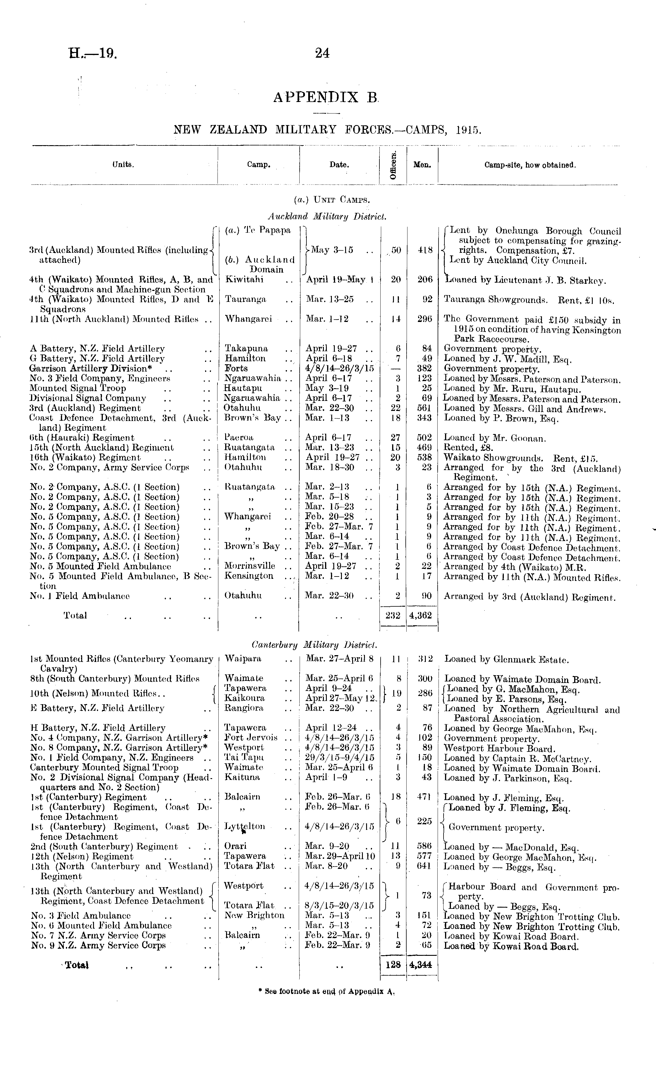 2 Units. Camp. Date. J Men. Camp-site, how obtained. O (a.) Unit Camps. Auckland Military District. {(a.) Te Papapa " f Lent by Onehunga Borough Oounoil subject to compensating for grazingyMay 3-15 .. .50 418 < rights. Compensation, £7. (6.) Auckland Lent by Auckland City Council. Domain J 4th (Waikato) Mounted Rifles, A, B, and Kiwitahi .. April 19-May I 20 206 Loaned by Lieutenant.I. B. Starkey. C Squadrons and Machine-gun Section 4 th (Waikato) Mounted Rifles, D and E Tauranga .. Mar. 13-25 .. II i)2 Tauranga Showgrounds. Rent, £1 I Or. Squadrons 11th (North Auckland) Mounted Rifles .. Whangarci .. Mar. 1-12 .. j 14 296 The Government paid £150 subsidy in 1915 on condition of having Kensington Park Racecourse. A Battery, N.Z. Field Artillery .. Takapuna .. April 19-27 .. 6 84 Government property. G Battery, N.Z. Field Artillery .. Hamilton .. April 6-18 ..7 49 Loaned by J. W. Madill, Esq. Garrison Artillery Division* .. .. Forts .. 4/8/14-26/3/15 — 382 Government property. No. 3 Field Company, Engineers .. Ngaruawahia .. April 6-17 .. 8 123 Loaned by Messrs. Paterson and Paterson. Mounted Signal Troop .. .. Hautapu .. May 3-19 .. I 25 Loaned by Mr. Ruru, Hautapu. Divisional Signal Company .. .. Ngaruawahia.. April 6-17 .. 2 69 Loaned by Messrs. Paterson and Paterson. 3rd (Auckland) Regiment .. .. Otahuhu . . Mar. 22-30 .. 22 561 Loaned by Messrs. Gill and Andrews. Coast Defence Detachment, 3rd (Auck- Brown's Bay.. Mar. 1-13 .. 18 343 Loaned by P. Brown, Esq. land) Regiment 6th (Hauraki) Regiment .. .. Paeroa .. April 6-17 .. 27 502 Loaned by Mr. Goonan. J 5th (North Auckland) Regiment .. Ruatangata .. Mar. 13-23 .. 15 469 Rented, £8. 16th (Waikato) Regiment .. .. ; Hamilton .. April 19-27 .. 20 538 Waikato Showgrounds. Rent, £15. No. 2 Company, Army Service Corps .. Otahuhu .. Mar. 18-30 .. ! 3 23 Arranged for by the 3rd (Auckland) Regiment. No. 2 Company, A.S.C. (1 Section) .. Ruatangata .. Mar. 2-13 .. i 1 6 Arranged for by 15th (N.A.) Regiment. No. 2 Company, A.S.C. (1 Section) .. „ .. Mar. 5-18 .. I 3 Arranged for by 15th (N.A.) Regiment. No. 2 Company, A.S.C. (1 Section) .. j „ .. Mar. 15-23 .. I 5 Arranged for by 15th (N.A.) Regiment. No. 5 Company, A.S.C. (I Section) .. Whangarei .. Fob. 20-28 .. I 9 Arranged for by 1.1 th (N.A.) Regiment. No. 5 Company, A.S.C. (1 Section) .. „ .. Fob. 27-Mar. 7 I 9 Arranged for by 11th (N.A.) Regiment. No. 5 Company, A.S.C. (I Section) .. „ .. Mar. 6-14 .. 1 9 Arranged for by 11th (N.A.) Regiment. No. 5 Company, A.S.C. (I Section) .. Brown's Bay .. Feb. 27-Mar. 7 I 6 Arranged by Coast Defence Detachment. No. 5 Company, A.S.C. (1 Section) .. „ .. Mar. 6-14 .. 1 6 Arranged by Coast Defence Detachment. No. 5 Mountod Field Ambulance .. Morrinsville .. April 19-27 .. 2 22 Arranged by 4th (Waikato) M.R. No. 5 Mounted Field Ambulance, B See- Kensington .. Mar. 1-12 .. I 17 Arranged by 11 th (N.A.) Mounted Rifles. tion No. I Field Ambulance .. .. Otahuhu .. Mar. 22-30 .. 2 90 Arranged by 3rd (Auckland) Regiment. ,50 20 II 14 6 7 :s I 2 22 18 27 15 20 3 I Total .. .. .. .. ... 232 4,362 Canterbury Military District. 1st Mounted Rifles (Canterbury Yeomanry Waipara .. Mar. 27-April 8 II 312 Loaned by Glenmark Estate. Cavalry) 8th (South Canterbury) Mounted Ri lies Waimate .. Mar. 25-April 6 8 300 Loaned by Waimate Domain Board 10th (Nelson) Mounted Rifles.. (Tapawera .. April 9-24 ) t Loaned by G. MacMahon, Esq. v ' ( Kaikoura .. Apnl27-May 12, f (Loaned by E. Parsons, Esq. E Battery, N.Z. Field Artillery .. Rangiora .. Mar. 22-30 . . 2 87 Loaned by Northern Agricultural and Pastoral Association. H Battery, N.Z. Field Artillery .. Tapawera .. April 12-24 .. 4 76 Loaned by George MaoMahon, Esq. No. 4 Company, N.Z. Garrison Artillery* Fort Jervois .. 14/8/14-26/3/15 4 102 Government property. No. 8 Company, N.Z. Garrison Artillery* Westport .. 4/8/14-26/3/15 3 89 I Westport Harbour Board. No. I Field Company, N.Z. Engineers .. Tai Tapu .. 29/3/15-9/4/15 5 150 Loaned by Captain R. McCartney. Canterbury Mounted Signal Troop .. Waimate .. Mar. 25-April 6 I 18 Loaned by Waimate Domain Board. No. 2 Divisional Signal Company (Head- Kaituna .. April 1-9 .. 3 43 j Loaned by J. Parkinson, Esq. quarters and No. 2 Section) 1 st (Canterbury) Regiment .. .. Balcaim .. Feb. 26-Mar. 6 18 471 Loaned by J. Fleming, Esq. I st (Canterbury) Regiment, ('oast De- j „ .. Feb. 26-Mar. 6 ~] f Loaned by J. Fleming, Esq. fence Detachment (_ ( . ,,5 J 1st (Canterbury) Regiment, Coast De- Lyttelton .. 4/8/14-26/3/15 f ] Government property. fence Detachment J [_ 2nd (South Canterbury) Regiment . .. Orari .. Mar. 9-20 .. II 586 Loaned by — MacDonald, Esq. 12th (Nelson) Regiment .. .. Tapawera .. 1 Mar. 29-April 10 13 577 Loaned, by George MacMahon, Esq. 13th (North Canterbury and Westland) Totara Flat .. Mar. 8-20 .. 9 641 Luaned by — Beggs, Esq. Regiment 13th (North Canterbury and Westland) f Westport .. 4/8/14-26/3/15 "1 | Harbour Board and Government proRegiment, Coast Defence Detachment *[ TotaraWat .. 8/3/15-20/3/15 j \Loaned by -Beggs, Esq. No. 8 Held Ambulance .. .. New Brighton Mar. 5-13 ... 3 151 Loaned by New Brighton Trotting Club. No. 6 Mounted Field Ambulance .. „ .. Mar. 5-13 .. 4 72 Loaned by New Brighton Trotting Club, No. 7 N.Z. Army Service Corps .. Balcairn .. Feb. 22-Mar. 9 I 20 ! Loaned by Kowai Road Board. No. 9 N.Z. Army Service Corps .. „' :. Feb. 22-Mar. 9 2 Ii5 Loaned by Kowai Road Board. 1 j 3 4 i 2 Total ,, ,. .. .. .. 128 4,344 128 _—1 * See footnote at end. oi Appeudis A, x A,