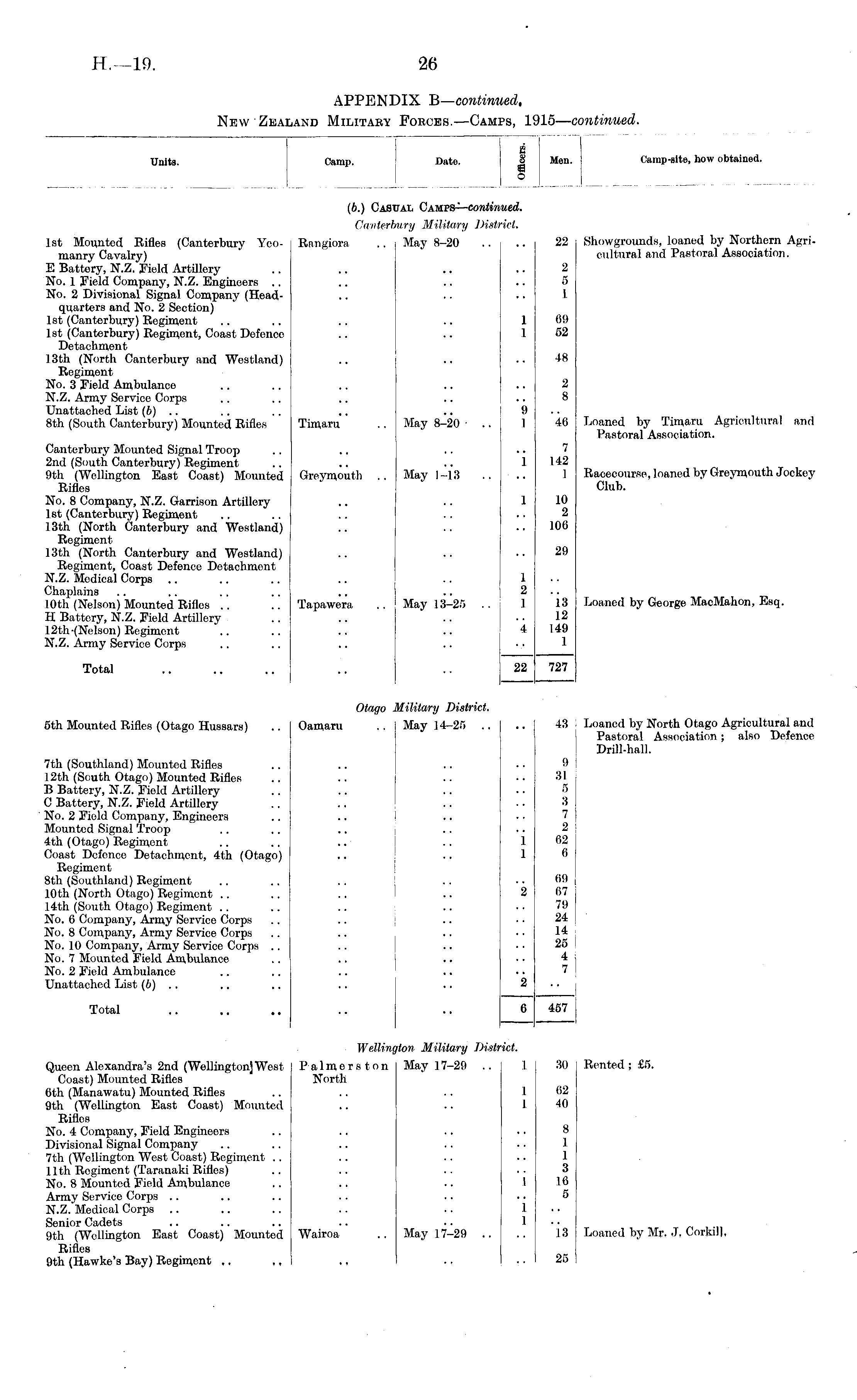 APPENDIX B—continued. New Zealand Military Forces. —Camps, 1915 — continued.