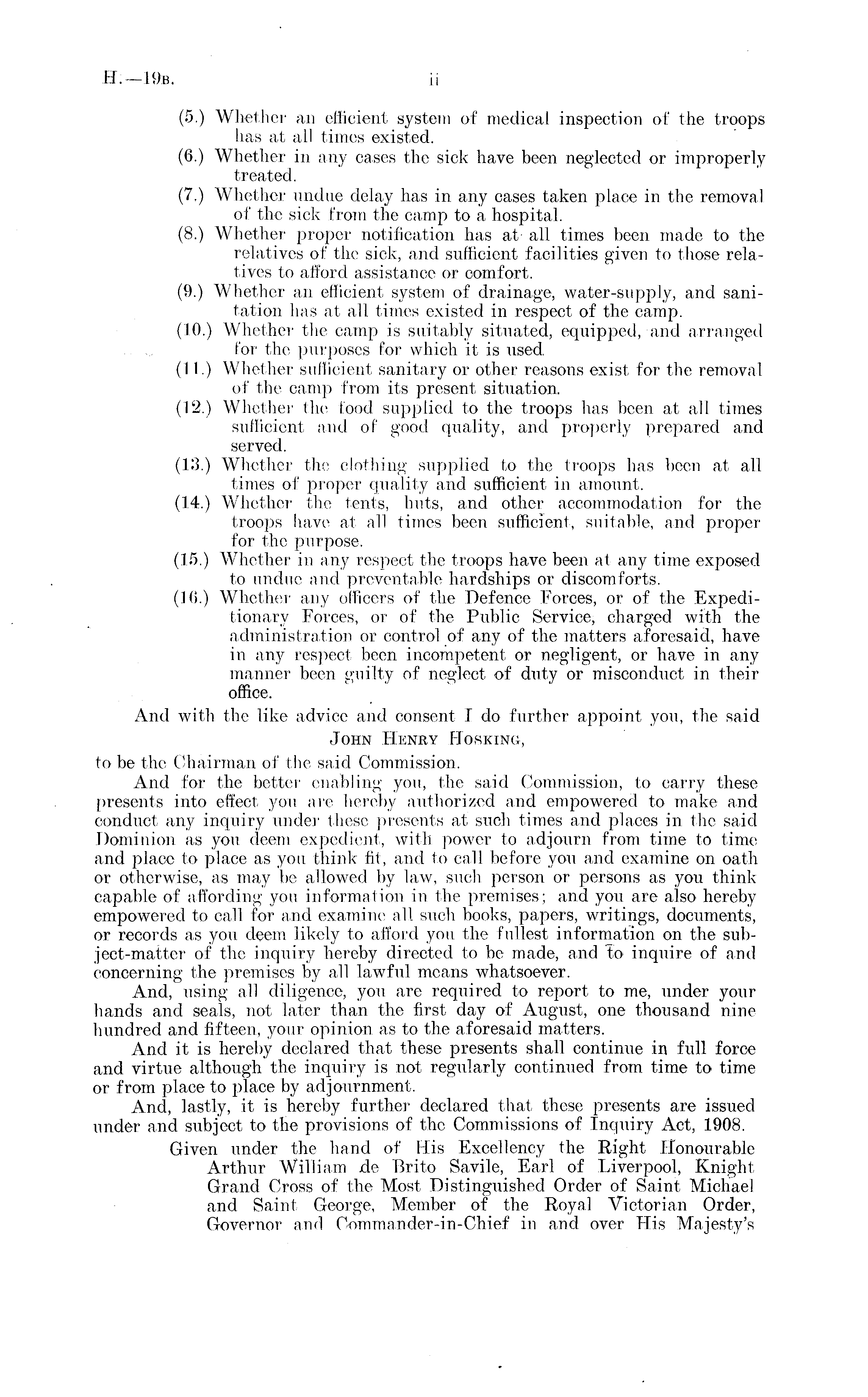 (5.) Whether an efficient system of medical inspection of the troops has at all times existed. (6.) Whether in any cases the sick have been neglected or improperly treated. (7.) Whether undue delay has in any cases taken place in the removal of the sick from the camp to a hospital. (8.) Whether proper notification has at- all times been made to the relatives of the sick, and sufficient facilities given to those relatives to afford assistance or comfort. (9.) Whether an efficient system of drainage, water-supply, and sanitation has at all times existed in respect of the camp. (10.) Whether the camp is suitably situated, equipped, and arranged >i ... for the purposes for which it is used (11.) Whether sufficient sanitary or other reasons exist for the removal of the camp from its present situation. (12.) Whether the food supplied to the troops has been at all times sufficient and of good quality, and properly prepared and served. (13.) Whether the clothing supplied to the troops has been at all times of proper quality and sufficient in amount. (14.) Whether the tents, huts, and other accommodation for the troops have at all times been sufficient, suitable, and proper for the purpose. (15.) Whether in any respect the troops have been at any time exposed to undue and preventable hardships or discomforts. (16.) Whether any officers of the Defence Forces, or of the Expeditionary Forces, or of the Public Service, charged with the administration or control of any of the matters aforesaid, have in any respect been incompetent or negligent, or have in any manner been guilty of neglect of duty or misconduct in their office. And with the like advice and consent I do further appoint you, the said John Henry Hosking, to be the Chairman of the said Commission. And for the better enabling you, the said Commission, to carry these presents into effect you are hereby authorized and empowered to make and conduct any inquiry under these presents at such times and places in the said Dominion as you deem expedient, with power to adjourn from time to time and place to place as you think fit, and to call before you and examine on oath or otherwise, as may be allowed by law, such person or persons as you think capable of affording you information in the premises; and you are also hereby empowered to call for and examine all such books, papers, writings, documents, or records as you deem likely to afford you the fullest information on the sub-ject-matter of the inquiry hereby directed to be made, and to inquire of and concerning the premises by all lawful means whatsoever. And, using all diligence, you are required to report to me, under your hands and seals, not later than the first day of August, one thousand nine hundred and fifteen, your opinion as to the aforesaid matters. And it is hereby declared that these presents shall continue in full force and virtue although the inquiry is not regularly continued from time to time or from place to place by adjournment. And, lastly, it is hereby further declared that these presents are issued under and subject to the provisions of the Commissions of Inquiry Act, 1908. Given under the hand of His Excellency the Right Honourable Arthur William de Brito Savile, Earl of Liverpool, Knight Grand Cross of the Most Distinguished Order of Saint Michael and Saint George, Member of the Royal Victorian Order, Governor and Commander-in-Chief in and over His Majesty's