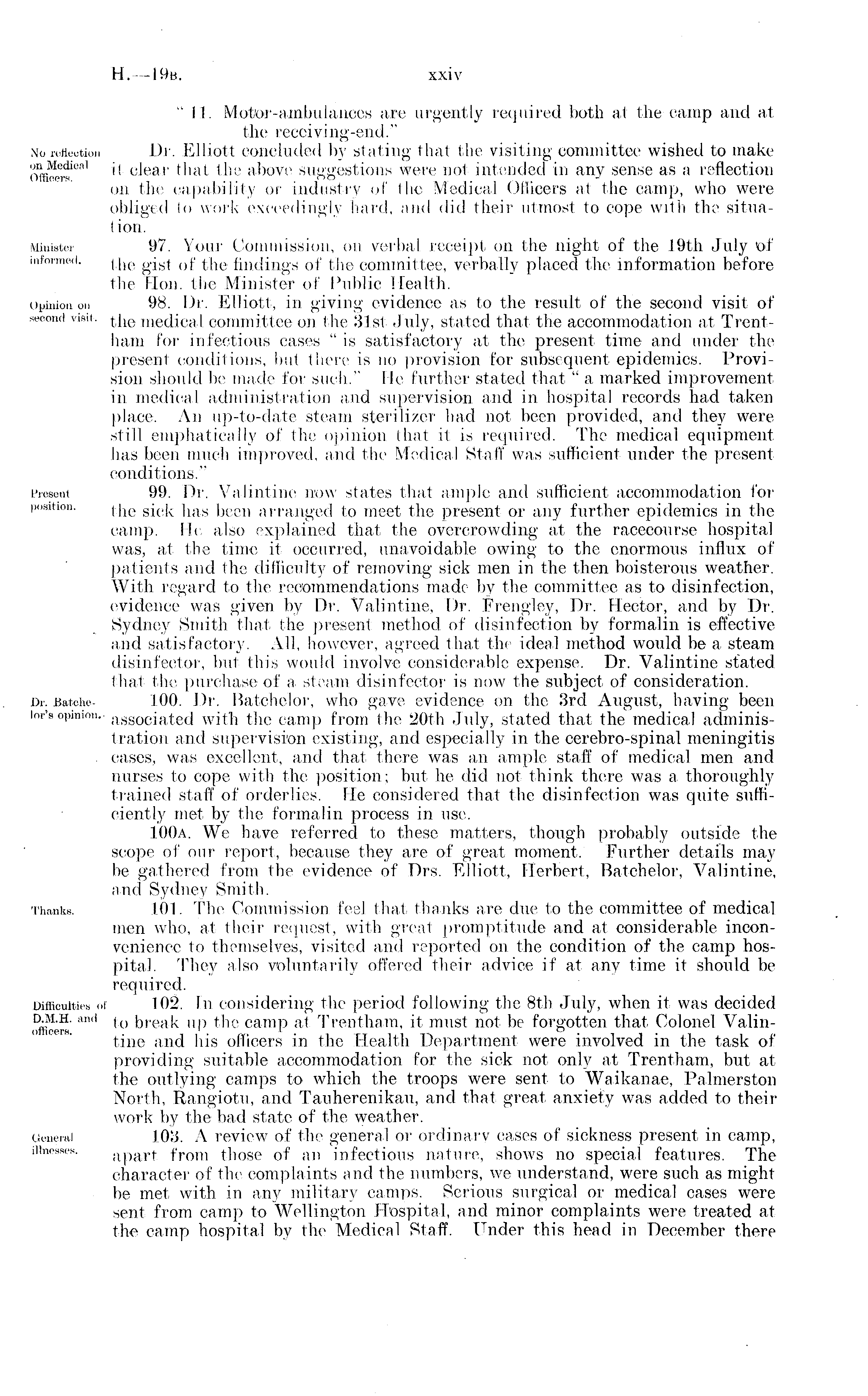 '11. Motor-ambulances are urgently required both at the camp and at the receiving-end." Dr. Elliott concluded by stating that the visiting committee wished to make it clear that the above suggestions were not intended in any sense as a reflection on the capability or industry of the Medical Officers ai the camp, who were obliged to work exceedingly hard, and did their utmost to cope with the situation. 97. Your Commission, on verbal receipt on the night of the 19th July of the gist of the findings of the committee, verbally placed the information before the Hon. the Minister of Public Health. 98. Dr. Elliott, in giving evidence as to the result of the second visit of the medical committee on the 31st July, stated that the accommodation at Trentham for infectious cases " is satisfactory at the present time and under the present conditions, but there is no provision for subsequent epidemics. Provision should be made for such." lie further stated that " a marked improvement in medical administration and supervision and in hospital records had taken place. An up-to-date steam sterilizer had not been provided, and they were still emphatically of the opinion that it is required. The medical equipment has been much improved, and the Medical Staff was sufficient under the present conditions." 99. Dr. Valintine now states that ample and sufficient accommodation for the sick has been arranged to meet the present or any further epidemics in the camp. He also explained that the overcrowding at the racecourse hospital was, at the time it occurred, unavoidable owing to the enormous influx of patients and the difficulty of removing sick men in the then boisterous weather. With regard to the recommendations made by the committee as to disinfection, evidence was given by Dr. Valintine, Dr. Frengley, Dr. Hector, and by Dr. Sydney Smith that the present method of disinfection by formalin is effective and satisfactory. All, however, agreed that the ideal method would be a steam disinfector, but this would involve considerable expense. Dr. Valintine stated that the purchase of a steam disinfector is now the subject of consideration. 100. Dr. Batchelor, who gave evidence on the 3rd August, having been associated with the camp from the 20th July, stated that the medical administration and supervision existing, and especially in the cerebro-spinal meningitis cases, was excellent, and that there was an ample staff of medical men and nurses to cope with the position; but he did not think there was a thoroughly trained staff of orderlies. He considered that the disinfection was quite sufficiently met by the formalin process in use. 100 a. We have referred to these matters, though probably outside the scope of our report, because they are of great moment. Further details may be gathered from the evidence of Drs. Elliott, Herbert, Batchelor, Valintine, and Sydney Smith. 101. The Commission feel that thanks are due to the committee of medical men who, at their request, with great promptitude and at considerable inconvenience to themselves, visited and reported on the condition of the camp hospital. They also voluntarily offered their advice if at any time it should be required. 102. In considering the period following the Bth July, when it was decided to break up the camp at Trentham, it must not be forgotten that Colonel Valintine and his officers in the Health Department were involved in the task of providing suitable accommodation for the sick not only at Trentham, but at the outlying camps to which the troops were sent to Waikanae, Palmerston North, Rangiotu, and Tauherenikau, and that great anxiety was added to their work by the bad state of the weather. 103. A review of the general or ordinary cases of sickness present in camp, apart from those of an infectious nature, shows no special features. The character of the complaints and the numbers, we understand, were such as might be met with in any military camps. Serious surgical or medical cases were sent from camp to Wellington Hospital, and minor complaints were treated at the camp hospital by the Medical Staff. Under this head in December there