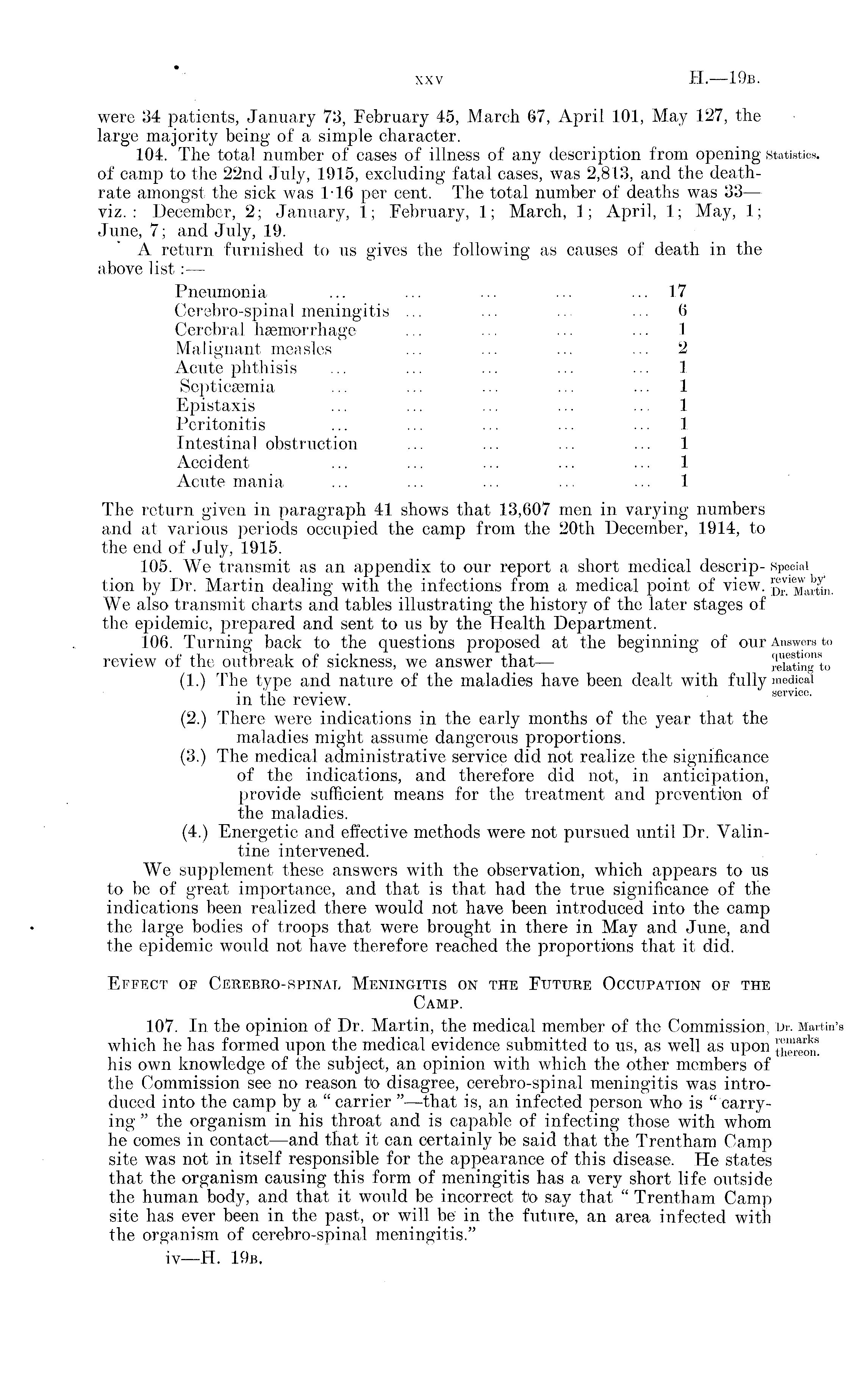 Pneumonia ... ... ... ... ... 17 Cerebro-spinal meningitis ... ... ... ... 6 Cerebral haemorrhage ... ... ... ... 1 Malignant measles ... ... ... ... 2 Acute phthisis ... ... ... ... ... 1 Septicaemia ... ... ... ... ... 1 Epistaxis ... ... ... ... ... 1 Peritonitis ... ... ... ... ... 1 Intestinal obstruction ... ... ... ... 1 Accident ... ... ... ... ... 1 Acute mania ... ... ... ... ... 1 The return given in paragraph 41 shows that 13,607 men in varying numbers and at various periods occupied the camp from the 20th December, 1914, to the end of July, 1915. 105. We transmit as an appendix to our report a short medical description by Dr. Martin dealing with the infections from a medical point of view. We also transmit charts and tables illustrating the history of the later stages of the epidemic, prepared and sent to us by the Health Department. 106. Turning back to the questions proposed at the beginning of our review of the outbreak of sickness, we answer that— (1.) The type and nature of the maladies have been dealt with fully in the review. (2.) There were indications in the early months of the year that the maladies might assume dangerous proportions. (3.) The medical administrative service did not realize the significance of the indications, and therefore did not, in anticipation, provide sufficient means for the treatment and prevention of the maladies. (4.) Energetic and effective methods were not pursued until Dr. Valintine intervened. We supplement these answers with the observation, which appears to us to be of great importance, and that is that had the true significance of the indications been realized there would not have been introduced into the camp the large bodies of troops that were brought in there in May and June, and the epidemic would not have therefore reached the proportions that it did.