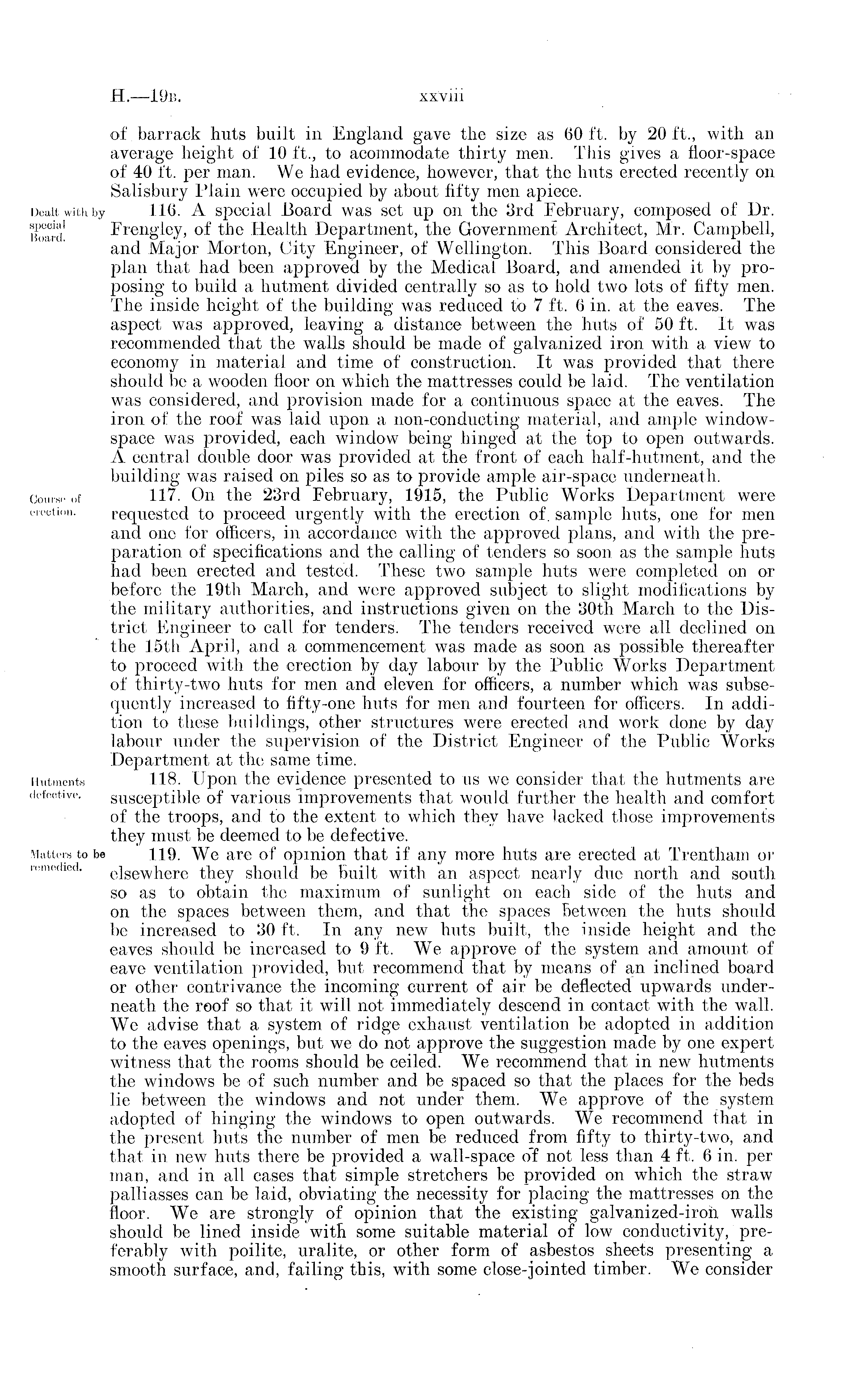 of barrack huts built in England gave the size as 60 ft. by 20 ft., with an average height of 10 ft., to acommodate thirty men. This gives a floor-space of 40 ft. per man. We had evidence, however, that the huts erected recently on Salisbury Plain were occupied by about fifty men apiece. 116. A special Board was set up on the 3rd February, composed of Dr. Frengley, of the Flealth Department, the Government Architect, Mr. Campbell, and Major Morton, City Engineer, of Wellington. This Board considered the plan that had been approved by the Medical Board, and amended it by proposing to build a hutment divided centrally so as to hold two lots of fifty men. The inside height of the building was reduced to 7 ft. 6 in. at the eaves. The aspect was approved, leaving a distance between the huts of 50 ft. It was recommended that the walls should be made of galvanized iron with a view to economy in material and time of construction. It was provided that there should be a wooden floor on which the mattresses could be laid. The ventilation was considered, and provision made for a continuous space at the eaves. The iron of the roof was laid upon a non-conducting material, and ample windowspace was provided, each window being hinged at the top to open outwards. A central double door was provided at the front of each half-hutment, and the building was raised on piles so as to provide ample air-space underneath. 117. On the 23rd February, 1915, the Public Works Department were requested to proceed urgently with the erection of. sample huts, one for men and one for officers, in accordance Avith the approved plans, and with the preparation of specifications and the calling of tenders so soon as the sample huts had been erected and tested. These two sample huts were completed on or before the 19th March, and were approved subject to slight modifications by the military authorities, and instructions given on the 30th March to the District Engineer to call for tenders. The tenders received were all declined on the 15th April, and a commencement was made as soon as possible thereafter to proceed with the erection by day labour by the Public Works Department of thirty-two huts for men and eleven for officers, a number which was subsequently increased to fifty-one huts for men and fourteen for officers. In addition to these buildings, other structures were erected and work done by day labour under the supervision of the District Engineer of the Public Works Department at the same time. 118. Upon the evidence presented to us we consider that the hutments are susceptible of various improvements that would further the health and comfort of the troops, and to the extent to which they have lacked those improvements they must be deemed to be defective. 119. We are of opinion that if any more huts are erected at Trentham or elsewhere they should be built with an aspect nearly due north and south so as to obtain the maximum of sunlight on each side of the huts and on the spaces between them, and that the spaces Between the huts should be increased to 30 ft. In any new huts built, the inside height and the eaves should be increased to 9 ft. W T e approve of the system and amount of cave ventilation provided, but recommend that by means of an inclined board or other contrivance the incoming current of air be deflected upwards underneath the roof so that it will not immediately descend in contact with the wall. We advise that a system of ridge exhaust ventilation be adopted in addition to the eaves openings, but we do not approve the suggestion made by one expert witness that the rooms should be ceiled. We recommend that in new hutments the windows be of such number and be spaced so that the places for the beds lie between the windows and not under them. We approve of the system adopted of hinging the windows to open outwards. We recommend that in the present huts the number of men be reduced from fifty to thirty-two, and that in new huts there be provided a wall-space of not less than 4 ft. 6 in. per man, and in all cases that simple stretchers be provided on which the straw palliasses can be laid, obviating the necessity for placing the mattresses on the floor. We are strongly of opinion that the existing galvanized-iron walls should be lined inside with some suitable material of low conductivity, preferably with poilite, uralite, or other form of asbestos sheets presenting a smooth surface, and, failing this, with some close-jointed timber. We consider