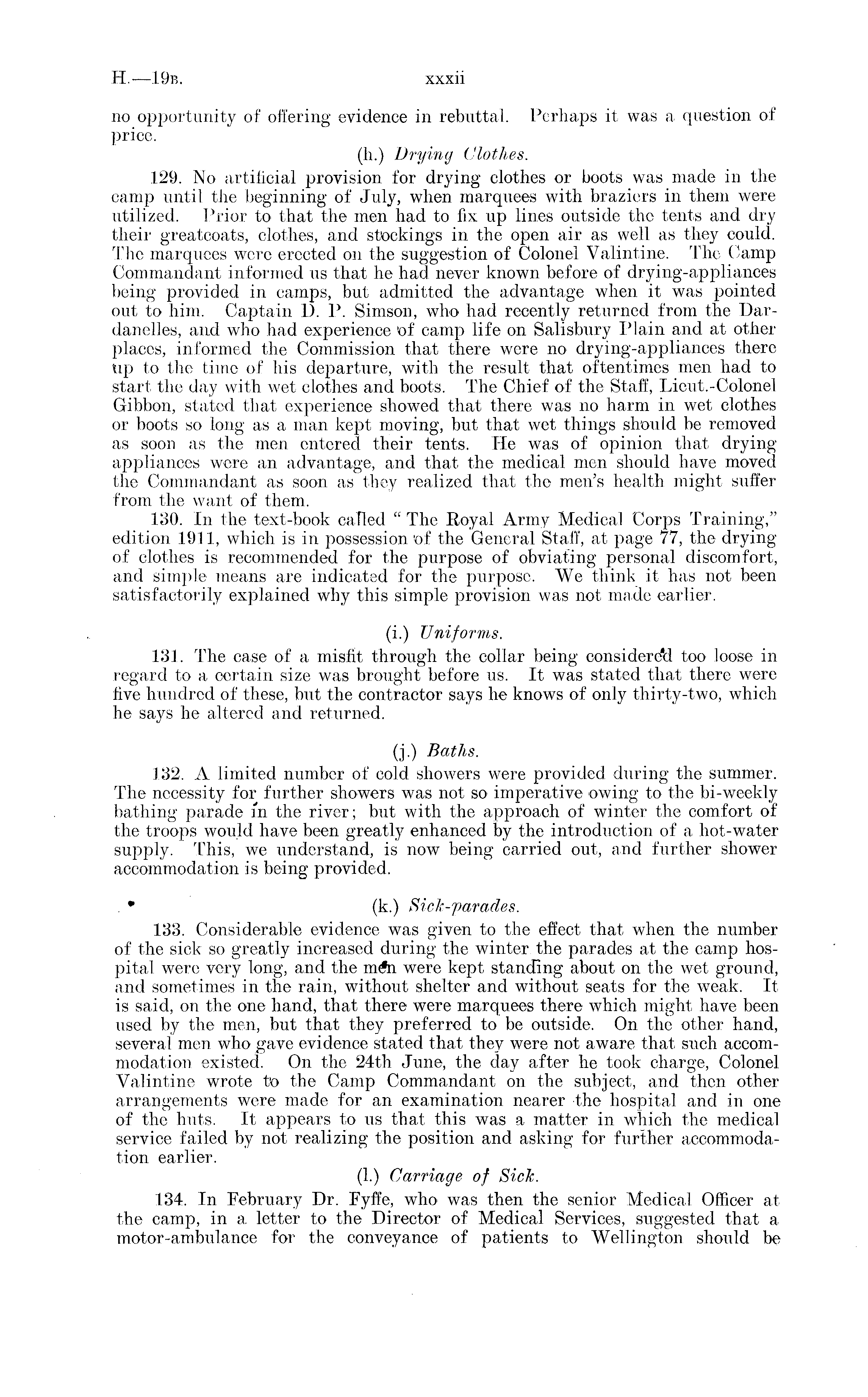 no opportunity of offering evidence in rebuttal. Perhaps it was a question of price. (h.) Drying Clothes. 129. No artificial provision for drying clothes or boots was made in the camp until the beginning of July, when marquees with braziers in them were utilized. Prior to that the men had to fix up lines outside the tents and dry their greatcoats, clothes, and stockings in the open air as well as they could. The marquees were erected on the suggestion of Colonel Valintine. The Camp Commandant informed us that he had never known before of drying-appliances being provided in camps, but admitted the advantage when it was pointed out to him. Captain D. P. Simson, who had recently returned from the Dardanelles, and who had experience of camp life on Salisbury Plain and at other places, informed the Commission that there were no drying-appliances there tip to the time of his departure, with the result that oftentimes men had to start the day with wet clothes and boots. The Chief of the Staff, Lieut.-Colonel Gibbon, stated that experience showed that there was no harm in wet clothes or boots so long as a man kept moving, but that wet things should be removed as soon as the men entered their tents. He was of opinion that drying appliances were an advantage, and that the medical men should have moved the Commandant as soon as they realized that the men's health might suffer from the want of them. 130. In the text-book called " The Royal Army Medical Corps Training," edition 1911, which is in possession of the General Staff, at page 77, the drying of clothes is recommended for the purpose of obviating personal discomfort, and simple means are indicated for the purpose. We think it has not been satisfactorily explained why this simple provision was not made earlier. (i.) Uniforms. 131. The case of a misfit through the collar being considere*d too loose in regard to a certain size was brought before us. It was stated that there were five hundred of these, but the contractor says he knows of only thirty-two, which he says he altered and returned. (j.) Baths. 132. A limited number of cold showers were provided during the summer. The necessity for further showers was not so imperative owing to the bi-weekly bathing parade in the river; but with the approach of winter the comfort of the troops would have been greatly enhanced by the introduction of a hot-water supply. This, we understand, is now being carried out, and further shower accommodation is being provided. . • (k.) Sick-parades. 133. Considerable evidence was given to the effect that when the number of the sick so greatly increased during the winter the parades at the camp hospital were very long, and the mfti were kept standing about on the wet ground, and sometimes in the rain, without shelter and without seats for the weak. It is said, on the one hand, that there were marquees there which might have been used by the men, but that they preferred to be outside. On the other hand, several men who gave evidence stated that they were not aware that such accommodation existed. On the 24th June, the day after he took charge, Colonel Valintine wrote to the Camp Commandant on the subject, and then other arrangements were made for an examination nearer the hospital and in one of the huts. It appears to us that, this was a matter in which the medical service failed by not realizing the position and asking for further accommodation earlier. (1.) Carriage of Sick. 134. In February Dr. Fyffe, who was then the senior Medical Officer at the camp, in a letter to the Director of Medical Services, suggested that a motor-ambulance for the conveyance of patients to Wellington should be