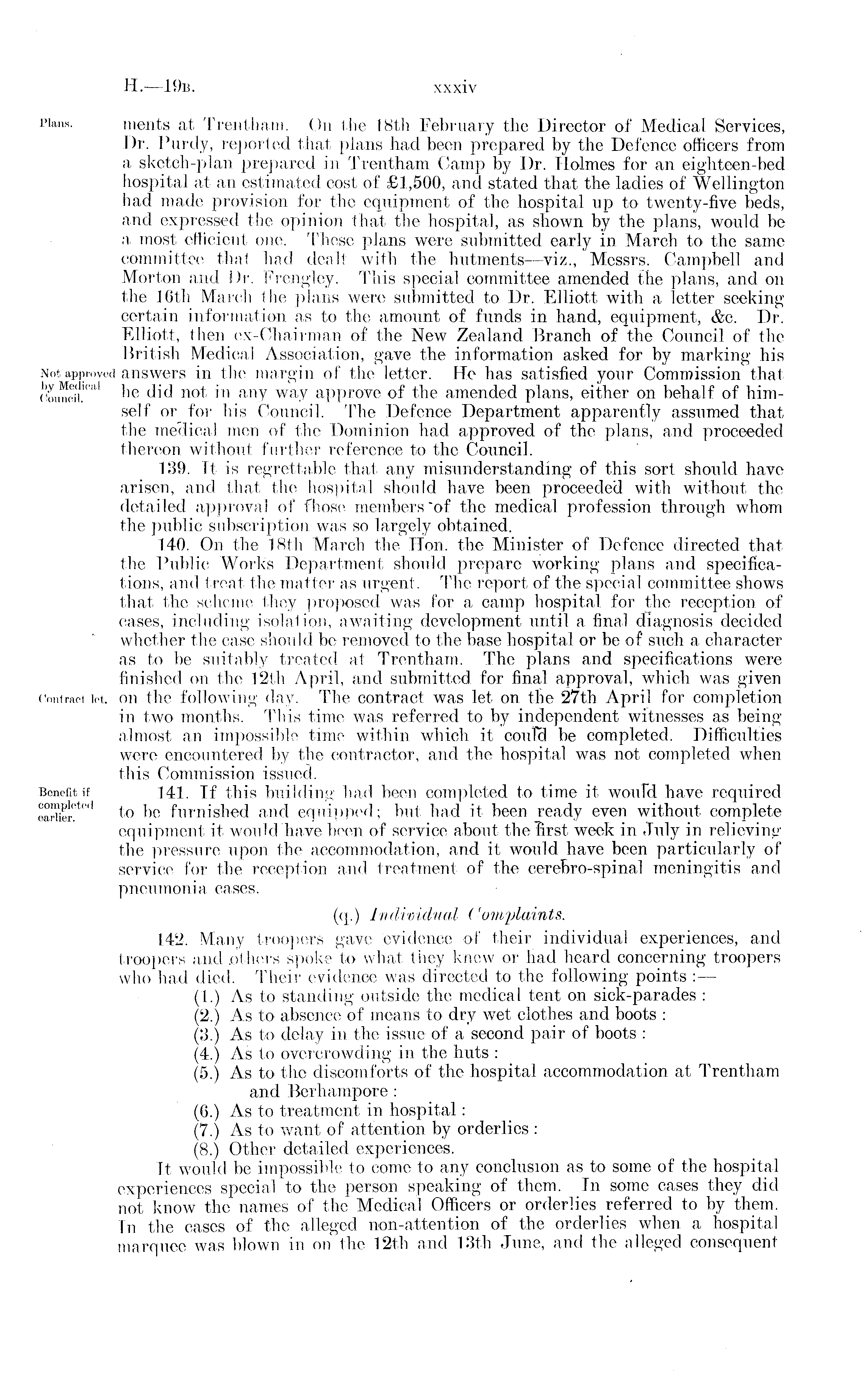 ments at Trentham. On the 18th February the Director of Medical Services, Dr. Purely, reported that plans had been prepared by the Defence officers from a sketch-plan prepared in Trentham Camp by Dr. Holmes for an eighteen-bed hospital at an estimated cost of £1,500, and stated that the ladies of Wellington had made provision for the equipment of the hospital up to twenty-five beds, and expressed the opinion that the hospital, as shown by the plans, would be a most efficient one. These plans were submitted early in March to the same committee that had dealt with the hutments —viz., Messrs. Campbell and Morton and Dr. Frengley. This special committee amended the plans, and on the 16th March the plans were submitted to Dr. Elliott with a letter seeking certain information as to the amount of funds in hand, equipment, &c. Dr. Elliott, then ex-Chairman of the New Zealand Branch of the Council of the British Medical Association, gave the information asked for by marking his answers in the margin of the letter. He has satisfied your Commission that he did not in any way approve of the amended plans, either on behalf of himself or for his Council. The Defence Department apparently assumed that the medical men of the Dominion had approved of the plans, and proceeded thereon without further reference to the Council. 139. It is regrettable that any misunderstanding of this sort should have arisen, and that the hospital should have been proceeded with without the detailed approval of those members "of the medical profession through whom the public subscription was so largely obtained. 140. On the 18th March the Hon. the Minister of Defence directed that the Public Works Department should prepare working plans and specifications, and treat the matter as urgent. The report of the special committee shows that the scheme they proposed was for a camp hospital for the reception of cases, including isolation, awaiting development until a final diagnosis decided whether the case should be removed to the base hospital or be of such a character as to be suitably treated at Trentham. The plans and specifications were finished on the 12th April, and submitted for final approval, which was given on the following day. The contract was let on the 27th April for completion in two months. This time was referred to by independent witnesses as being almost an impossible time within which it coulcl be completed. Difficulties were encountered by the contractor, and the hospital was not completed when this Commission issued. 141. If this building had been completed to time it would have required to be furnished and equipped; but had it been ready even without complete equipment it would have been of service about the first week in July in relieving the pressure upon the accommodation, and it would have been particularly of service for the reception and treatment of the cerebro-spinal meningitis and pneumonia cases. (q.) Individual Complaints. 142. Many troopers gave evidence of their individual experiences, and troopers and .others spoke to what they knew or had heard concerning troopers who had died. Their evidence was directed to the following points : — (1.) As to standing outside the medical tent on sick-parades : (2.) As to absence of means to dry wet clothes and boots : (3.) As to delay in the issue of a second pair of boots : (4.) As to overcrowding in the huts : (5.) As to the discomforts of the hospital accommodation at Trentham and Berhampore: (6.) As to treatment in hospital: (7.) As to want of attention by orderlies : (8.) Other detailed experiences. It would be impossible to come to any conclusion as to some of the hospital experiences special to the person speaking of them. In some cases they did not know the names of the Medical Officers or orderlies referred to by them. In the cases of the alleged non-attention of the orderlies when a hospital marquee was blown in on the 12th and 13th June, and the alleged consequent