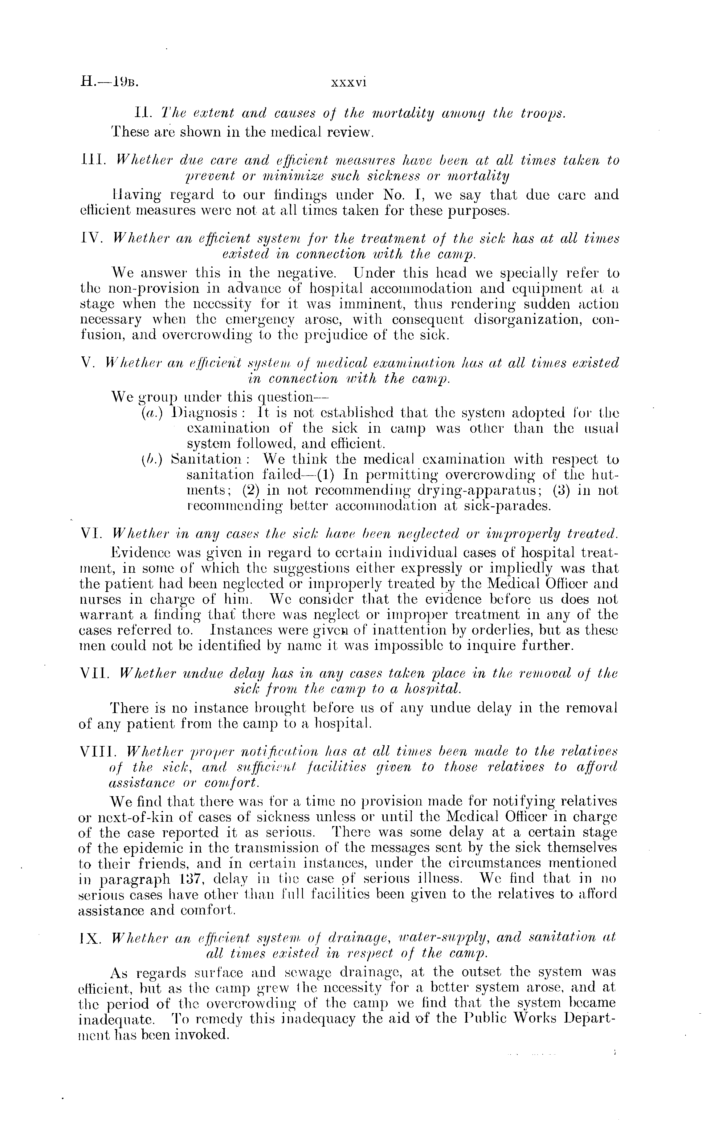 11. The extent and causes of the mortality among the troops. These are shown in the medical review. 111. Whether due care and efficient measures have been at all times taken to prevent or minimize such sickness or mortality Having regard to our findings under No. I, we say that due care and efficient measures were not at all times taken for these purposes. IV. Whether an efficient system for the treatment of the sick has at all times existed in connection with the camp. We answer this in the negative. Under this head we specially refer to the non-provision in advance of hospital accommodation and equipment at a stage when the necessity for it was imminent, thus rendering sudden action necessary when the emergency arose, with consequent disorganization, confusion, and overcrowding to the prejudice of the sick. V. Whether an efficient system of medical examination has at all times existed in connection with the camp. We group under this question— (a.) Diagnosis : It is not established that the system adopted for the examination of the sick in camp was other than the usual system followed, and efficient. (b.) Sanitation : We think the medical examination with respect to sanitation failed—(l) In permitting overcrowding of the hutments; (2) in not recommending drying-apparatus; (3) in not recommending better accommodation at sick-parades. VI. Whether in any cases the sick have been neglected or improperly treated. Evidence was given in regard to certain individual cases of hospital treatment, in some of which the suggestions either expressly or impliedly was that the patient had been neglected or improperly treated by the Medical Officer and nurses in charge of him. We consider that the evidence before us does not warrant a finding that there was neglect or improper treatment in any of the cases referred to. Instances were given of inattention by orderlies, but as these men could not be identified by name it was impossible to inquire further. VII. Whether undue delay has in any cases taken place in the removal of the sick from the camp to a hospital. There is no instance brought before us of any undue delay in the removal of any patient from the camp to a hospital. VIII. Whether proper notification has at all times been made to the relatives of the sick, and sufficient facilities given to those relatives to afford assistance or comfort. We find that there was for a time no provision made for notifying relatives or next-of-kin of cases of sickness unless or until the Medical Officer in charge of the case reported it as serious. There was some delay at a certain stage of the epidemic in the transmission of the messages sent by the sick themselves to their friends, and in certain instances, under the circumstances mentioned in paragraph 137, delay in the case of serious illness. We find that in no serious cases have other than full facilities been given to the relatives to afford assistance and comfort. IX. Whether an efficient system of drainage, water-supply, and sanitation at all times existed in respect of the camp. As regards surface and sewage drainage, at the outset the system was efficient, but as the camp grew the necessity for a better system arose, and at the period of the overcrowding of the camp we find that the system became inadequate. To remedy this inadequacy the aid of the Public Works Department has been invoked.
