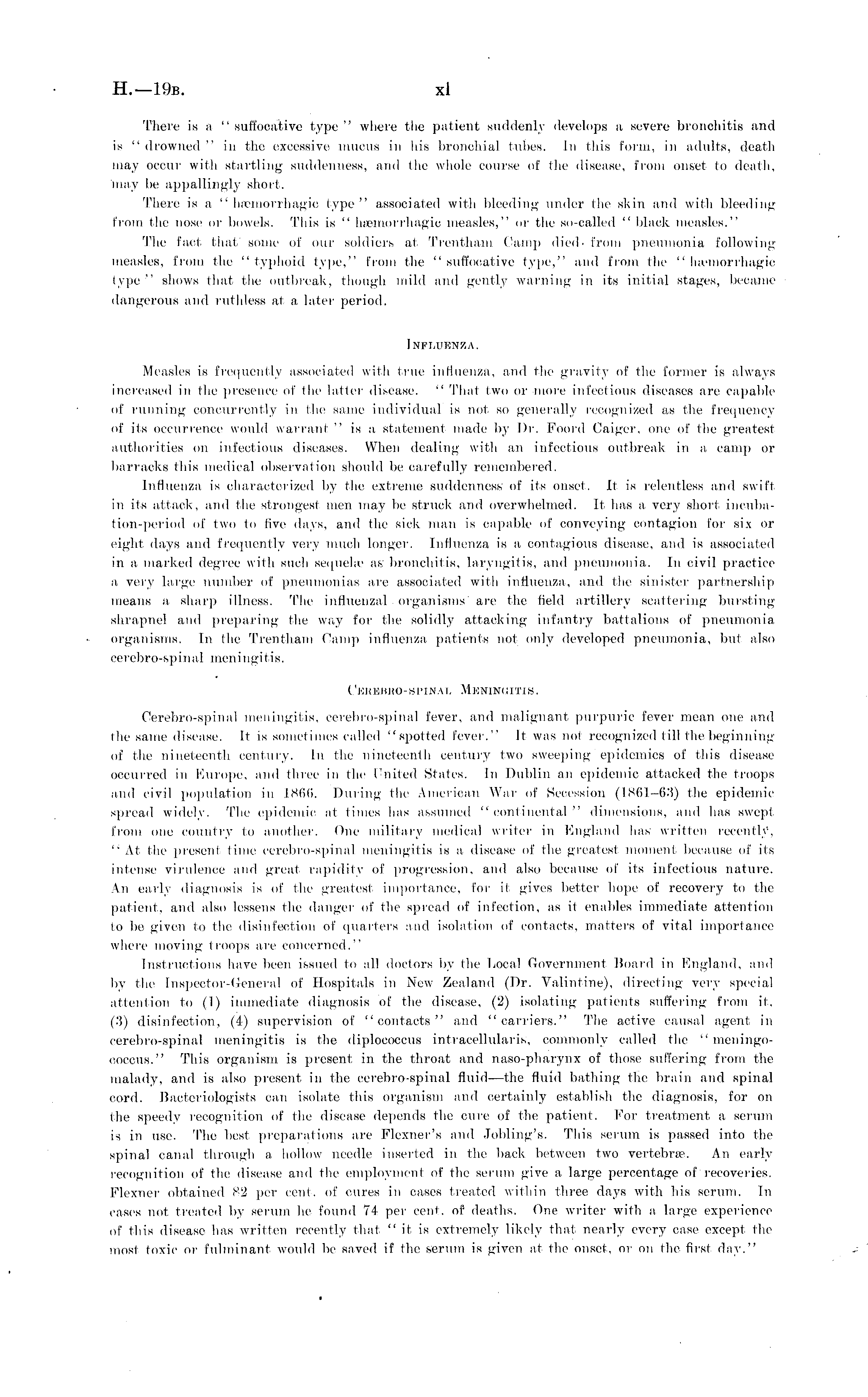 There is a " suffocative type " where the patient suddenly develops a severe bronchitis and is " drowned " in the excessive mucus in his bronchial tubes. In this form, in adults, death may occur with startling suddenness, and the whole course of the disease, from onset" to death, may be appallingly short. There is a " hemorrhagic type" associated with bleeding under the skin and with bleeding from the nose or bowels. This is " hemorrhagic measles," or the so-called " black measles." The fact that some of our soldiers at Trentham Camp died, from pneumonia following measles, from the "typhoid type," from (he "suffocative type," and from the " hemorrhagic type" shows that the outbreak, though mild and gently warning in its initial stages, became dangerous and ruthless at a later period. Influenza. Measles is frequently associated with true influenza, and the gravity of the former is always increased in the presence of the latter disease. " That two or more infectious diseases are capable of running concurrently in the same individual is not so generally recognized as the frequency of its occurrence would warrant " is a statement made by Dr. Foord Caiger, one of the greatest authorities on infectious diseases. When dealing with an infectious outbreak in a camp or barracks this medical observation should be carefully remembered. Influenza is characterized by the extreme suddenness of its onset. It is relentless and swift in its attack, and the strongest men may Vie struck and overwhelmed. It has a very short incuba-tion-period of two to live days, and the sick man is capable of conveying contagion for six or eight days and frequently very much longer. Influenza is a contagious disease, and is associated in a marked degree with such sequelae as; bronchitis, laryngitis, and pneumonia. In civil practice a very large number of pneumonias are associated with influenza, and the sinister partnership means a sharp illness. The influenzal organisms are the field artillery scattering bursting shrapnel and preparing the way for the solidly attacking infantry battalions of pneumonia organisms. In the Trentham Cam]) influenza patients not only developed pneumonia, but also cerebro-spinal meningitis. Cbebbro-spinal Meningitis. Cerebro-spinal meningitis, cerebro-spinal fever, and malignant purpuric fever mean one and the same disease. It is sometimes called "spotted fever." It was not recognized till the beginning of the nineteenth century. In the nineteenth century two sweeping epidemics of this disease occurred in Europe, and three in the United States. In Dublin an epidemic attacked the troops and civil population in L 866. During the American War of Secession (1861—63) the epidemic spread widely. The epidemic at limes has assumed "continental" dimensions, and has swepl from one country to another. One military medical writer in England has written recently, "At the present lime cerebro-spinal meningitis is a disease of the greatest moment because of its intense virulence and great rapidity of progression, and also because of its infectious nature. An early diagnosis is of the greatest importance, for it gives better hope of recovery to the patient, and also lessens the danger of the spread of infection, as it enables immediate attention to be given to the disinfection of quarters and isolation of contacts, matters of vital importance where moving troops are concerned." Instructions have been issued to all doctors by the Local Government Board in England, and by the Inspector-General of Hospitals in New Zealand (Dr. Valintine), directing very special attention to (1) immediate diagnosis of the disease, (2) isolating patients suffering from it. (3) disinfection, (4) supervision of "contacts" and "carriers." The active causal agent in cerebro-spinal meningitis is the diplococcus intracellularis, commonly called the "meningococcus." This organism is present in the throat and naso-pharynx of those suffering from the malady, and is also present in the cerebro-spinal fluid—the fluid bathing the brain and spinal cord. Bacteriologists can isolate this organism and certainly establish the diagnosis, for on the speedy recognition of the disease depends the cure of the patient. For treatment a serum is in use. The best preparations are Flexner's and .Tobling's. This serum is passed into the spinal canal through a hollow needle inserted in the back between two vertebra?. An early recognition of the disease and the employment of the serum give a large percentage of'recoveries. Flexner obtained 82 per cent, of cures in cases treated within three days with his serum. In cases not, treated by serum he found 74 per cent, of deaths. One writer with a large experience of this disease has written recently that " it is extremely likely that nearly every case except the most toxic or fulminant would be saved if the serum is given at the onset, or on the first day."