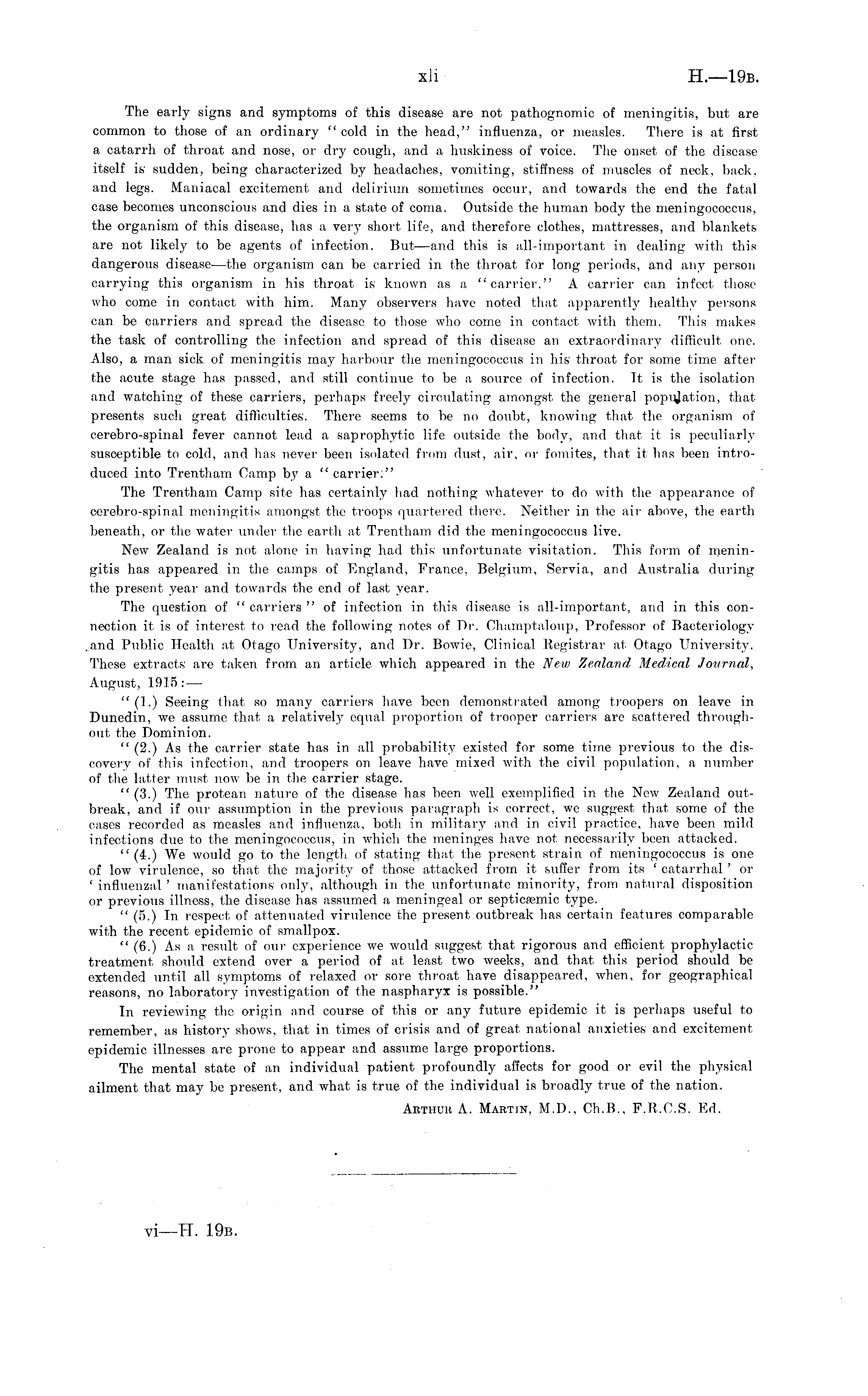 The early signs and symptoms of this disease are not pathognomic of meningitis, but are common to those of an ordinary " cold in the head," influenza, or measles. There is at first a catarrh of throat and nose, or dry cough, and a huskiness of voice. The onset of the disease itself is sudden, being characterized by headaches, vomiting, stiffness of muscles of neck, back, and legs. Maniacal excitement and delirium sometimes occur, and towards the end the fatal case becomes unconscious and dies in a state of coma. Outside the human body the meningococcus, the organism of this disease, has a very short life, and therefore clothes, mattresses, and blankets are not likely to be agents of infection. But—and this is all-important in dealing with this dangerous disease—the organism can be carried in the throat for long periods, and any person carrying this organism in his throat is known as a "carrier." A carrier can infect those who come in contact with him. Many' observers have noted that apparently healthy persons can be carriers and spread the disease to those who come in contact with them. This makes the task of controlling the infection and spread of this disease an extraordinary difficult one. Also, a man sick of meningitis may harbour the meningococcus in his throat for some time after the acute stage has passed, and still continue to be a source of infection. It is the isolation and watching of these carriers, perhaps freely circulating amongst the general population, that presents such great difliculties. There seems to be no doubt, knowing that the organism of cerebro-spinal fever cannot lead a saprophytic life outside the body, and that it is peculiarly susceptible to cold, and has never been isolated from dust, air, or fomites, that it has been introduced into Trentham Camp by a "carrier:" The Trentham Camp site has certainly had nothing whatever to do with the appearance of cerebro-spinal meningitis amongst the troops quartered there. Neither in the air above, the earth beneath, or the water under tho earth at Trentham, did the meningococcus live. New Zealand is not alone in having had this unfortunate visitation. This form of meningitis has appeared in the camps of England, France, Belgium, Servia, and Australia during the present year and towards the end of last year. The question of " carriers " of infection in this disease is all-important, and in this connection it is of interest to read the following notes of Dr. Champtaloup, Professor of Bacteriology ..and Public Health at Otago University, and Dr. Bowie, Clinical Registrar at Otago University. These extracts are taken from an article, which appeared in the New Zealand Medical Journal, August, 1915 : — "(1.) Seeing that so many carriers have been demonstrated among troopers on leave in Dunedin, we assume that a relatively equal proportion of trooper carriers are scattered throughout the Dominion. " (2.) As the carrier state has in all probability existed for some time previous to the discovery of this infection, and troopers on leave have mixed with the civil population, a number of the latter must now be in the carrier stage. " (3.) The protean nature of the disease has been well exemplified in the New Zealand outbreak, and if our assumption in the previous paragraph is correct, we suggest that some of the cases recorded as measles and influenza, both in military and in civil practice, have been mild infections due to the meningococcus, in which the meninges have not necessarily been attacked. " (4.) We would go to the length of stating that the present strain of meningococcus is one of low virulence, so that the majority of those attacked from it suffer from its ' catarrhal ' or ' influenzal ' manifestations only, although in the unfortunate minority, from natural disposition or previous illness, the disease has assumed a meningeal or type. " (5.) In respect of attenuated virulence the present outbreak has certain features comparable with the recent epidemic of smallpox. " (6.) As a result of our experience we would suggest that rigorous and efficient prophylactic treatment should extend over a period of at least two weeks, and that this period should be extended until all symptoms of relaxed or sore throat have disappeared, when, for geographical reasons, no laboratory investigation of the naspharyx is possible." In reviewing the origin and course of this or any future epidemic it is perhaps useful to remember, as history shows, that in times of crisis and of great national anxieties and excitement epidemic illnesses are prone to appear and assume large proportions. The mental state of an individual patient profoundly affects for good or evil the physical ailment that may be present, and what is true of the individual is broadly true of the nation. Arthum, A. Martin, M.D., Ch.B., F.R.C.S. Ed.