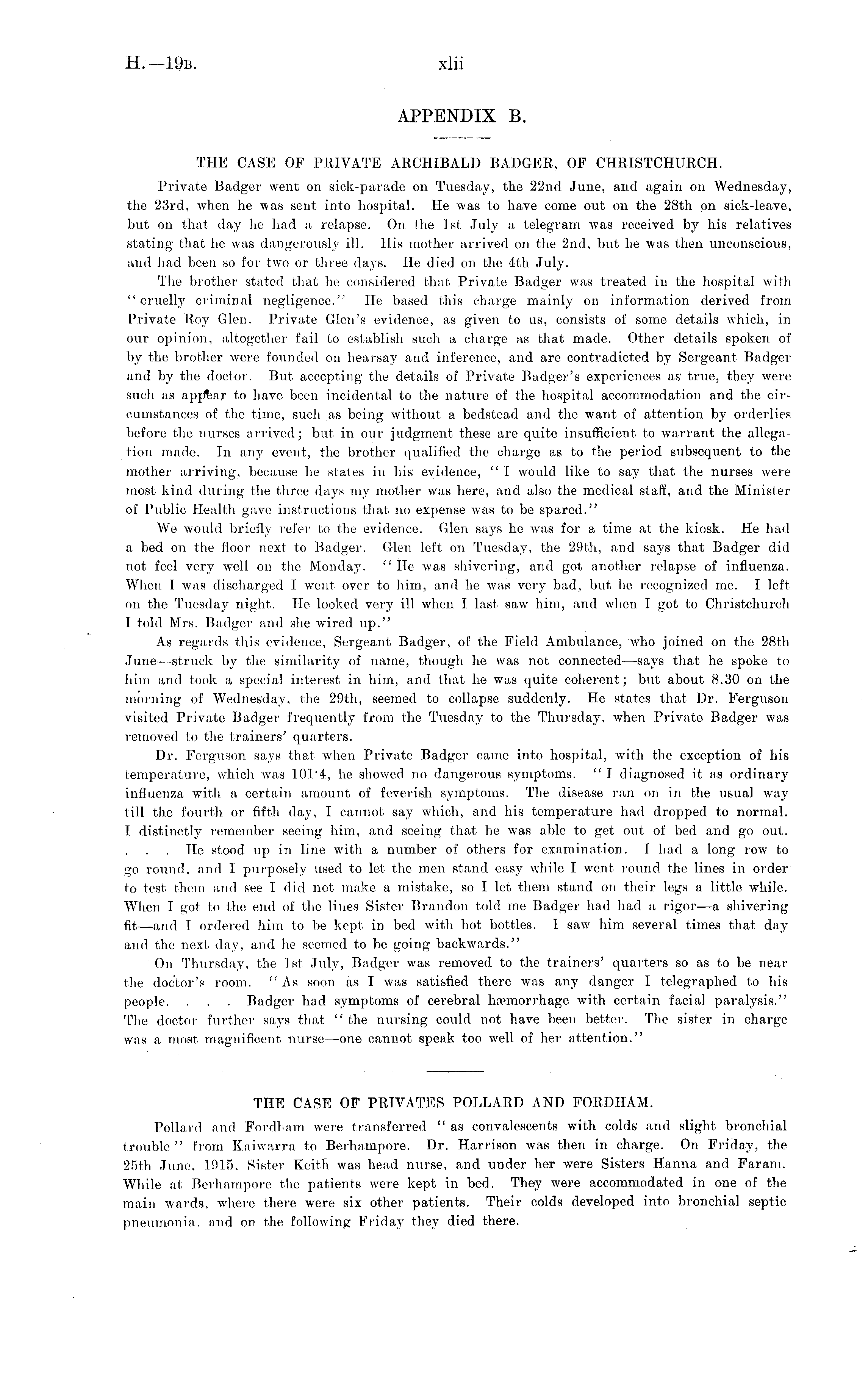 APPENDIX B. THE CASE OF PRIVATE ARCHIBALD BADGER, OF CHRISTCHURCH. Private Badger went on sick-parade on Tuesday, the 22nd June, and again on Wednesday, the 23rd, when he was sent into hospital. He was to have come out on the 28th on sick-leave, but on that day he had a relapse. On. the Ist July a telegram was received by his relatives stating that he was dangerously ill. His mother arrived on the 2nd, but he was then unconscious, and had been so for two or three days. He died on the 4th July. The brother stated that he considered that Private Badger was treated in the hospital with "cruelly criminal negligence." He based this charge mainly on information derived from Private Roy Glen. Private Glen's evidence, as given to us, consists of some details which, in our opinion, altogether fail to establish such a charge as that made. Other details spoken of by the brother were founded on hearsay and inference, and are contradicted by Sergeant Badger and by the doctor. But accepting the details of Private Badger's experiences as true, they were such as appear to have been incidental to the nature of the hospital accommodation and the circumstances of the time, such as being without, a bedstead and the want of attention by orderlies before the nurses arrived; but in our judgment these are quite insufficient to warrant the allegation made. In any event, the brother qualified the charge as to the period subsequent to the mother arriving, because he states in his evidence, " I would like to say that the nurses were most kind during the three days my mother was here, and also the medical staff, and the Minister of Public Health gave instructions that no expense was to be spared." We would briefly refer to the evidence. Olen says he was for a time at the kiosk. He had a bed on the floor next to Badger. Glen left on Tuesday, the 29th, and says that Badger did not feel very well on the Monday. "He was shivering, and got another relapse of influenza. When I was discharged I went over to him, and he was very bad, but he recognized me. I left on the Tuesday night. He looked very ill when I last saw him, and when I got to Christchurch I told Mrs. Badger and she wired up." As regards this evidence, Sergeant Badger, of the Field Ambulance, who joined on the 28th June—struck by the similarity of name, though he was not connected—says that he spoke to him and took a special interest in him, and that he was quite coherent; but about 8.30 on the morning of Wednesday, the 29th, seemed to collapse suddenly. He states that Dr. Ferguson visited Private Badger frequently from the Tuesday to the Thursday, when Private Badger was removed to the trainers' quarters. Dr. Ferguson says that when Private Badger came into hospital, with the exception of his temperature, which was 1014, he showed no dangerous symptoms. " I diagnosed it as ordinary influenza with a certain amount of feverish symptoms. The disease ran on in the usual way till the fourth or fifth day, I cannot say which, and his temperature had dropped to normal. I distinctly remember seeing him, and seeing that he was able to get out of bed and go out. He stood up in line with a number of others for examination. I had a long row to go round, and I purposely used to let the men stand easy while I went round the lines in order to test them and see I did not make a mistake, so I let them stand on their legs a little while. When I got to the end of the lines Sister Brandon told me Badger had had a rigor—a shivering fit—and I ordered him to be kept in bed with hot bottles. I saw him several times that day and the next day, and he seemed to be going backwards." On Thursday, the Ist July, Badger was removed to the trainers' quarters so as to be near the doctor's room. "As soon as I was satisfied there was any danger I telegraphed to his people. . . . Badger had symptoms of cerebral haemorrhage with certain facial paralysis." The doctor further says that " the nursing could not have been better. The sister in charge was a most magnificent nurse—one cannot speak too well of her attention."