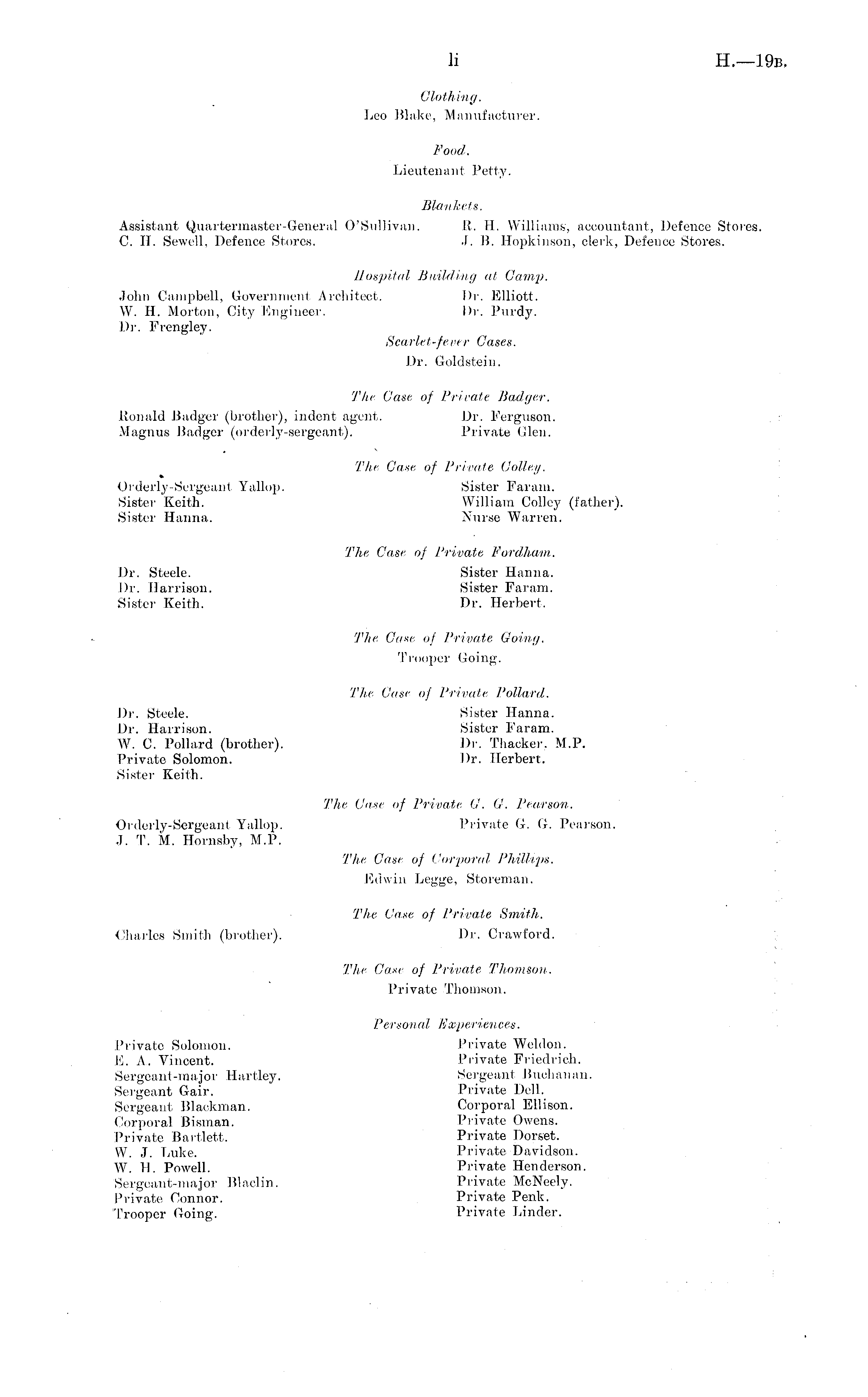 Clothing. Leo Blake, Manufacturer. Food,. Lieutenant Petty. Blankets. Assistant Quartermaster-General O'Sullivan. R. H. Williams, accountant, Defence Stores C. 11. Sewell, Defence Stores. .1. B. Hopkinson, clerk, Defence Stores. Hospital Building at Gamp. John Campbell, Government Architect. Dr. Elliott. W. H. Morton, City Engineer. Dr. Purdy. Dr. Frengley. Scarlet-fever Gases. Dr. Goldstein. The Case of Private Badger. Ronald Badger (brother), indent agent. Dr. Ferguson. Magnus Badger (orderly-sergeant). Private Glen. The Case of Private Colley. Orderly-Sergeant Yallop. Sister Faram. Sister Keith. William Colley (father). Sister Hanna. Nurse Warren. The Case of Private Fordham. Dr. Steele. Sister Hanna. Dr. Harrison. Sister Faram. Sister Keith. Dr. Herbert. The Gase of Private Going. Trooper Going. The Gase of Private Pollard. Dr. Steele. Sister Hanna. Dr. Harrison. Sister Faram. W. C. Pollard (brother). Dr. Thacker, M.P. Private Solomon. Dr. Herbert. Sister Keith. The Case of Private G. G. Pearson. Orderly-Sergeant Yallop. Private G. G. Pearson. J. T. M. Hornsby, M.P. The Case of Corporal Phillips. Edwin Legge, Storeman. The Case of Private Smith. Charles Smith (brother). Dr. Crawford. The Case of Private Thomson. Private Thomson. Personal Experiences. Private Solomon. Private Weldon. E. A. Vincent. Private Friedrich. Sergeant-major Hartley. Sergeant Buchanan. Sergeant Gair. Private Dell. Sergeant Blackman. Corporal Ellison. Corporal Bisman. Private Owens. Private Bartlett. Private Dorset. W. J. Luke. Private Davidson. W. H. Powell. Private Henderson. Sergeant-major Blaclin. Private McNccly. Private Connor. Private Penk. Trooper Going. Private Linder.