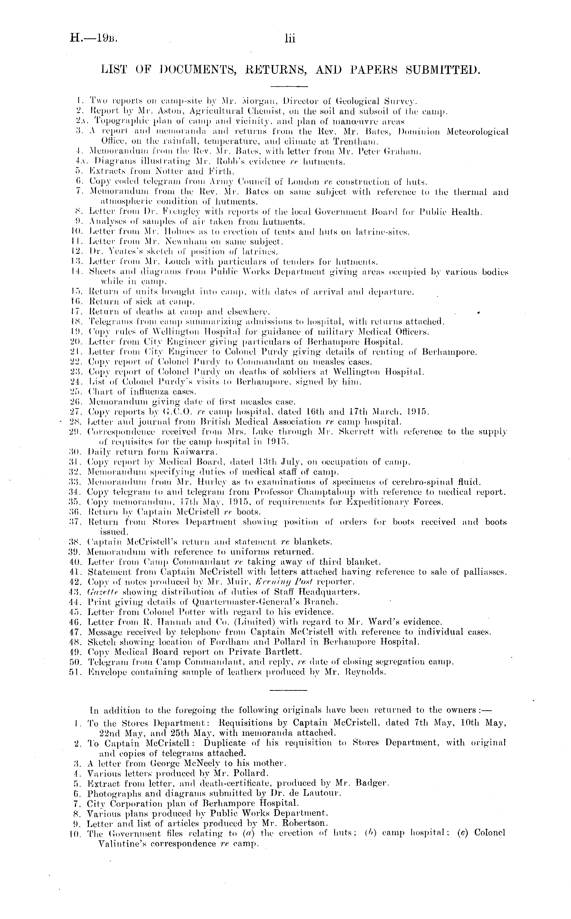 LIST OF DOCUMENTS, RETURNS, AND PAPERS SUBMITTED. 1. Two reports on camp-site by Mr. Morgan, Director of Geological Survey. 2. Report by Mr. Aston, Agricultural Chemist, on the soil and subsoil of the camp. 2a. Topographic plan of camp and vicinity, and plan of manoeuvre areas 3. A icporl and memoranda and returns from the Rev. Mr. Bates, Dominion Meteorological Office, on the rainfall, temperature, and climate at Trentham. 4. Memorandum from the Rev. Mr. Bates, with letter from Mr. Peter Graham. 4a. Diagrams illustrating Mr. Robb's evidence re hutments. 5. Extracts from Notter and Firth. 6. Copy coded telegram from Army Council of London re construction of huts. 7. Memorandum from the Rev. Mr. Bates on same subject with reference to the thermal and atmospheric condition of hutments. 8. Letter from Dr. Fiengley with reports of the local Government Board for Public Health. 9. Analyses of samples of air taken from hutments. 10. Letter from Mr. Holmes as to erection of tents and huts on latrine-sites, 11. Letter from Mr. Newnham on same subject. 12. Dr. Veates's sketch oi position of latrines. 13. Letter from Mr. Loueh with particulars of tenders for hutments. 14. Sheets and diagrams from Public Works Department giving areas occupied by various bodies while in camp. 15. Return of units brought into camp, with dates of arrival and departure. 16. Return of sick at camp. 17. Return of deaths at camp and elsewhere. 18. Telegrams from camp summarizing admissions to hospital, with returns attached. 19. Copy rules of Wellington Hospital for guidance of military Medical Officers. 20. Letter from City Engineer giving particulars of Berhampore Hospital. 21. Letter from City Engineer to Colonel Purely giving details of renting of Berhampore. 22. Copy report of Colonel Purdy to Commandant on measles' cases. 23. Copy report of Colonel Purdy on deaths of soldiers at Wellington Hospital. 24. List of Colonel Purdy's visits Io Berhampore, signed by him. 25. Chart of influenza cases. 26. Memorandum giving date of first measles case. 27. Copy reports by G.C.O. re camp hospital, dated 16th and 17th March, 1915. 28. Letter and journal from British Medical Association re camp hospital. 29. Correspondence received from Mrs. Luke through Mr. Skerrett with reference to the supply of requisites for the camp hospital in 1(115. ■'ill. Daily return form Kaiwarra. 31. Copy report by Medical Board, dated 13th July, on occupation of camp. 32. Memorandum specifying duties of medical staff of camp. 33. Memorandum from Mr. Hurley as to examinations of specimens of cerebro-spinal fluid. 34. Copy telegram to and telegram from Professor Champtaloup with reference to medical report. 35. Copy memorandum, 17th May, 1915, of requirements for Expeditionary Forces. 36. Return by Captain McCristell re boots. 37. Return from Stores Department showing position of orders for boots received and boots issued. 38. Captain McCristell's return and statement re blankets'. 39. Memorandum with reference to uniforms returned. 40. Letter from Camp Commandant re taking away of third blanket. 41. Statement from Captain. McCristell with letters attached having reference to sale of palliasses. 42. Copy of notes produced by Mr. Muir, Keening Post reporter. 43. Gazette showing distribution of duties of Staff Headquarters. 44. Print giving details of Quartermaster-General's Branch. 45. Letter from Colonel Potter with regard to his evidence. 46. Letter from R. Hannah and Co. (Limited) with regard to Mr. Ward's evidence. 47. Message received by telephone from Captain McCristell with reference to individual cases. 48. Sketch showing location of Fordham and Pollard in Berhampore Hospital. 49. Copy Medical Board report on Private Bartlett. 50. Telegram from Camp Commandant, and reply, re date of closing segregation camp. 51. Envelope containing sample of leathers produced by Mr. Reynolds. In addition to the foregoing the following originals have been returned to the owners : — 1. To the Stores Department: Requisitions by Captain McCristell, dated 7th May, 10th May, 22nd May, and 25th May, with memoranda attached. 2. I'o Captain McCristell: Duplicate of his requisition to Stores Department, with original and copies of telegrams attached. 3. A letter from George McNeely to his mother. 4. Various letters produced by Mr. Pollard. 5. Extract from letter, and death-certificate, produced by Mr. Badger. 6. Photographs and diagrams submitted by Dr. de Lautour. 7. City Corporation plan of Berhampore Hospital. 8. Various plans produced by Public Works Department. 9. Letter and list of articles produced by Mr. Robertson. 10. The Government files relating to (a) the erection of huts; (b) camp hospital; (c) Colonel Valintine's correspondence re camp.