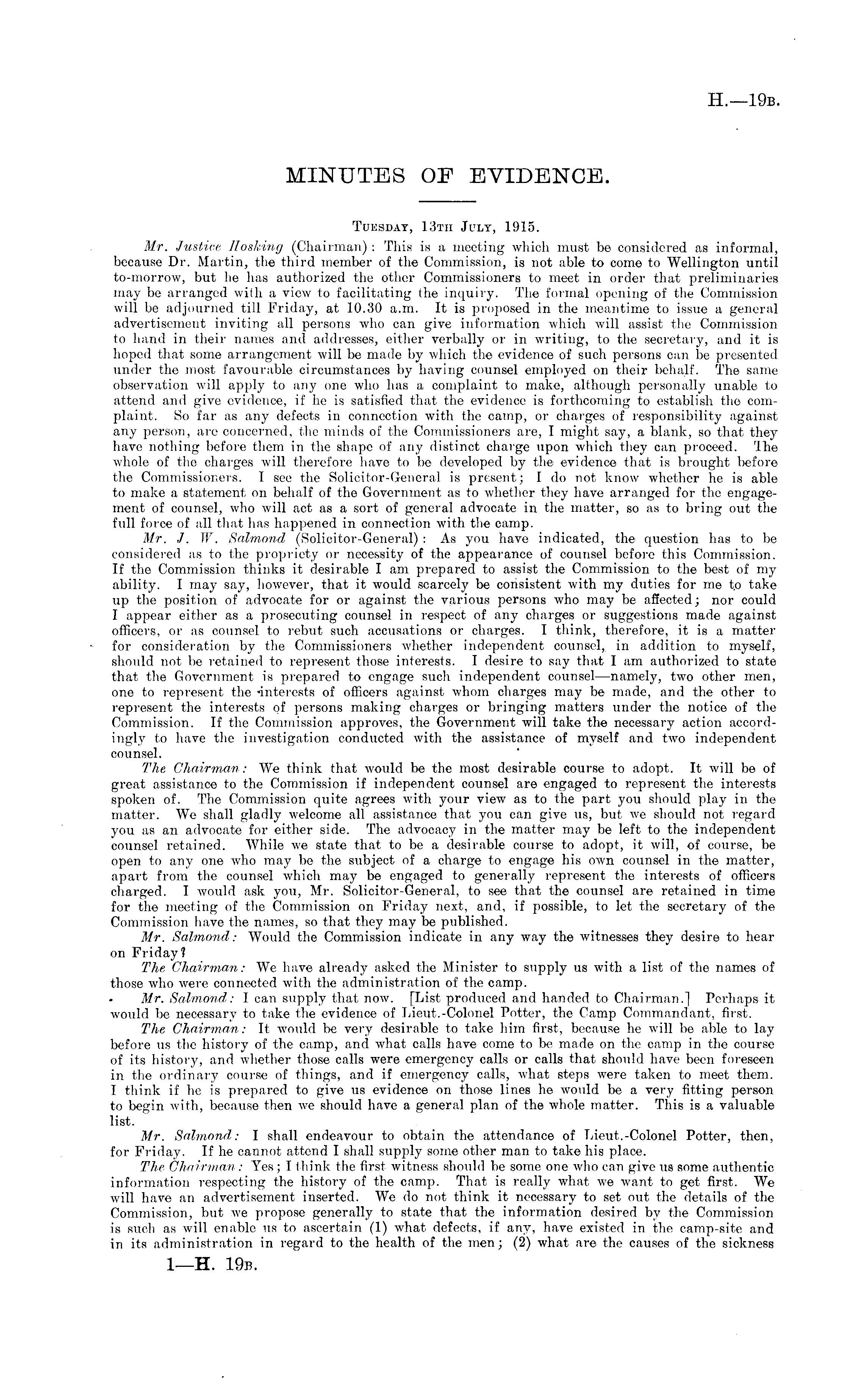 MINUTES OF EVIDENCE. Tuesday, 13th July, 1915. Mr. Justice Hosking (Chairman) : This is a meeting which must be considered as informal, because Dr. Martin, the third member of the Commission, is not able to come to Wellington until to-morrow, but he has authorized the other Commissioners to meet in order that preliminaries may be arranged with a view to facilitating the inquiry. The formal opening of the Commission will be adjourned till Friday, at 10.30 a.m. It is proposed in the meantime to issue a general advertisement inviting all persons who can give information which will assist the Commission to hand in their names and addresses, either verbally or in writing, to the secretary, and it is hoped that some arrangement will be made by which the evidence of such persons can be presented under the most favourable circumstances by having counsel employed on their behalf. The same observation will apply to any one who has a complaint to make, although personally unable to attend and give evidence, if he is satisfied that the evidence is forthcoming to establish the complaint. So far as any defects in connection with the camp, or charges of responsibility against any person, are concerned, the minds of the Commissioners are, I might say, a blank, so that they have nothing before them in the shape of any distinct charge upon which they can proceed. Ihe whole of the charges will therefore have to be developed by the evidence that is brought before the Commissioners. I see the Solicitor-General is present; I do not know whether he is able to make a statement on behalf of the Government as to whether they have arranged for the engagement of counsel, who will act as a sort of general advocate in the matter, so as to bring out the full force of all that has happened in connection with the camp. Mr. J. W. Salmond (Solicitor-General) :As you have indicated, the question has to be considered as to the propriety or necessity of the appearance of counsel before this Commission. If the Commission thinks it desirable I am prepared to assist the Commission to the best of my ability. I may say, however, that it would scarcely be consistent with my duties for me to take up the position of advocate for or against the various persons who may be affected; nor could I appear either as a prosecuting counsel in respect of any charges or suggestions made against officers, or as counsel to rebut such accusations or charges. I think, therefore, it is a matter for consideration by the Commissioners whether independent counsel, in addition to myself, should not be retained to represent those interests. I desire to say that lam authorized to state that the Government is prepared to engage such independent counsel —namely, two other men, one to represent the "interests of officers against whom charges may be made, and the other to represent the interests of persons making charges or bringing matters under the notice of the Commission. If the Commission approves, the Government will take the necessary action accordingly to have the investigation conducted with the assistance of myself and two independent counsel. The Chairman: We think that would be the most desirable course to adopt. It will be of great assistance to the Commission if independent counsel are engaged to represent the interests spoken of. The Commission quite agrees with your view as to the part you should play in the matter. We shall gladly welcome all assistance that you can give us, but we should not regard you as an advocate for either side. The advocacy in the matter may be left to the independent counsel retained. While we state that to be a desirable course to adopt, it will, of course, be open to any one who may bo the subject of a charge to engage his own counsel in the matter, apart from the counsel which may be engaged to generally represent the interests of officers charged. I would ask you, Mr. Solicitor-General, to see that the counsel are retained in time for the meeting of the Commission on Friday next, and, if possible, to let the secretary of the Commission have the names, so that they may be published. Mr. Salmond: Would the Commission indicate in any way the witnesses they desire to hear on Friday? The Chairman: We have already asked the Minister to supply us with a list of the names of those who were connected with the administration of the camp. • Mr. Salmond: I can supply that now. [List produced and handed to Chairman.] Perhaps it would be necessary to take the evidence of Lieut.-Colonel Potter, the Camp Commandant, first. The Chairman: It would be very desirable to take him first, because he will be able to lay before us the history of the camp, and what calls have come to be made on the camp in the course of its history, and whether those calls were emergency calls or calls that should have been foreseen in the ordinary course of things, and if emergency calls, what steps were taken to meet them. I think if he is prepared to give us evidence on those lines he would be a very fitting person to begin with, because then we should have a general plan of the whole matter. This is a valuable list. Mr. Salmond: I shall endeavour to obtain the attendance of Lieut.-Colonel Potter, then, for Friday. If he cannot attend I shall supply some other man to take his place. The. Chairman: Yes; I think the first witness should be some one who can give us some authentic information respecting the history of the camp. That is really what we want to get first. We will have an advertisement inserted. We do not think it necessary to set out the details of the Commission, but we propose generally to state that the information desired by the Commission is such as will enable us to ascertain (1) what defects, if any, have existed in the camp-site and in its administration in regard to the health of the men; (2) what are the causes of the sickness