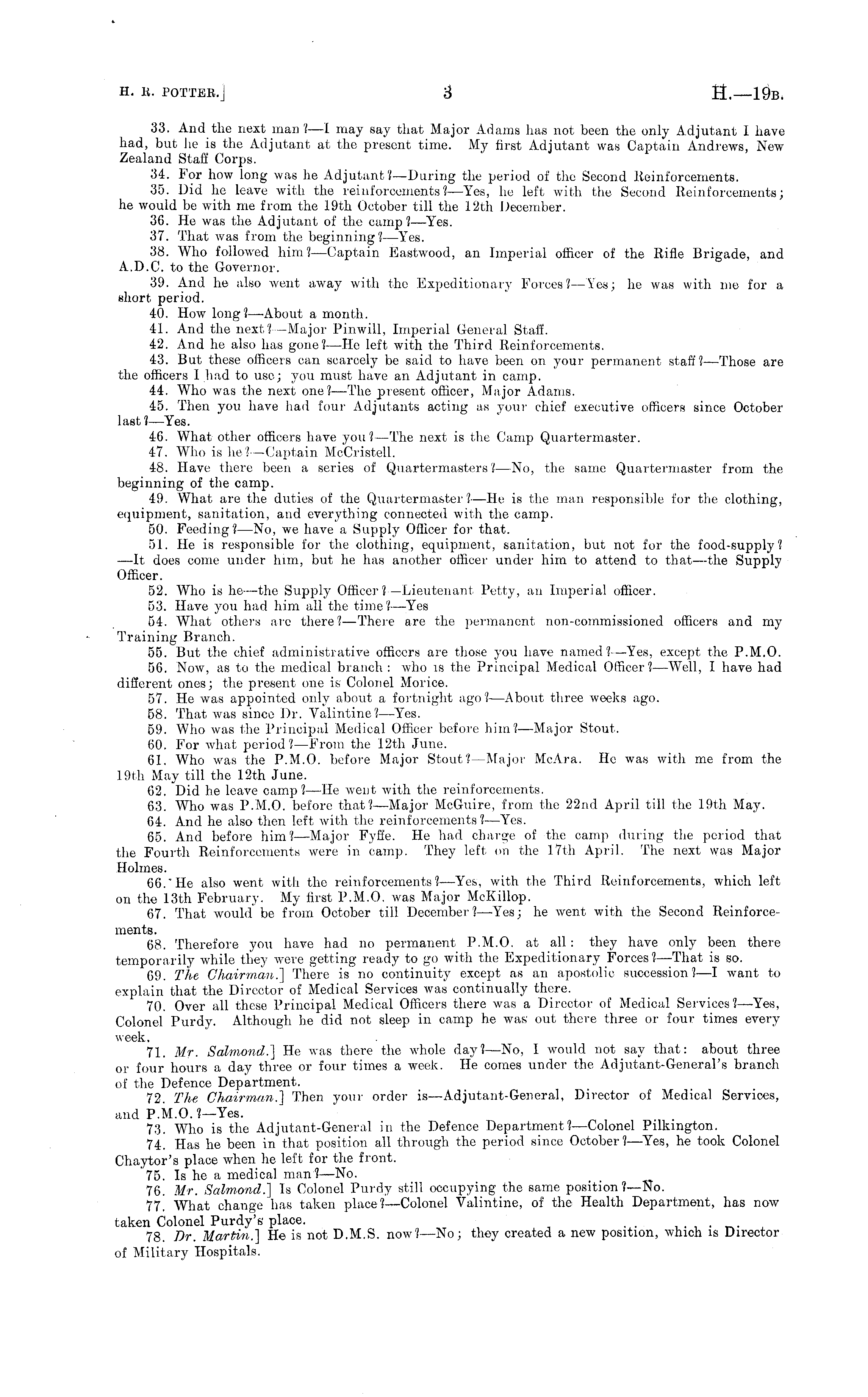 33. And the next man ?—I may say that Major Adams has not been the only Adjutant I have had, but he is the Adjutant at the present time. My first Adjutant was Captain Andrews, New Zealand Staff Corps. 34. For how long was he Adjutant?— During the period of the Second Reinforcements. 35. Did he leave with the reinforcements?— Yes, he left with the Second Reinforcements; he would be with me from the 19th October till the 12th December. 36. He was the Adjutant of the camp?— Yes. 37. That was from the beginning?— Yes. 38. Who followed him? —Captain Eastwood, an Imperial officer of the Rifle Brigade, and A.D.C. to the Governor. 39. And he also went away with the Expeditionary Forces?— Yes; he was with me for a short period. 40. How long?— About a month. 41. And the next? —Major Pinwill, Imperial General Staff. 42. And he also has gone?—He left with the Third Reinforcements. 43. But these officers can scarcely be said to have been on your permanent staff?— Those are the officers I had to use; you must have an Adjutant in camp. 44. Who was the next one?— The present officer, Major Adams. 45. Then you have had four Adjutants acting as your chief executive officers since October last?— Yes. 46. What other officers have you?— The next is the Camp Quartermaster. 47. Who is lie?— Captain McCristell. 48. Have there been a series of Quartermasters? —No, the same Quartermaster from the beginning of the camp. 49. What are the duties of the Quartermaster? —He is the man responsible for the clothing, equipment, sanitation, and everything connected with the camp. 50. Feeding ?—No, we have a Supply Officer for that. 51. He is responsible for the clothing, equipment, sanitation, but not for the food-supply? —It does come under him, but he has another officer under him to attend to that—the Supply Officer. 52. Who is he—the Supply Officer? —Lieutenant Petty, an Imperial officer. 53. Have you had him all the time?— Yes 54. What others are there? —There are the permanent non-commissioned officers and my Training Branch. 55. But the chief administrative officers are those you have named?— Yes, except the P.M.O. 56. Now, as to the medical branch : who is the Principal Medical Officer?— Well, I have had different ones; the present one is Colonel Morice. 57. He was appointed only about a fortnight ago?— About three weeks ago. 58. That was since Dr. Valintine? —Yes. 59. Who was the Principal Medical Officer before him?— Major Stout. 60. For what period? —From the 12th June. 61. Who was the P.M.O. before Major Stout? —Major McAra. He was with me from the 19th May till the 12th June. 62. Did he leave camp?—He went with the reinforcements. 63. Who was P.M.O. before that?— Major McGuire, from the 22nd April till the 19th May. 64. And he also then left with the reinforcements?— Yes. 65. And before him? —Major Fyfie. He had charge of the camp during the period that the Fourth Reinforcements were in camp. They left on the 17th April. The next was Major Holmes. 66.* He also went with the reinforcements? —Yes, with the Third Reinforcements, which left on the 13th February. My first P.M.O. was Major McKillop. 67. That would be from October till December? —Yes; he went with the Second Reinforcements. 68. Therefore you have had no permanent P.M.O. at all : they have only been there temporarily while they were getting ready to go with the Expeditionary Forces ?—That is so. 69. The Chairman.] There is no continuity except as an apostolic, succession? —I want to explain that the Director of Medical Services was continually there. 70. Over all these Principal Medical Officers there was a Director of Medical Services?—Yevs, Colonel Purdy. Although he did not sleep in camp he was out there three or four times every week. 71. Mr- Salmond.] He was there the whole day?—No, I would not say that: about three or four hours a day three or four times a week. He comes under the Adjutant-General's branch of the Defence Department. 72. The Chairman.] Then your order is—Adjutant-General, Director of Medical Services, and P.M.O.?—Yes. 73. Who is the Adjutant-General in the Defence Department?— Colonel Pilkmgton. 74. Has he been in that position all through the period since October? —Yes, he took Colonel Chaytor's place when he left for the front. 75. Is he a medical man?— No. 76. Mr. Salmond.] Is Colonel Purdy still occupying the same position?— No. 77. What change has taken place? —Colonel Valintine, of the Health Department, has now taken Colonel Purdy's place. ~,.-_. 78. Dr. Martin.] He is not D.M.S. now? —No; they created a new position, which is Director of Military Hospitals.